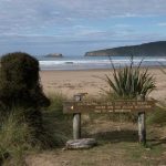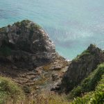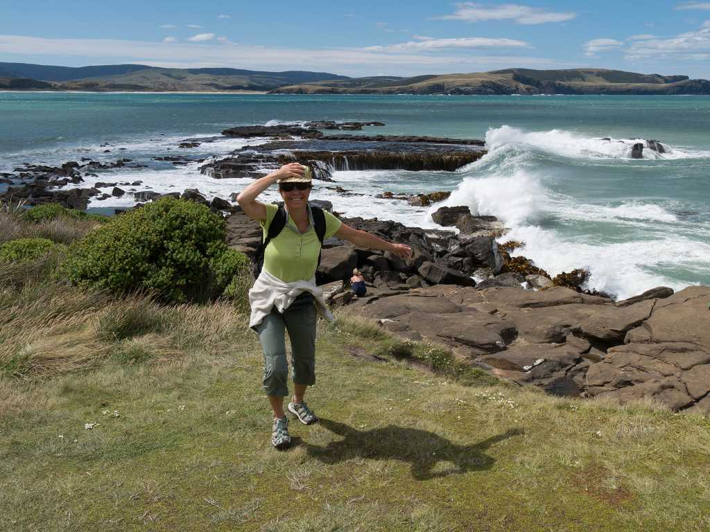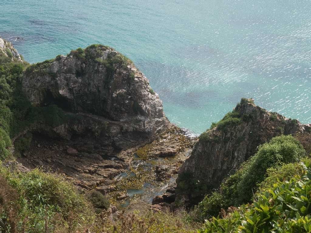 Die erste ist der „Monkey Island Beach“. Bei 13 Grad und rauher See haben wir kein Bedürfnis, hier zu baden. Aber den wegen Ebbe frei zugänglichen Weg zur winzigen Insel nimmt Thomas in Angriff. Ich kneife hier, weil ich keine nassen Schuhe beim Sprung über eine leicht überflutete Passage riskieren möchte. Zum Glück gibt es ja bei uns immer schöne Fotos…