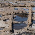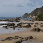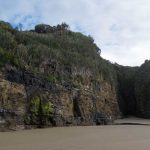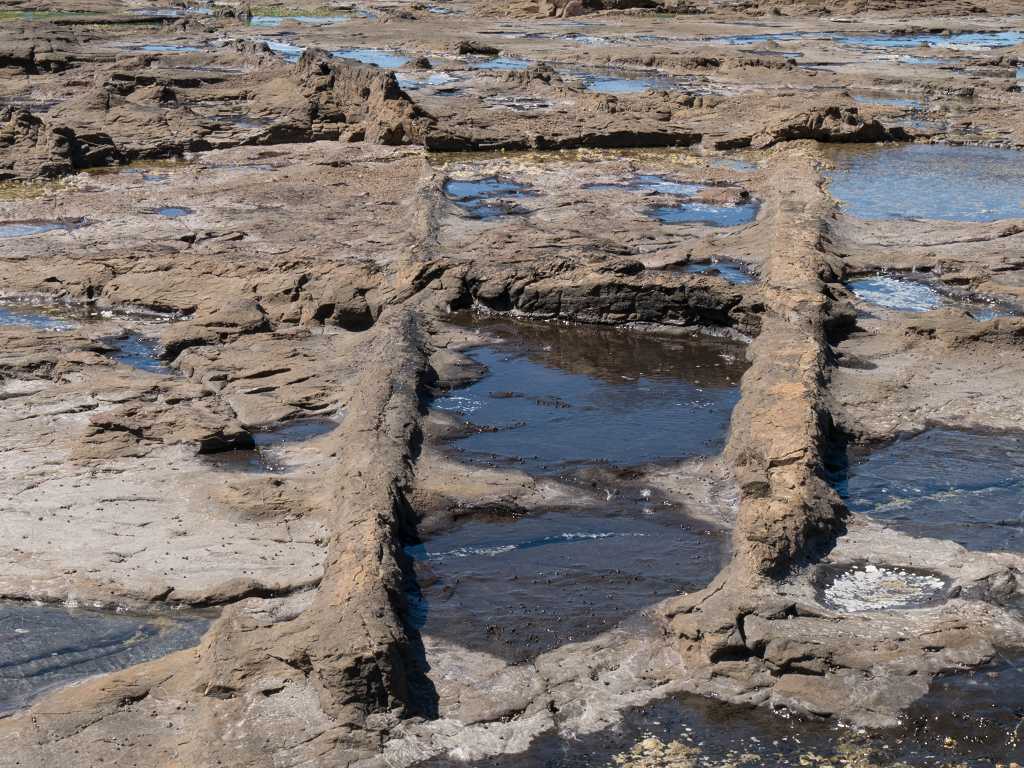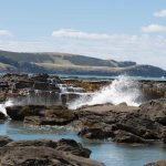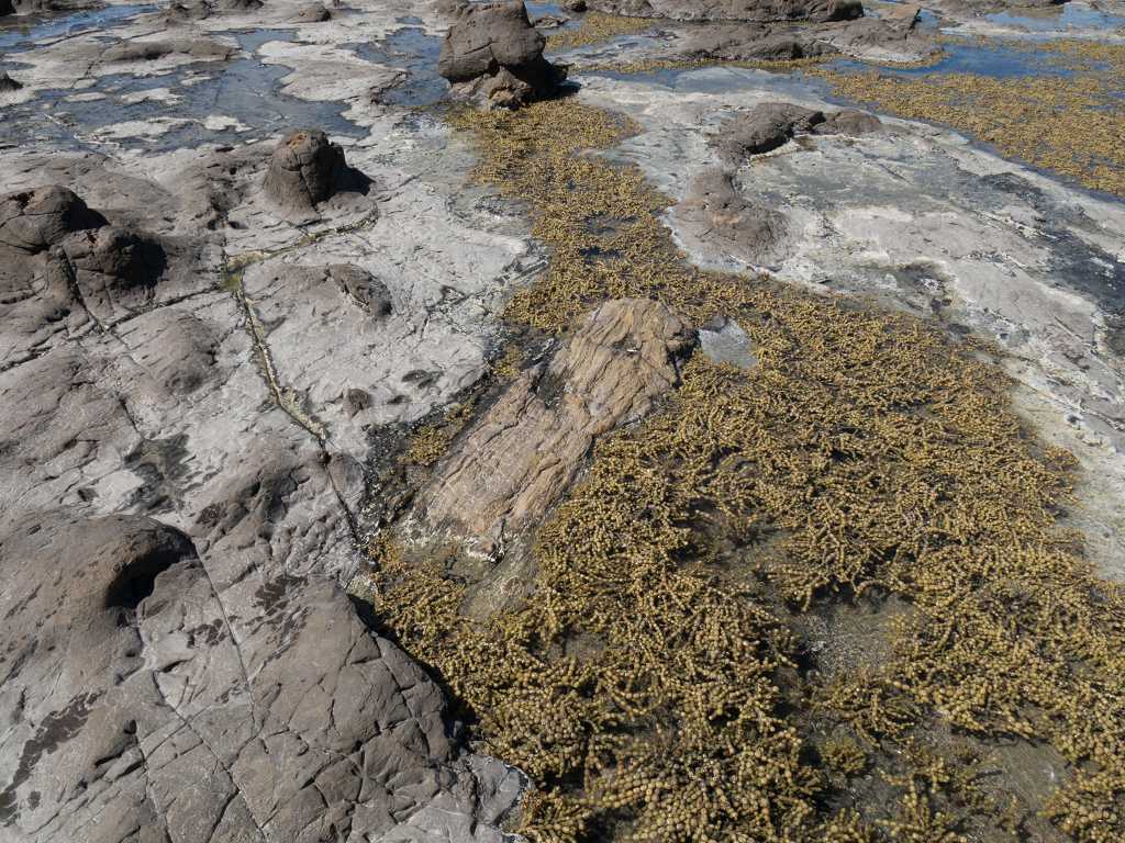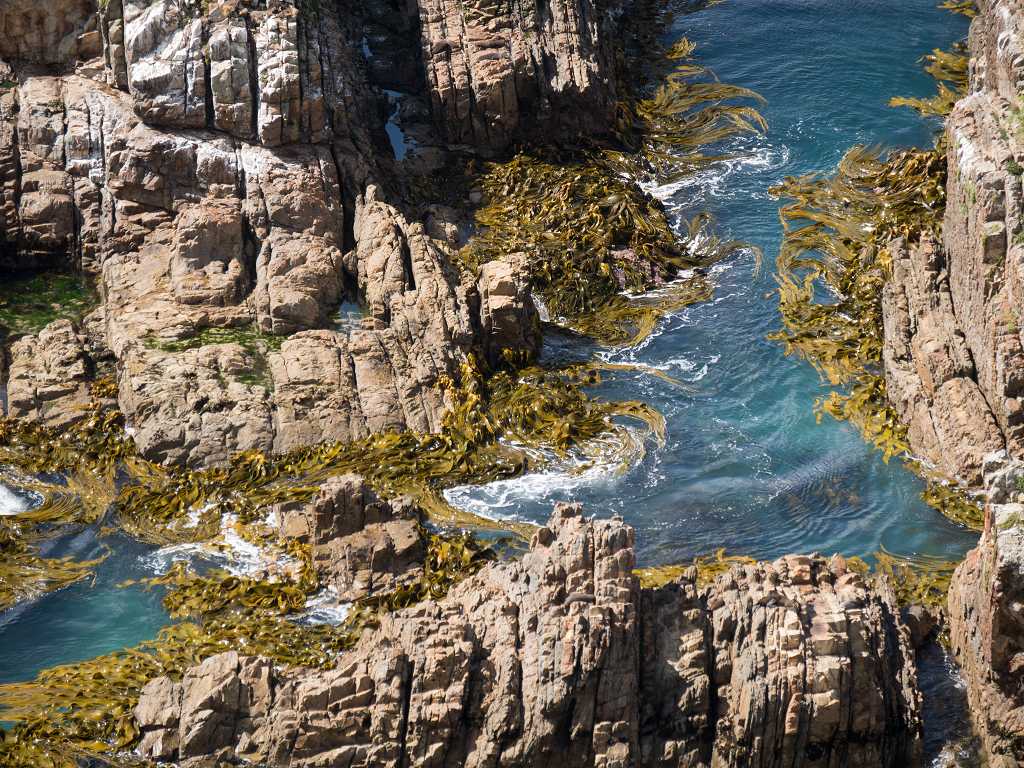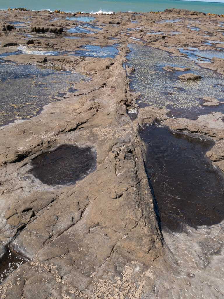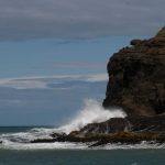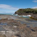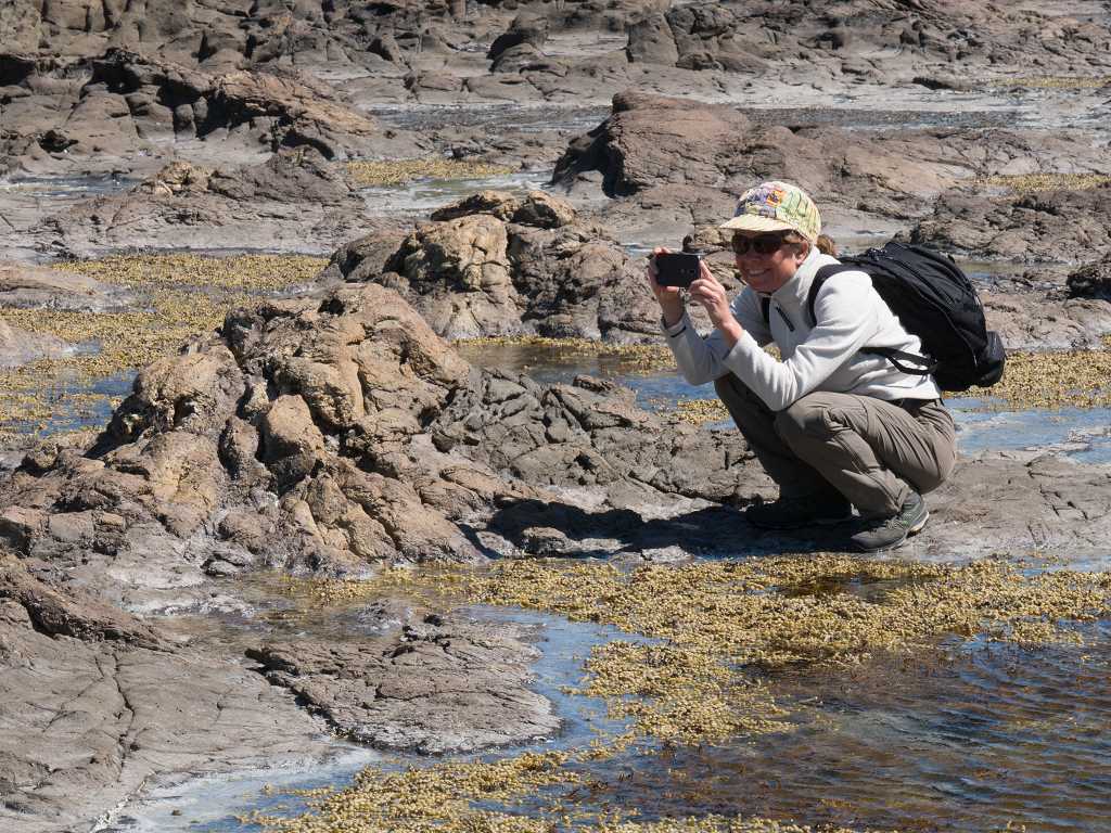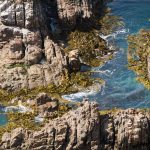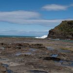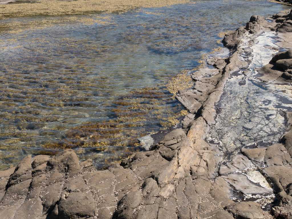 Die herankommende Flut und der starke Wind sorgen für ein gewaltiges Naturschauspiel, wenn die Wellen sich mit lautem Getöse an den Felsen brechen. Manche der glatten Felsen bilden lange tiefe Rinnen, die sich mit jeder Welle füllen und andere sind mit riesigen Schlingpflanzen bewachsen, die sich beim Hereinbrechen der Wassermassen hin und her bewegen.