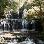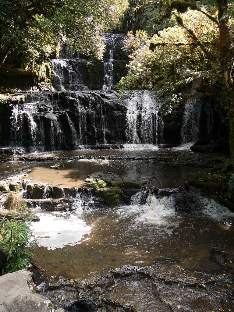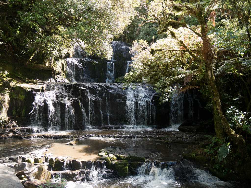 Der „Purakaunui River“ fällt in mehreren Kaskaden über eine Fallhöhe von nur 20 Metern, ist aber wunderschön anzusehen.