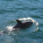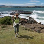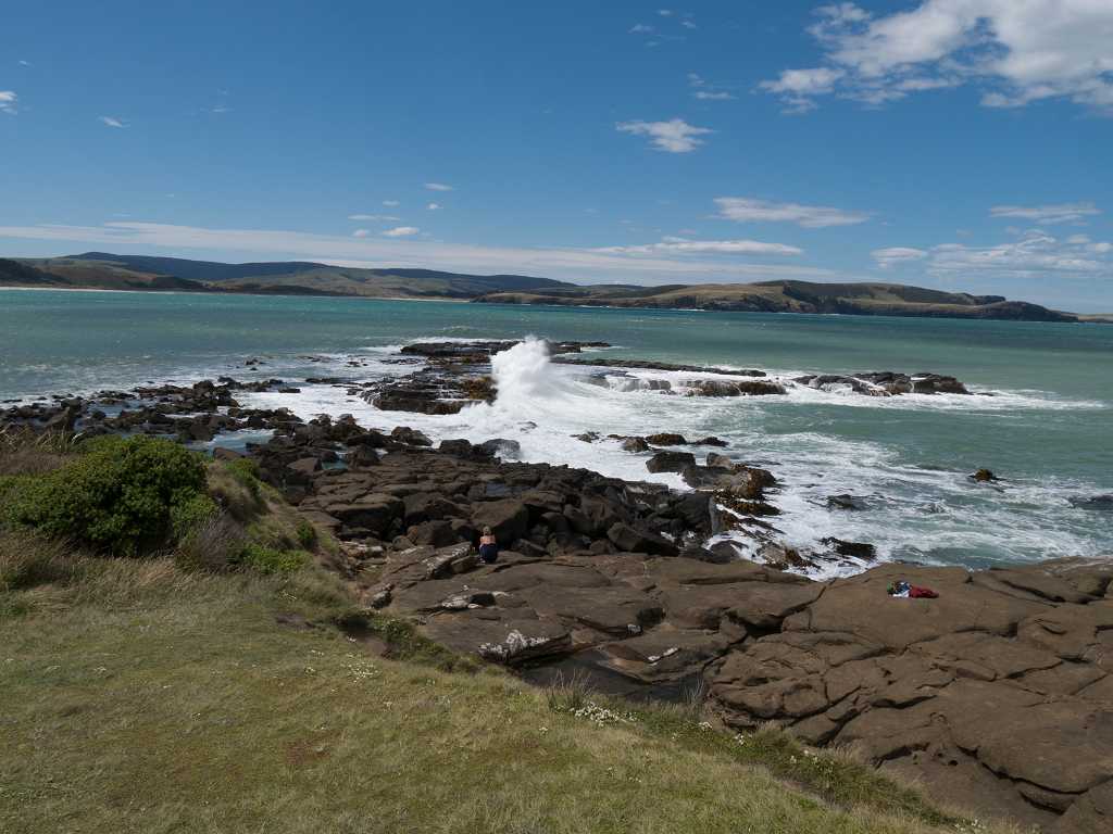 Nach einem kurzen Spaziergang zur „Porpoise Bay“ können wir von einem höheren Felsen weit entfernt im Meer ein Gruppe Delfine schwimmen sehen.