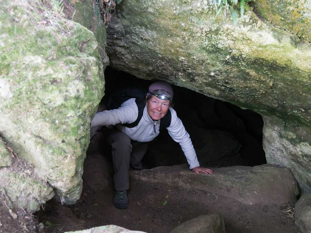 Die „Limestone Cave“ ist eine weitere Abwechslung auf unserem heutigen Weg. Sie liegt etwas abseits, schön einsam in Weideland versteckt. Mit unseren Stirnlampen können wir diese kleine aber stockfinste Höhle sicher durchstreifen und erreichen nach kurzer Zeit wieder das Tageslicht.