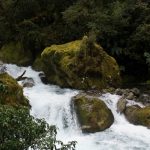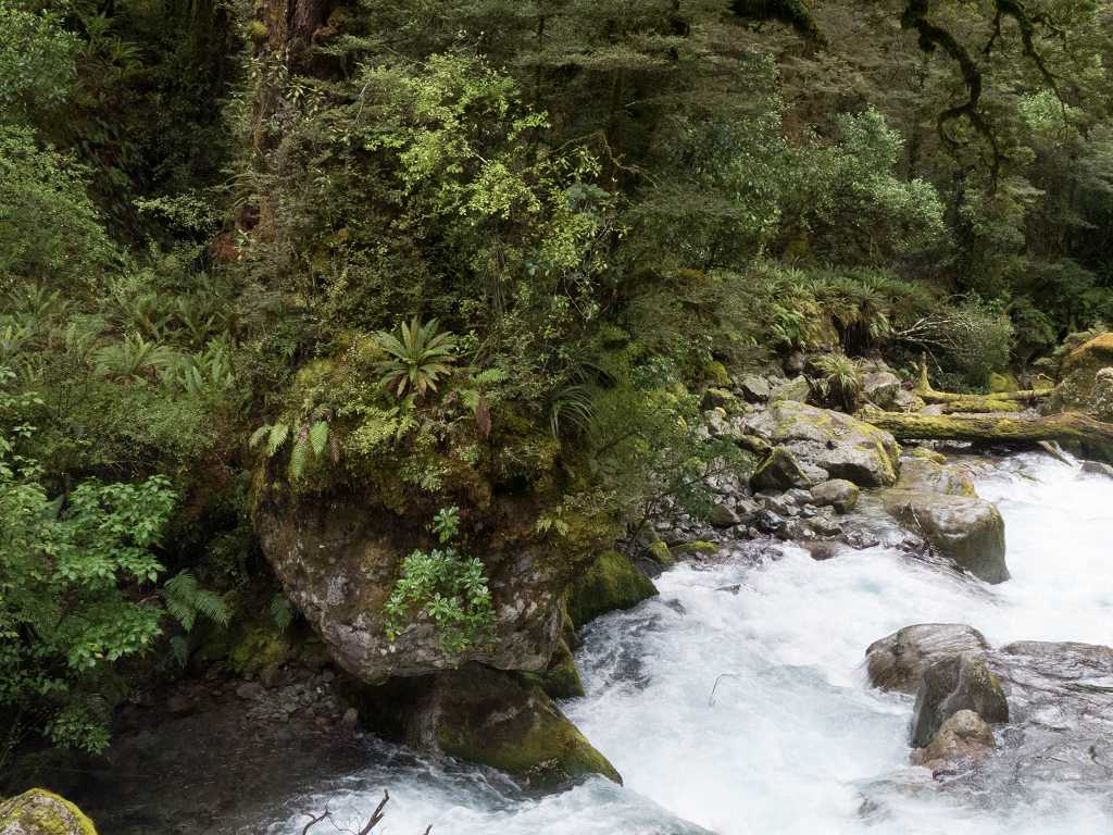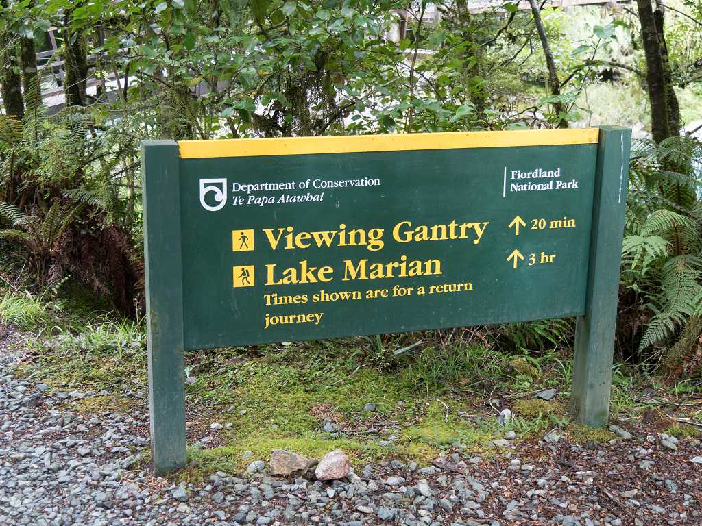 Wir steigen in unsere Wanderschuhe und starten zu einem dreistündigen Track zum „Lake Marian“. Über eine Hängebrücke gehen wir auf die andere „Riverside“, laufen über Kies und einige Holzstege etwa 10 Minuten bis zu den reißenden Stromschnellen des Flusses.