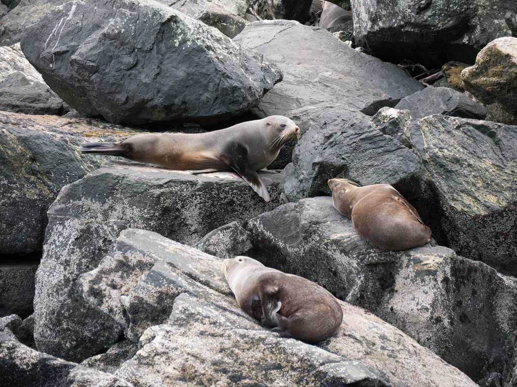 In der Nähe der „Fairy Falls“ hat sich eine Robbenkolonie angesiedelt. Hier kommen unserem zwei andere Schiffe zuvor, so dass wir zügig daran vorbei fahren und mit etwas Glück dadurch eine Delfingruppe zu beobachten bekommen. Was für ein tolles Erlebnis, den Tieren beim Schwimmen und springen zuzuschauen!