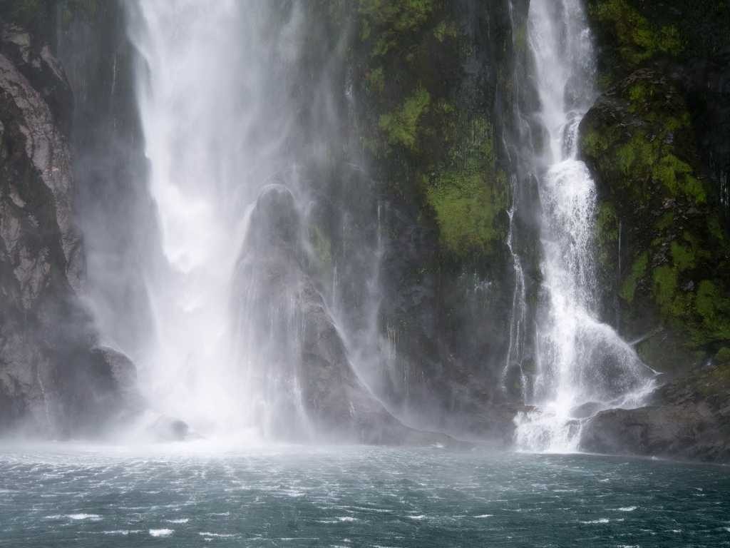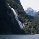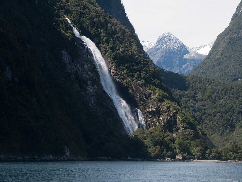Auf dem Rückweg kommen wir nochmals an zahlreichen Wasserfällen vorbei, z.B. am 155 Meter hohen „Stirling Falls“, wo das Wasser uns bis aufs Deck prasselt!
