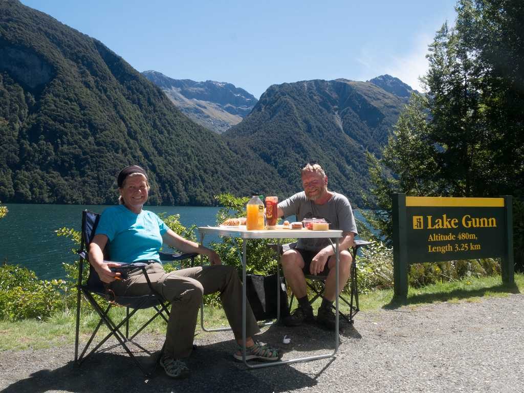 Am „Lake Gunn View“ holen wir unsere Campingstühle und den Tisch raus und machen Picknickpause direkt am See. Es dauert nur ein paar Minuten, da bekommen wir „Nachbarn“, die es uns gleich tun. Ein holländisches Ehepaar findet diesen Platz ebenfalls traumhaft schön.
