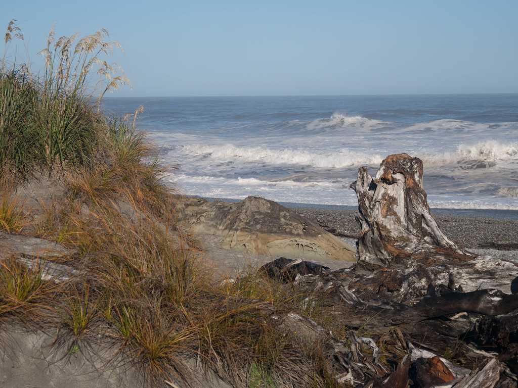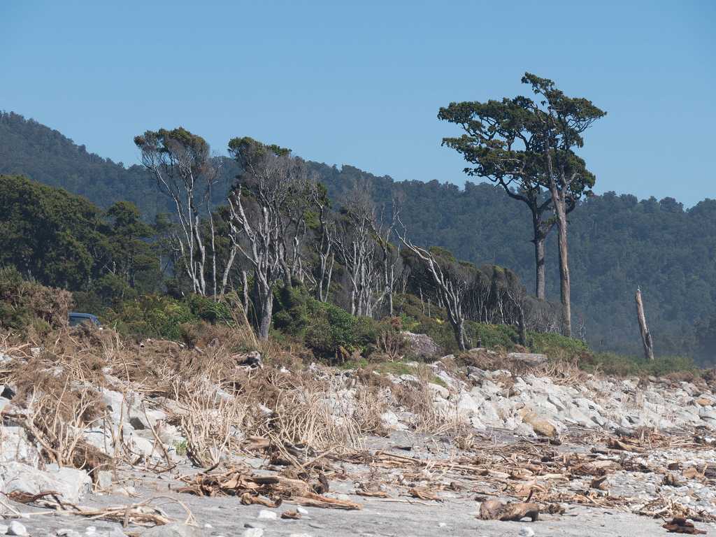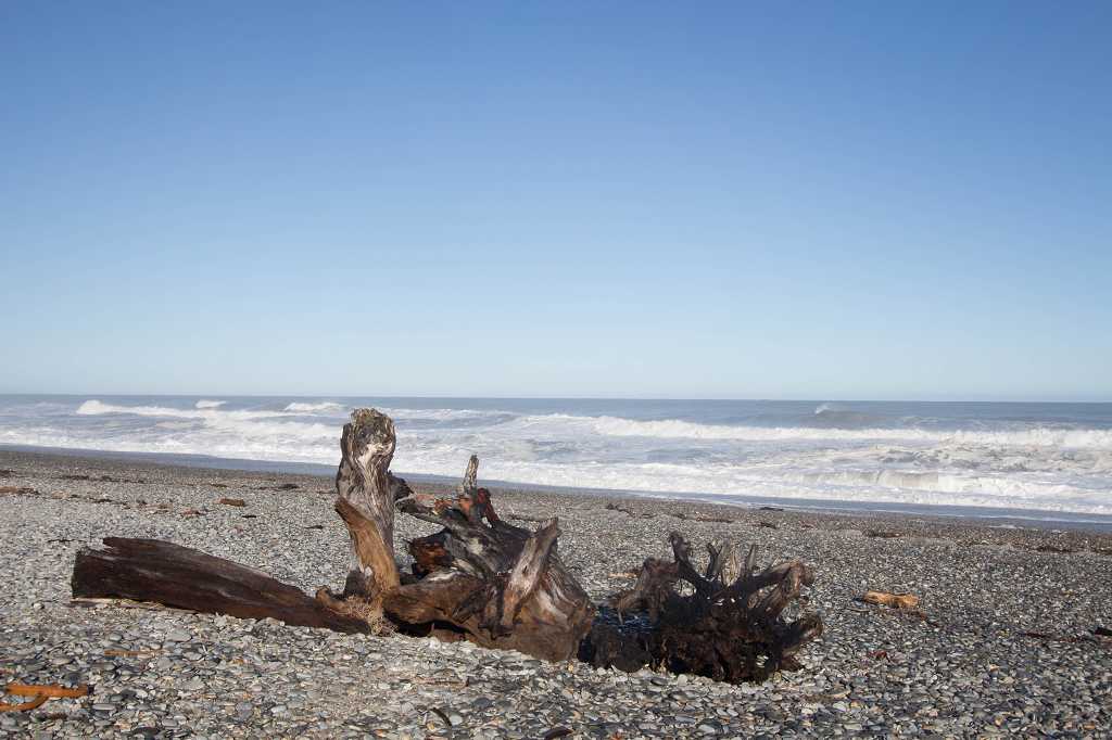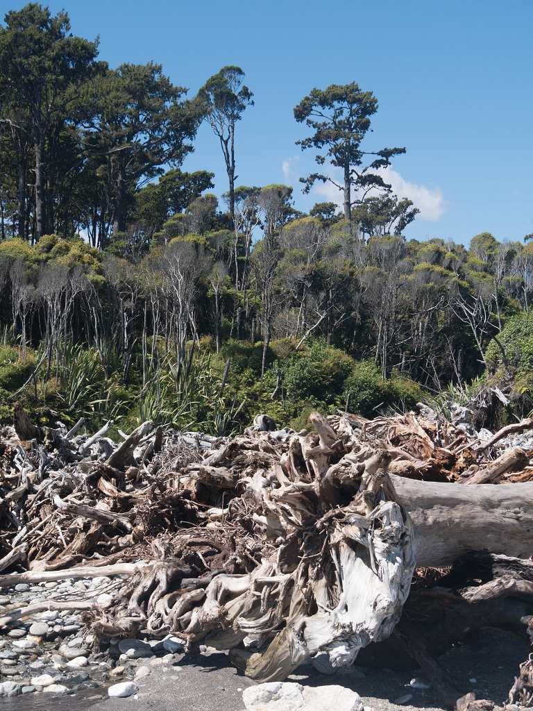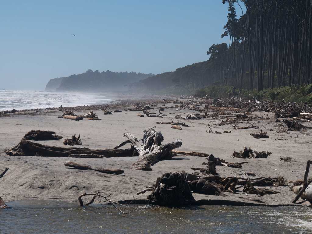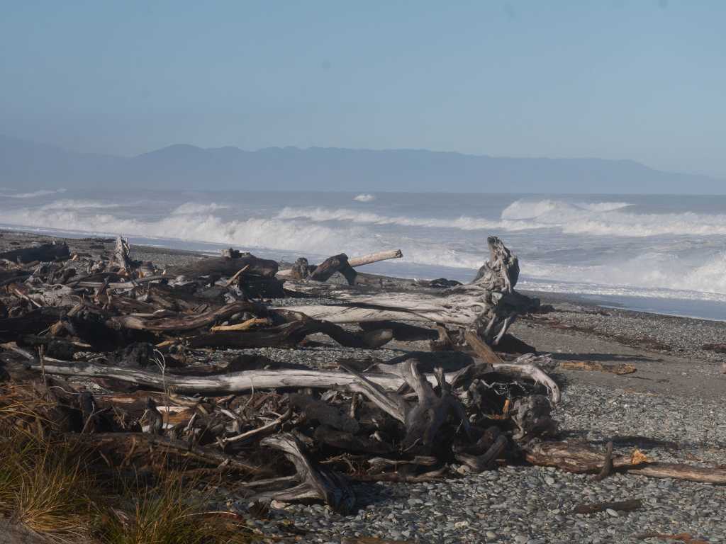 Danach geht es etwas landeinwärts, um aber 30 km später erneut auf die Küste zu treffen. Wir erreichen die Bruce Bay, die mit Treibholz übersät ist.