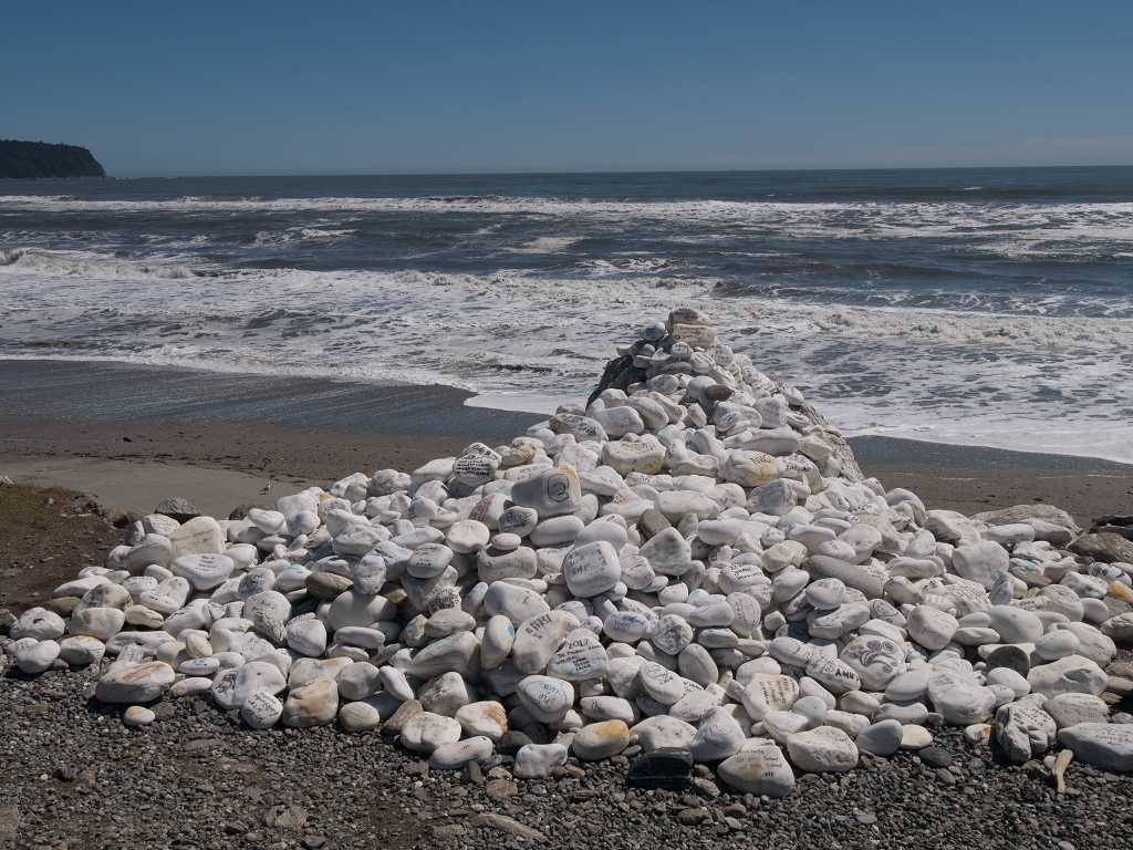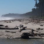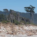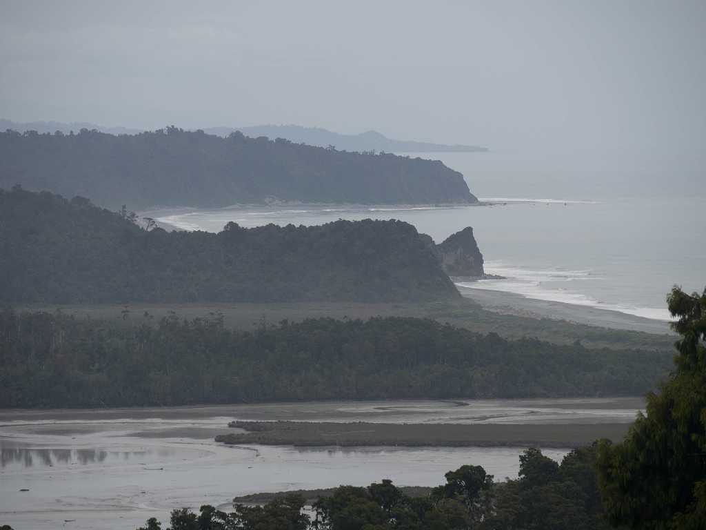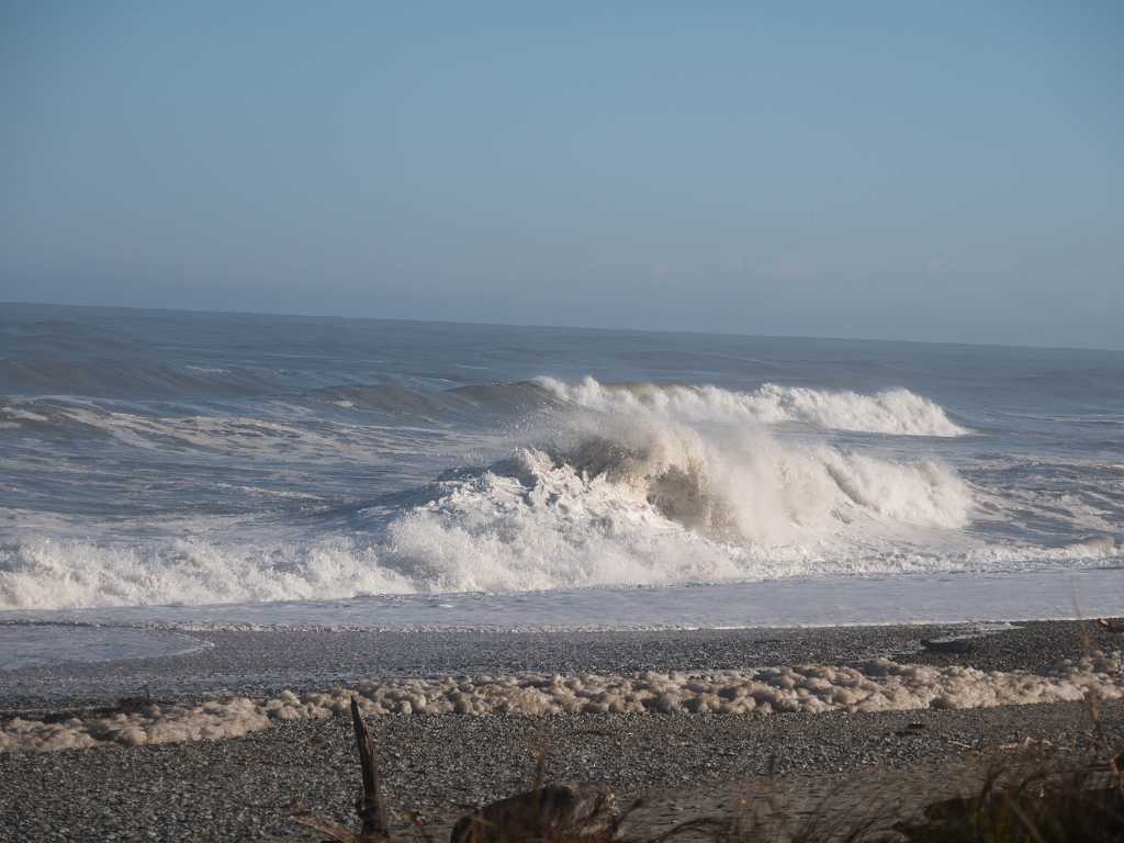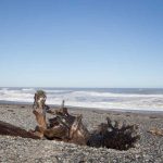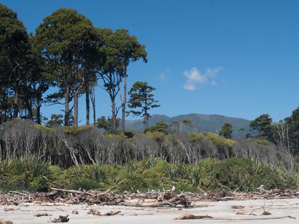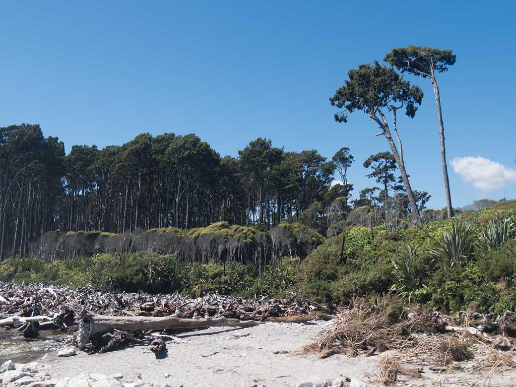 Danach geht es etwas landeinwärts, um aber 30 km später erneut auf die Küste zu treffen. Wir erreichen die Bruce Bay, die mit Treibholz übersät ist.