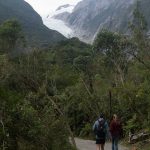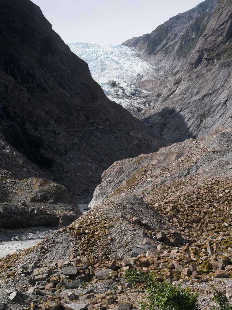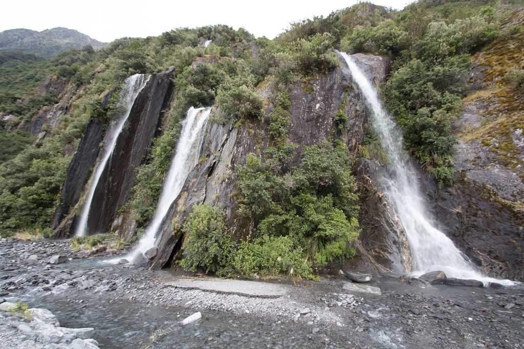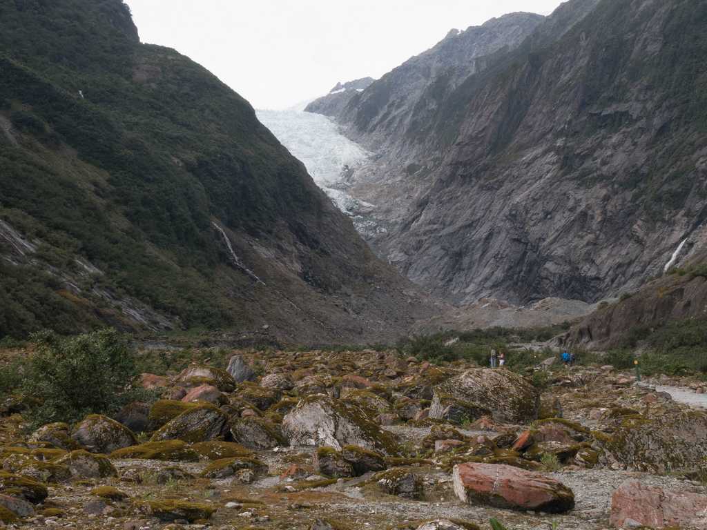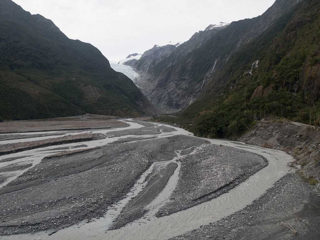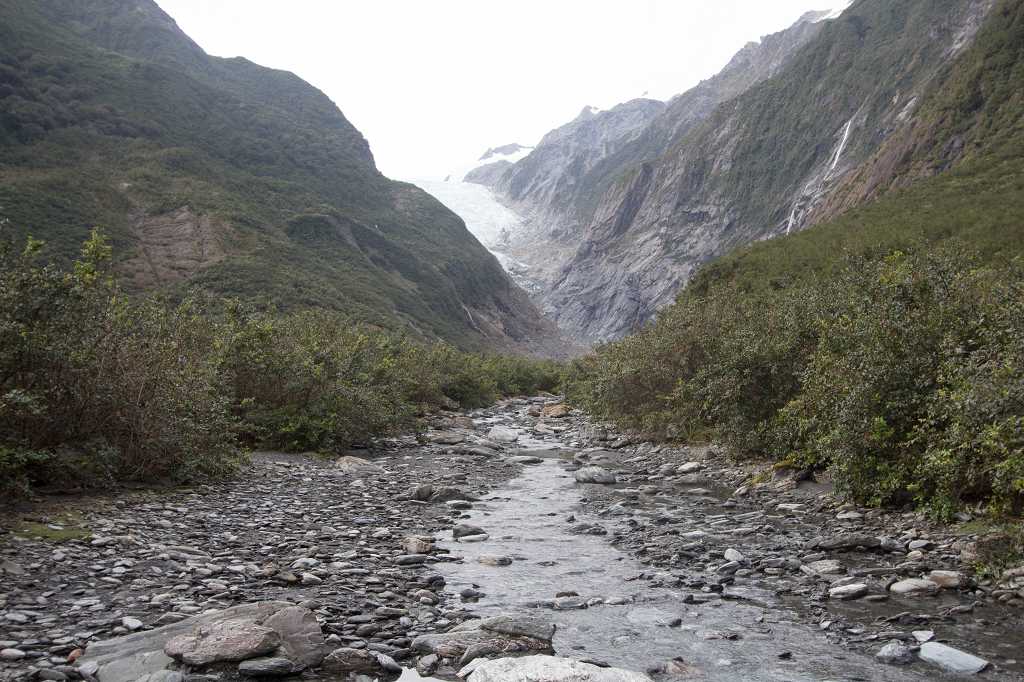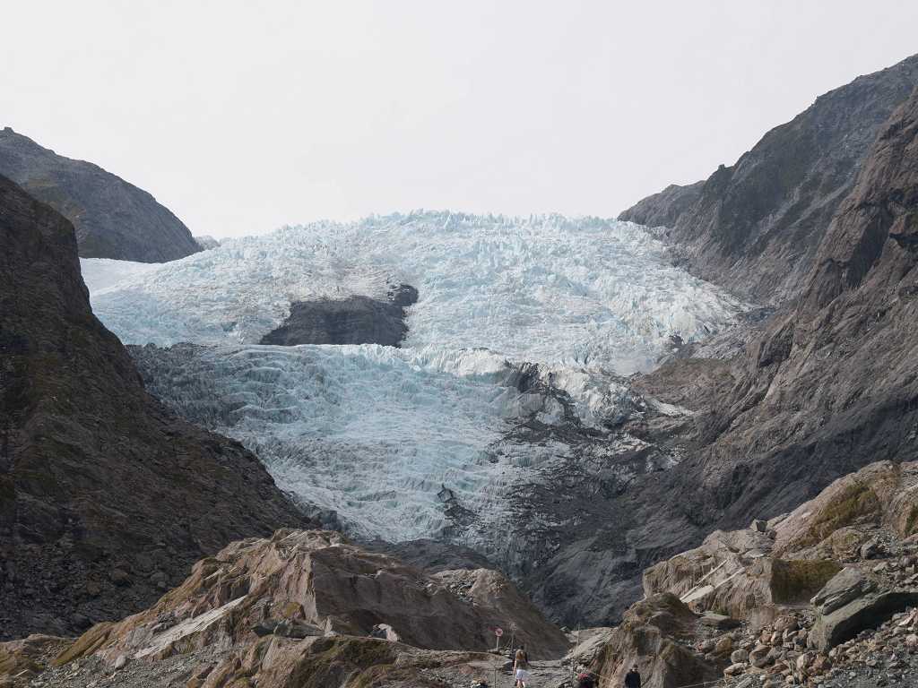 Am nächsten Tag haben wir dann mehr Glück mit unserer Gletscher Tour, die Zufahrt zum „Franz Josef Glacier“ ist frei. Wir wandern etwa 3km bis zum Gletschertor, aus dem der „Waiho River“ entspringt. Der Weg steigt kontinuierlich mäßig aufwärts, immer entlang des gewaltige Wassermassen führenden Flusses. Mehrere beeindruckende Wasserfälle sorgen unterwegs zusätzlich für noch mehr Wasser!