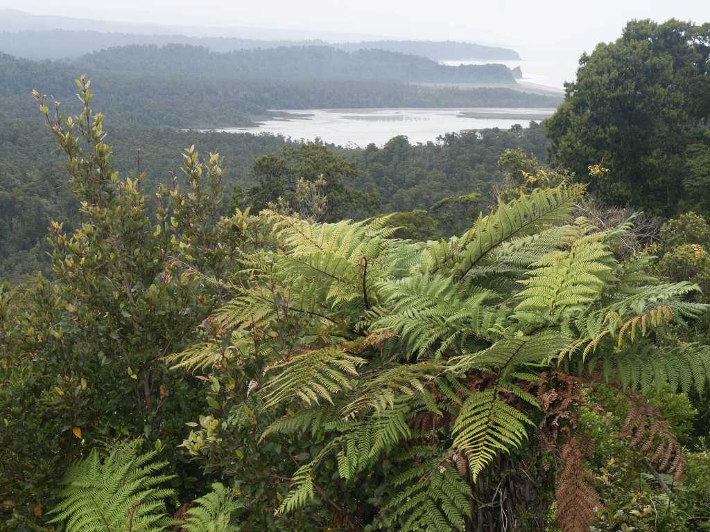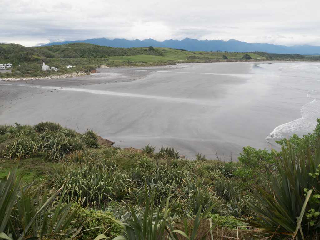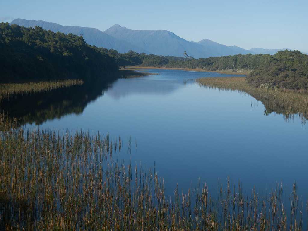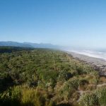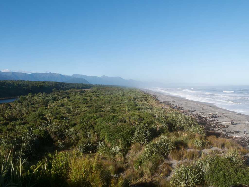 Nach dieser Exkursion in die Erdgeschichte, zieht es uns wieder in wärmere Gefilde. Wir fahren nach Okarito und damit wieder ans Tasmanische Meer. Ein schöner Wanderweg, der „Okarito Trig Walk“ führt uns auf den 170 m hohen Hügel „Okarito Trig“, von dem sich uns eine grandiose Aussicht bietet! Links sehen wir die „Tasmanische Sea“, daneben schließt sich die dunkelgrün eingefasste „Okarito Lagune“ an, Neuseelands größtes, unberührtes Feuchtgebiet, die Heimat zahlreicher Wattvögel.