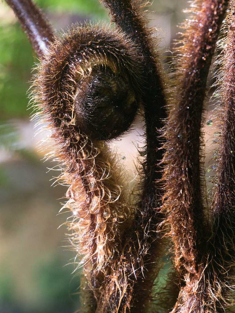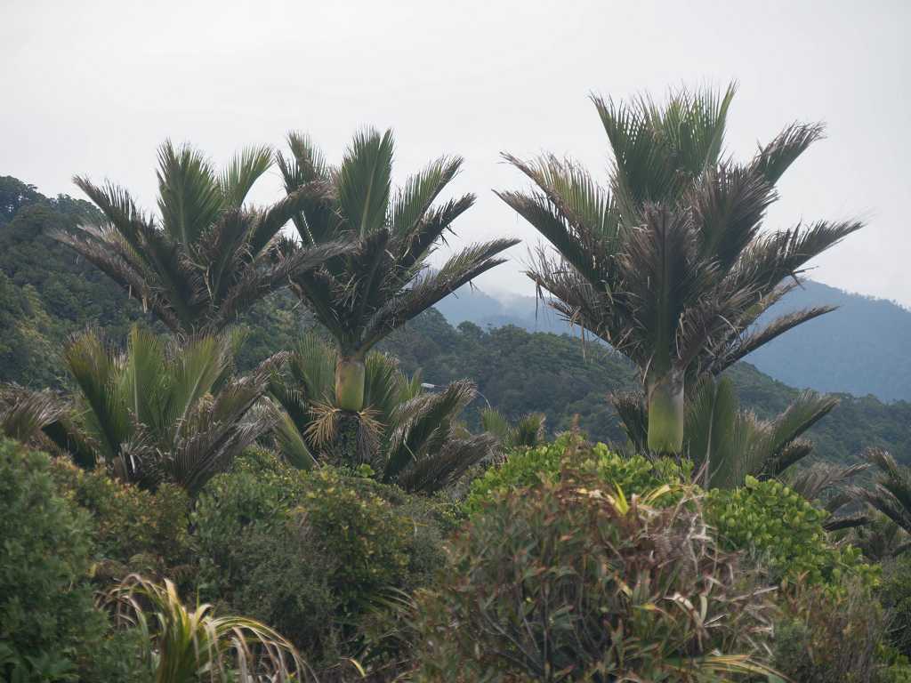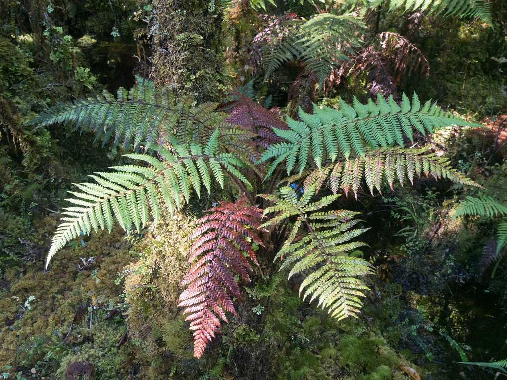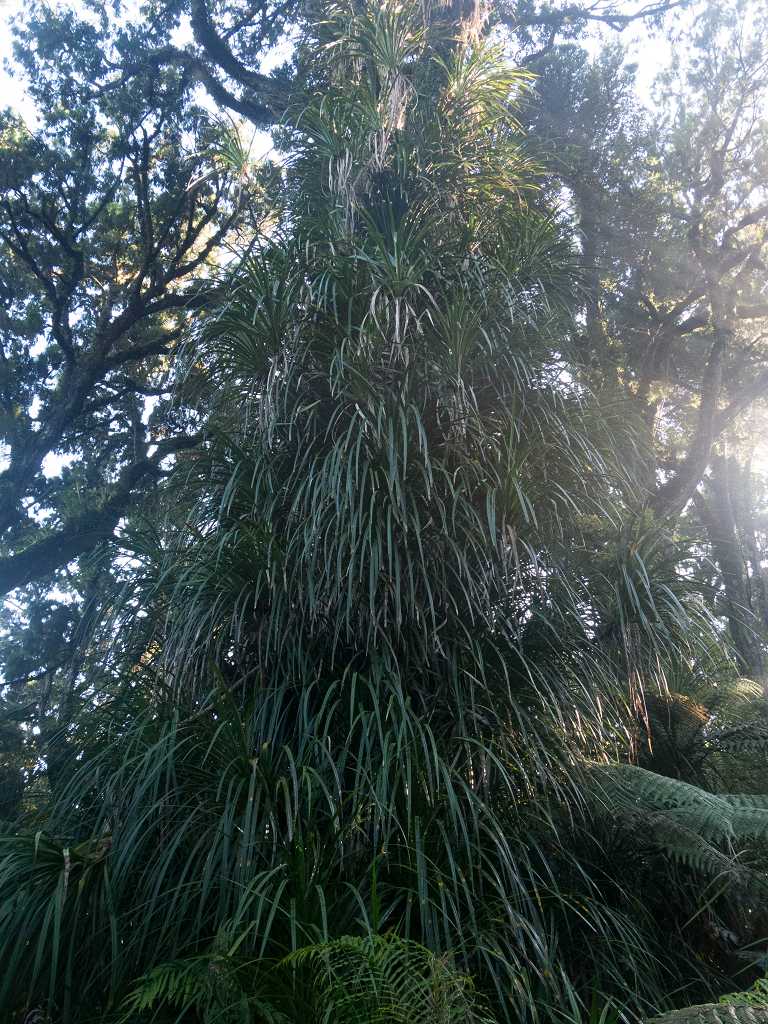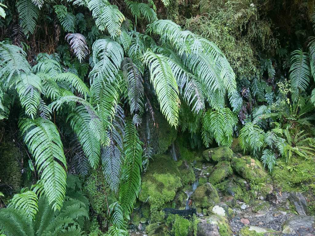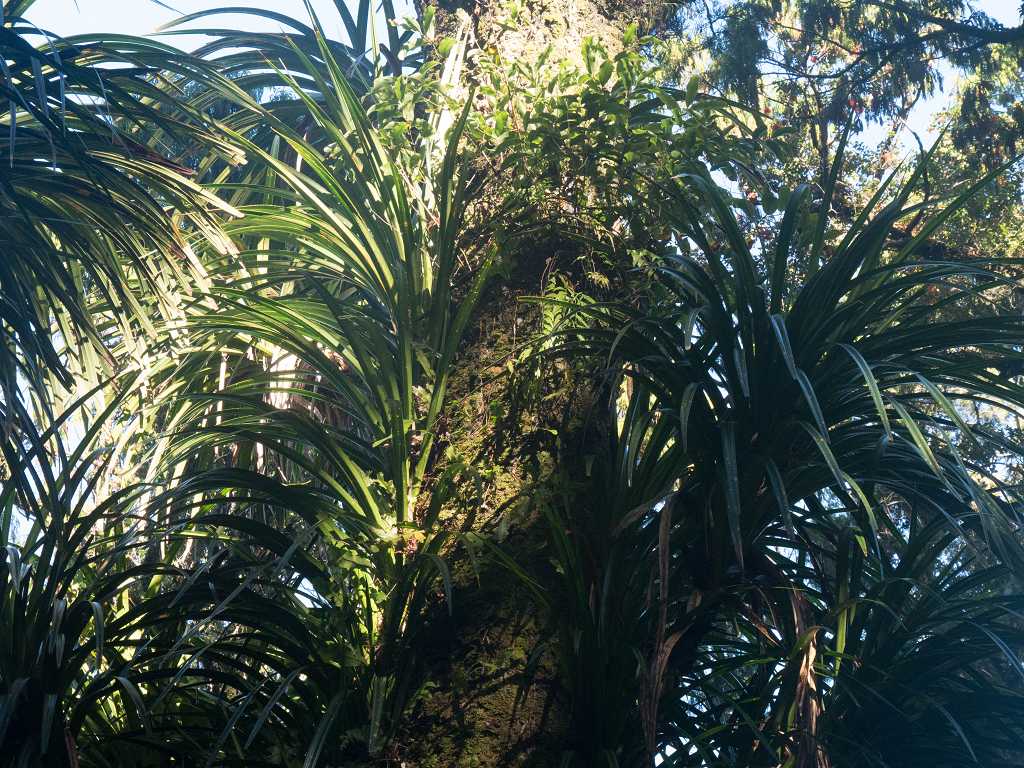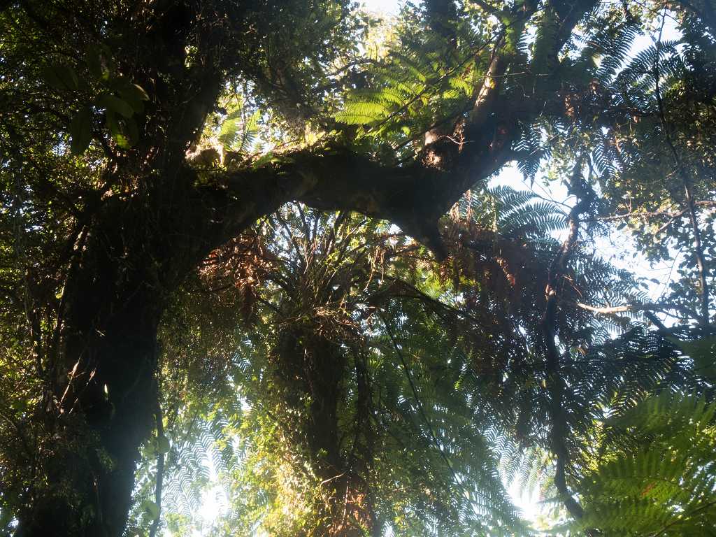 Direkt hinter dem Strand tauchen wir sofort in dichten Regenwald ein. Zahlreiche Baumfarne, moosbewachsenen Bäume mit Lianen und verschiedenste andere Feuchtigkeit liebende Pflanzen gehen hier eine chaotische Symbiose ein, um sich am Leben zu erhalten.
