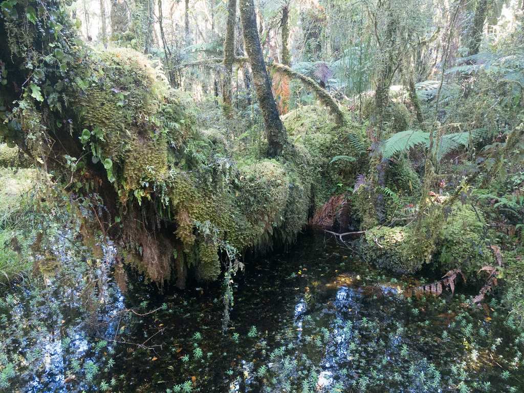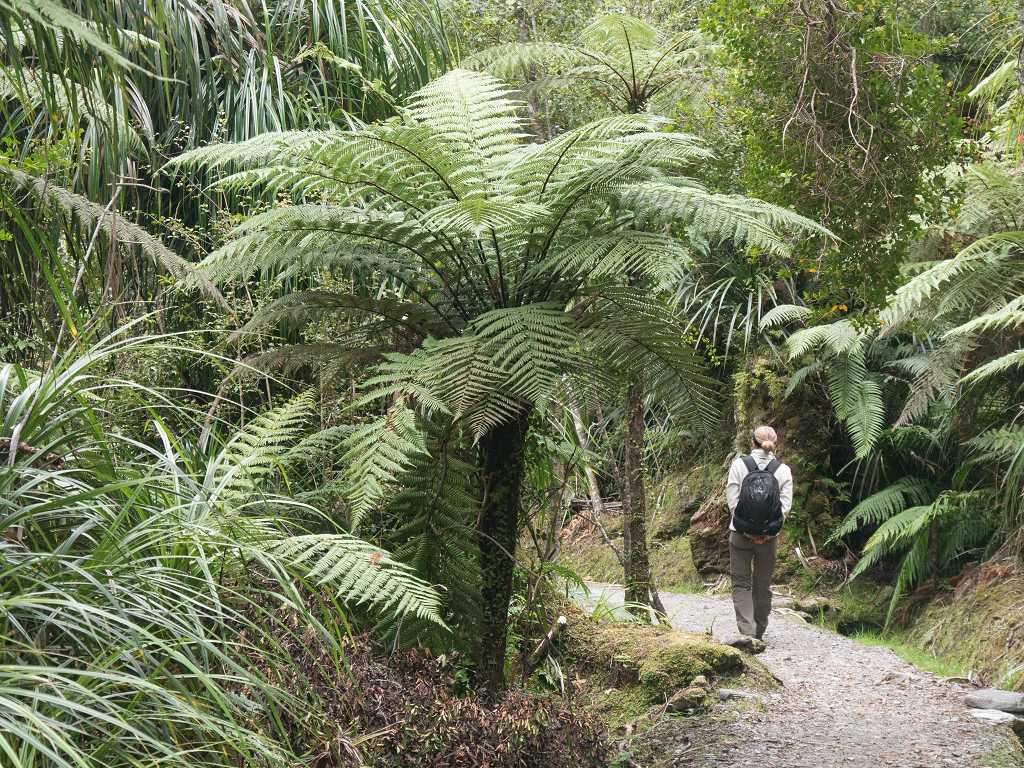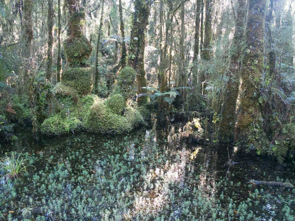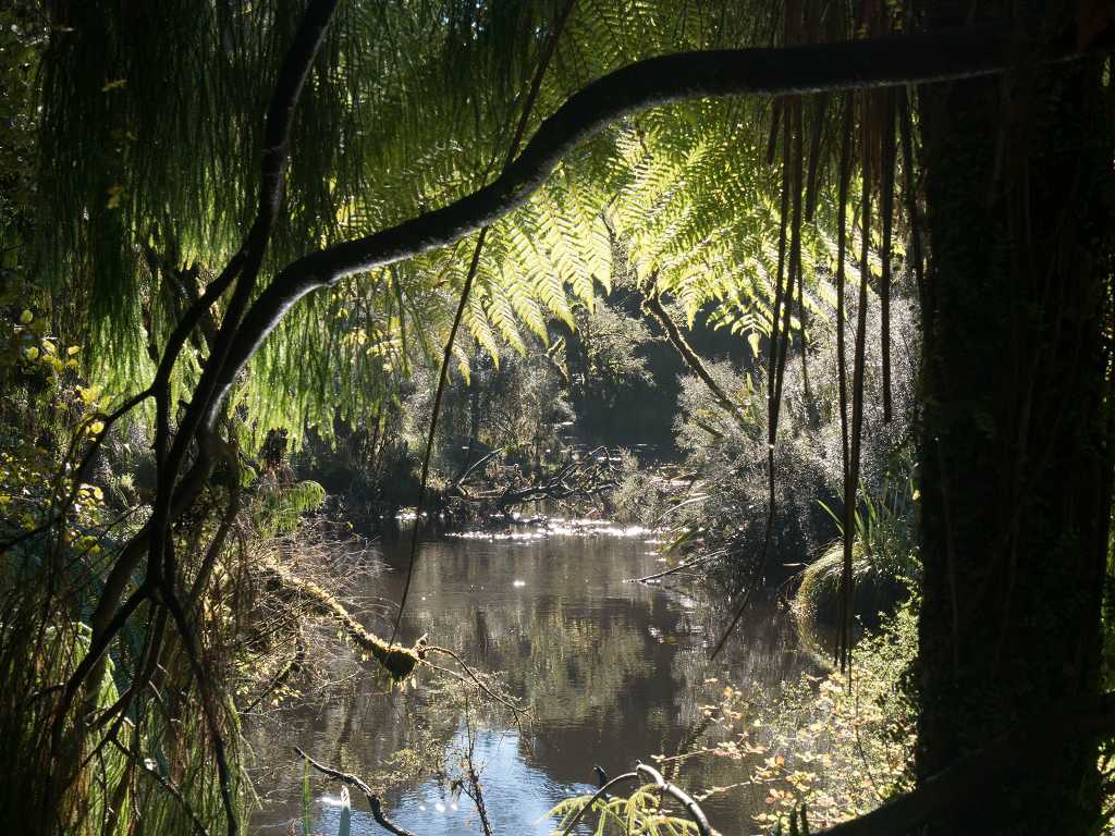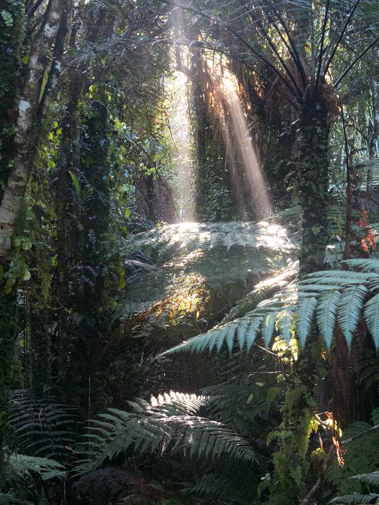 Die zweite Wanderung „Kahikatea Swamp Forest Walk“ führt uns entlang des Flüsschen „Ship Creek“ flussaufwärts durch Sumpfland und Kahikatea Wald. Besonders eindrucksvoll ist die hohe Luftfeuchtigkeit im Licht der Sonne zu beobachten, tausende winziger Wassertröpfchen wirbeln durch die Lüfte.