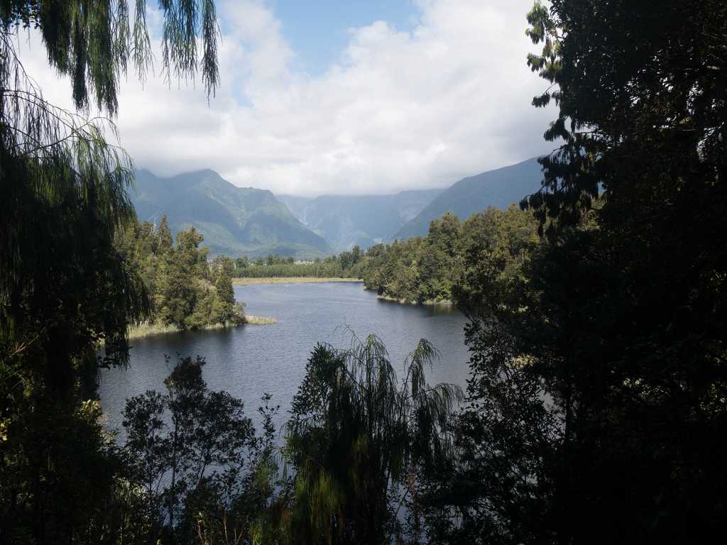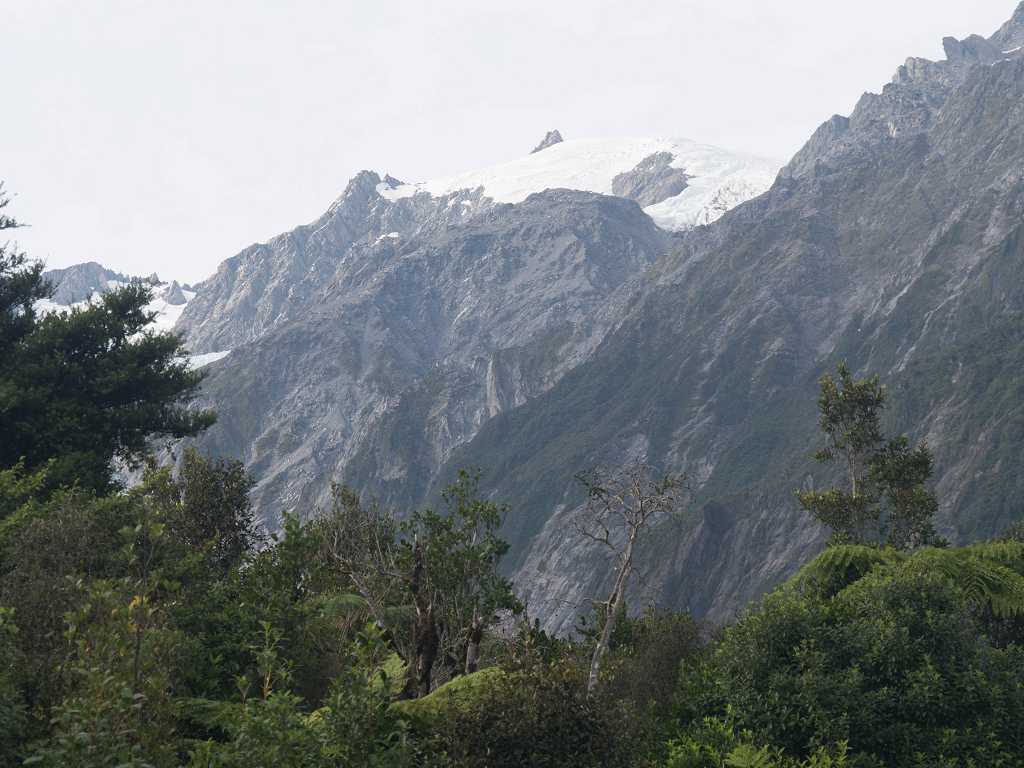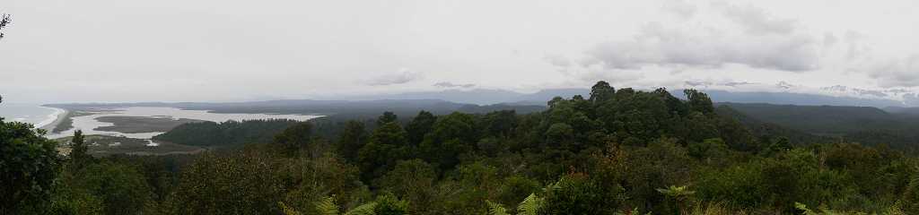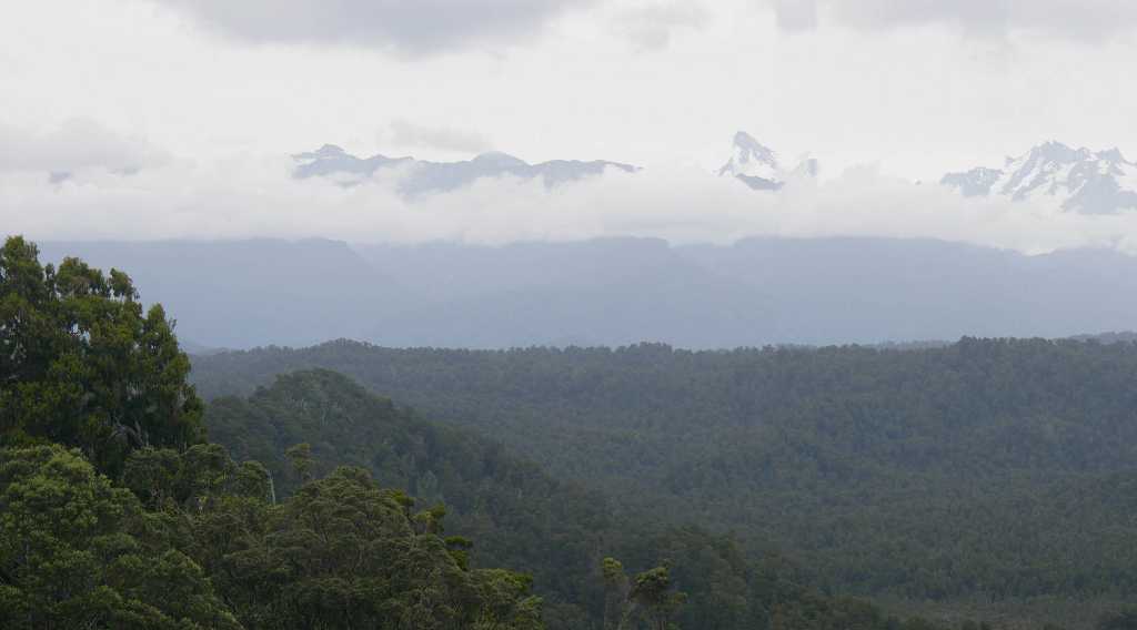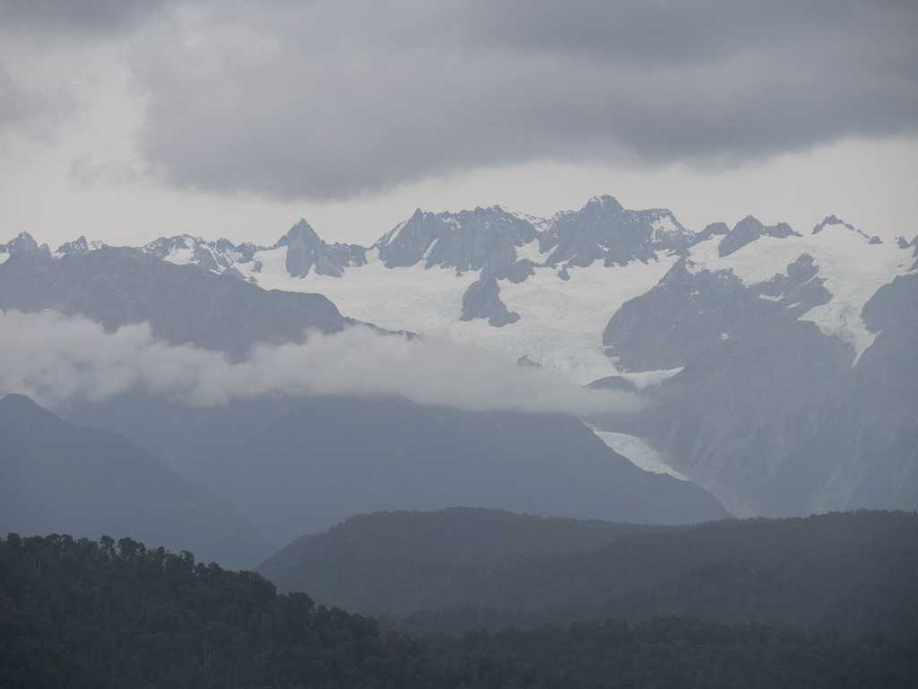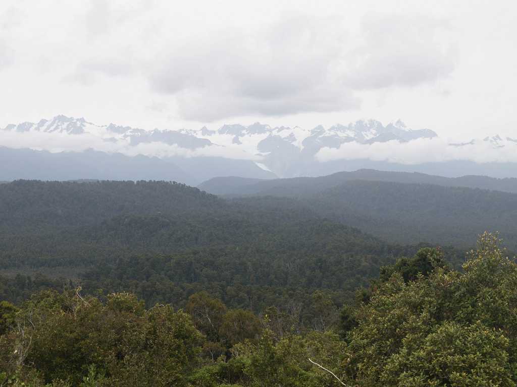 Der dichte grüne Regenwald erstreckt sich, soweit das Auge reicht. Aber das tollste ist der Blick auf die im ewigen Eis schimmernden, weißen Gipfel der Südalpen, in denen wir noch am Vormittag gewandert sind!