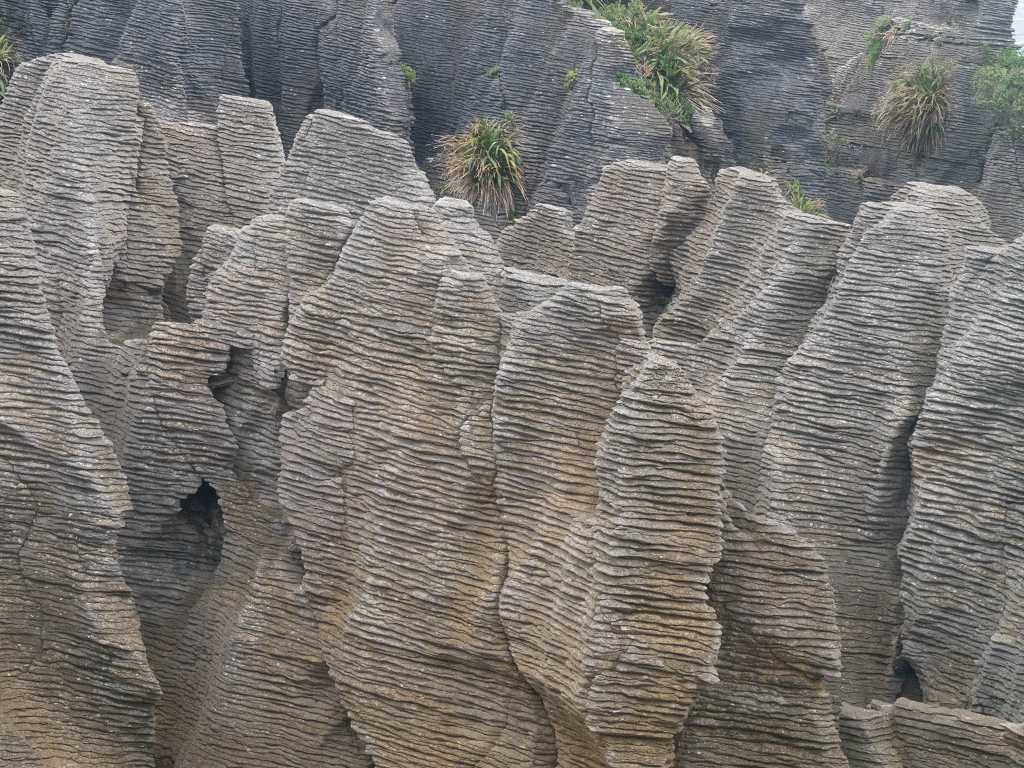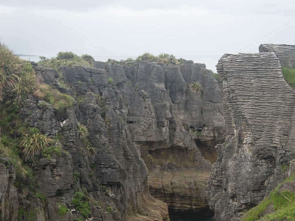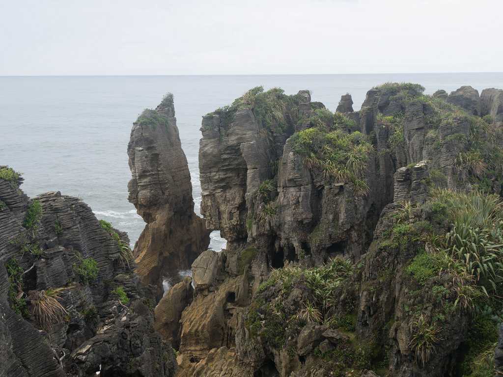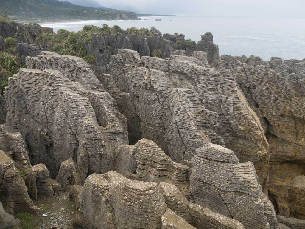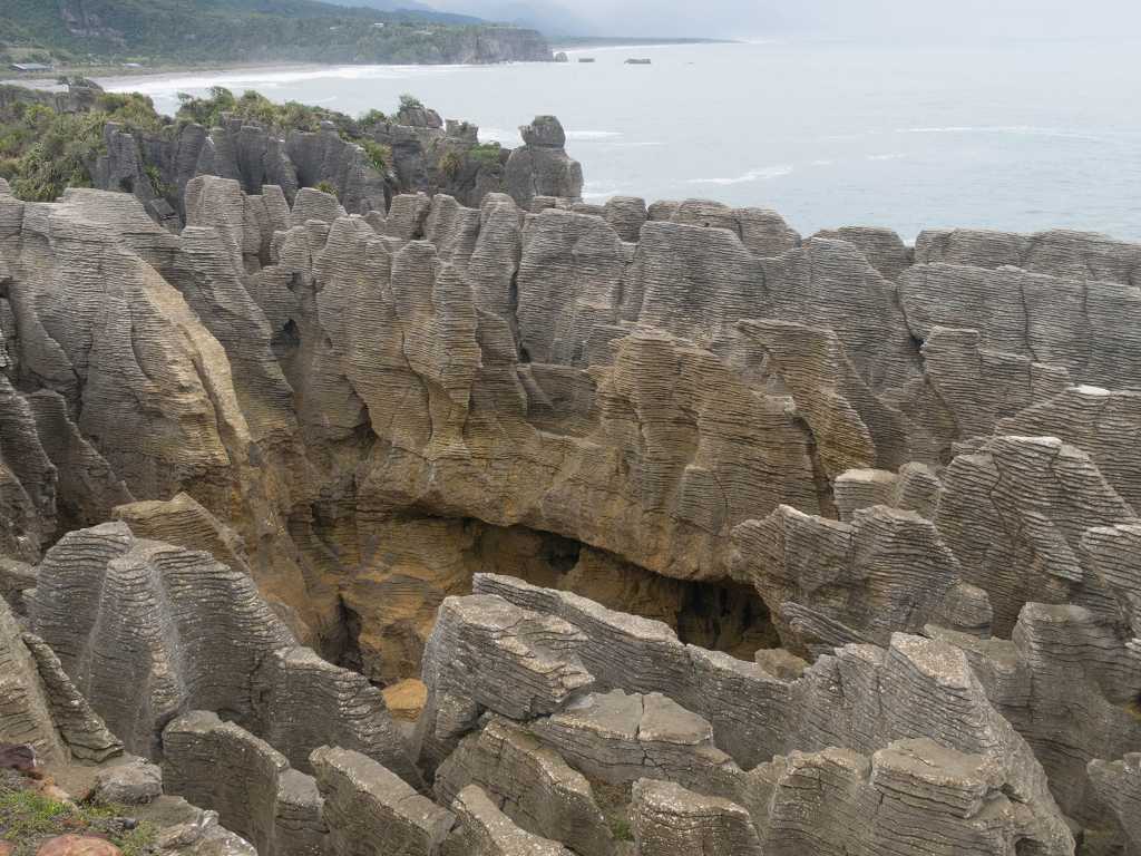 In Hokitika übernachten wir dann im „Hokitika Holiday Park“ und sind am nächsten Morgen gut ausgeruht für neue Erlebnisse. Der Westcoast Road nach Norden folgend halten wir in Punakaiki. Hier wollen wir uns die berühmten „Pancake Rocks“ im Pararoa Nationalpark ansehen. Wie Berge von aufeinander gestapelten Pfannkuchen sehen diese vom Meer umspülten Kalksteinformationen aus! Man bekommt förmlich Appetit auf diese leckere Speise!