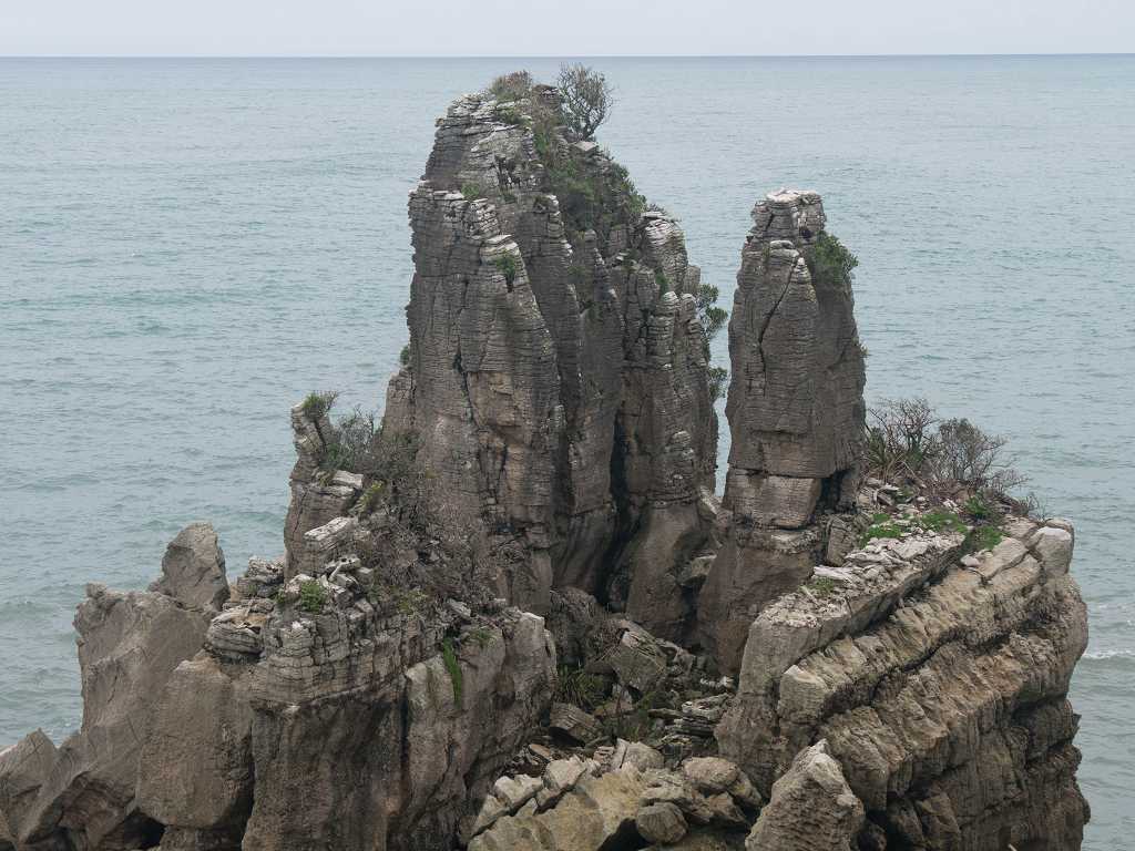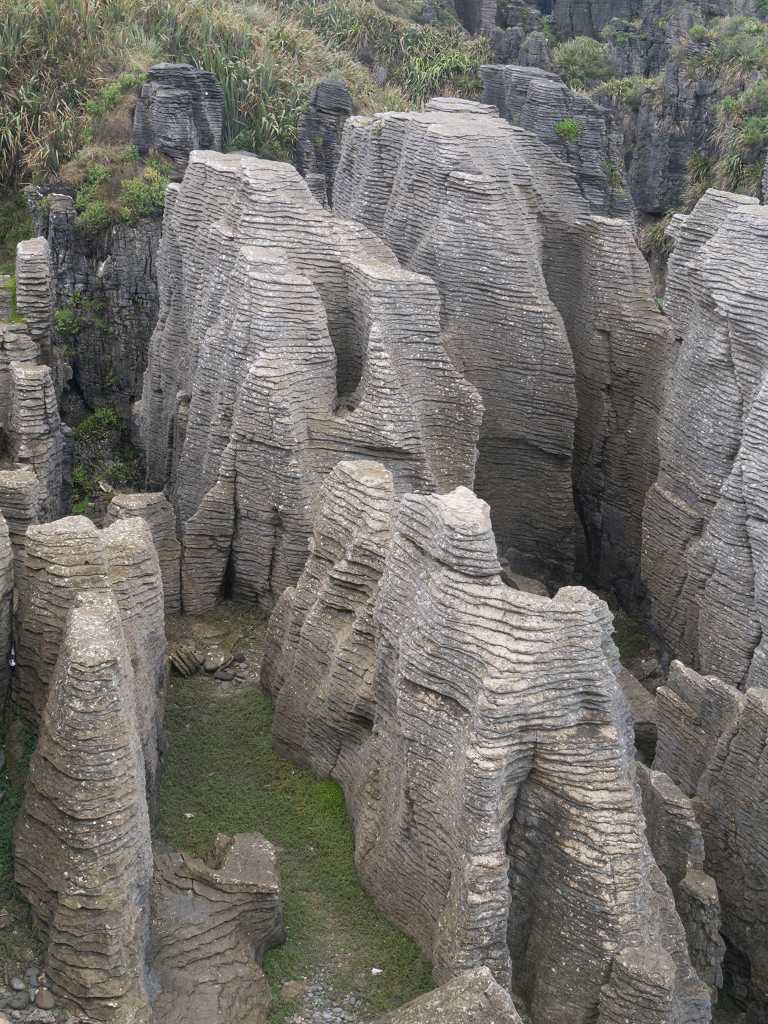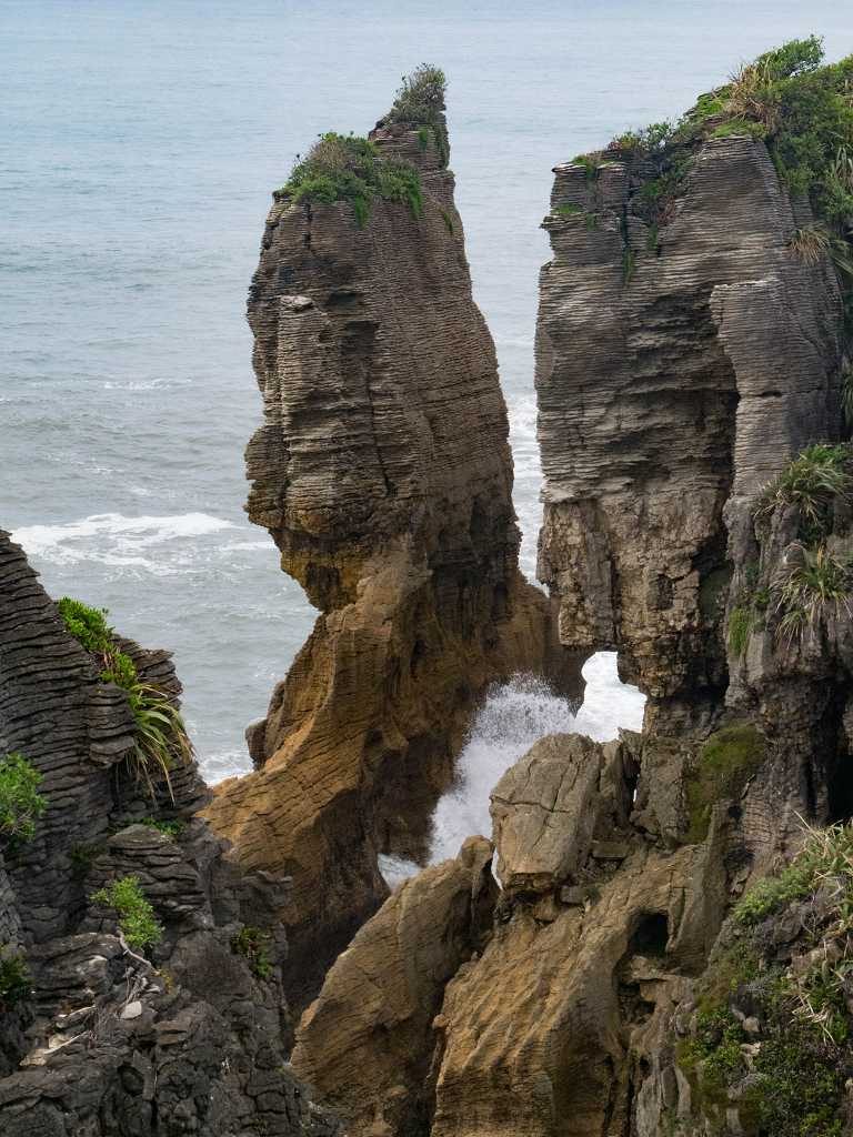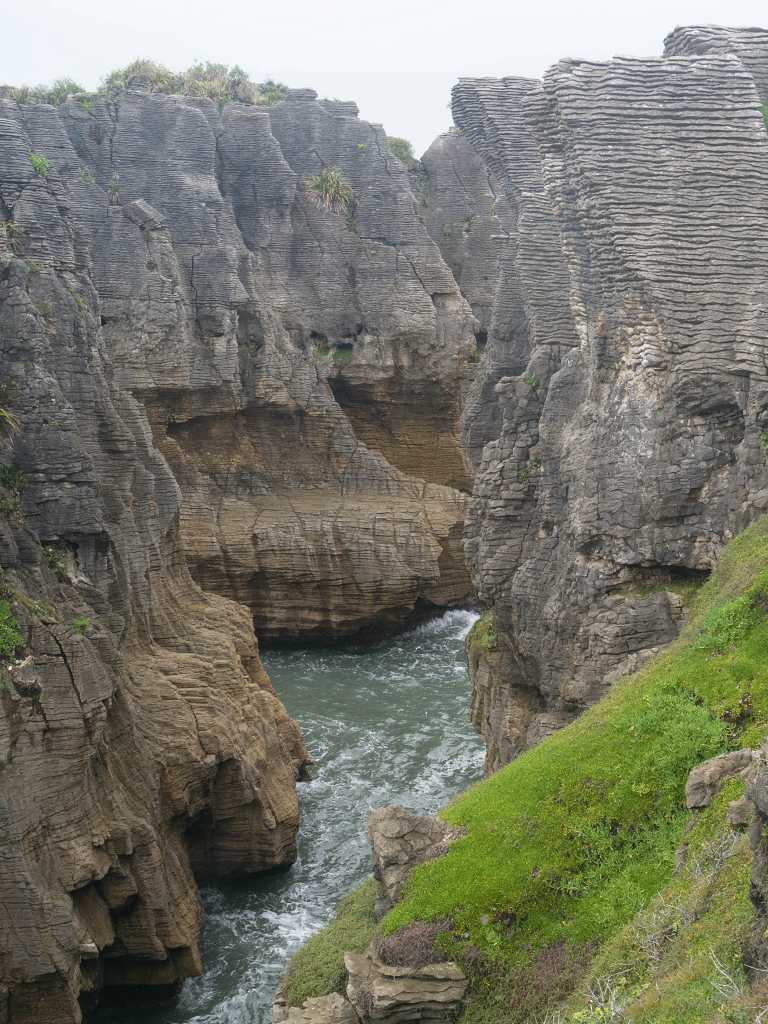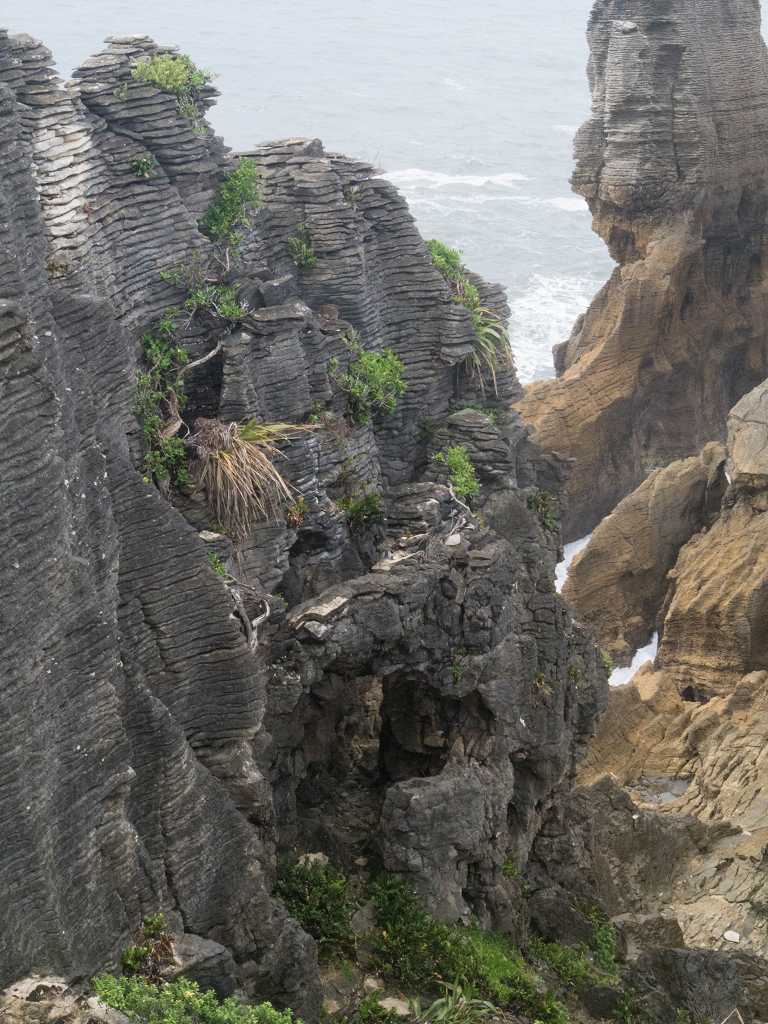In Hokitika übernachten wir dann im „Hokitika Holiday Park“ und sind am nächsten Morgen gut ausgeruht für neue Erlebnisse. Der Westcoast Road nach Norden folgend halten wir in Punakaiki. Hier wollen wir uns die berühmten „Pancake Rocks“ im Pararoa Nationalpark ansehen. Wie Berge von aufeinander gestapelten Pfannkuchen sehen diese vom Meer umspülten Kalksteinformationen aus! Man bekommt förmlich Appetit auf diese leckere Speise!