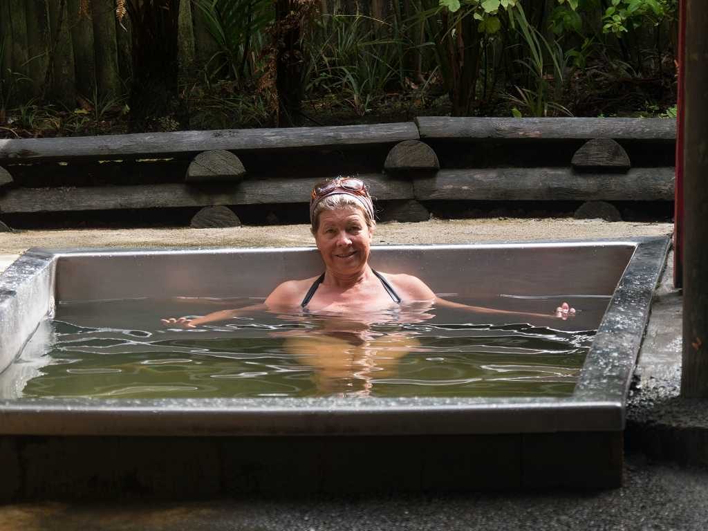 Nach dem kurzen Walk belohnen wir uns mit einem heißen Bad und genießen die Wärme der Quelle. Ein Ehepaar aus Deutschland mit zwei Kindern leistet uns Gesellschaft und wir tauschen unsere Urlaubserfahrungen aus