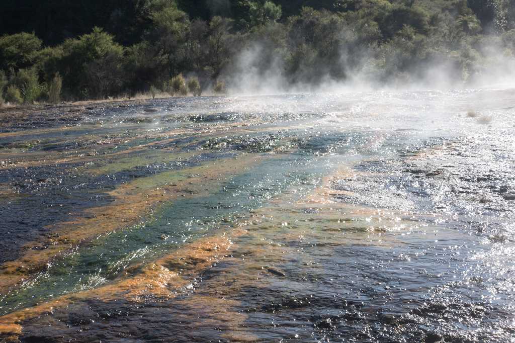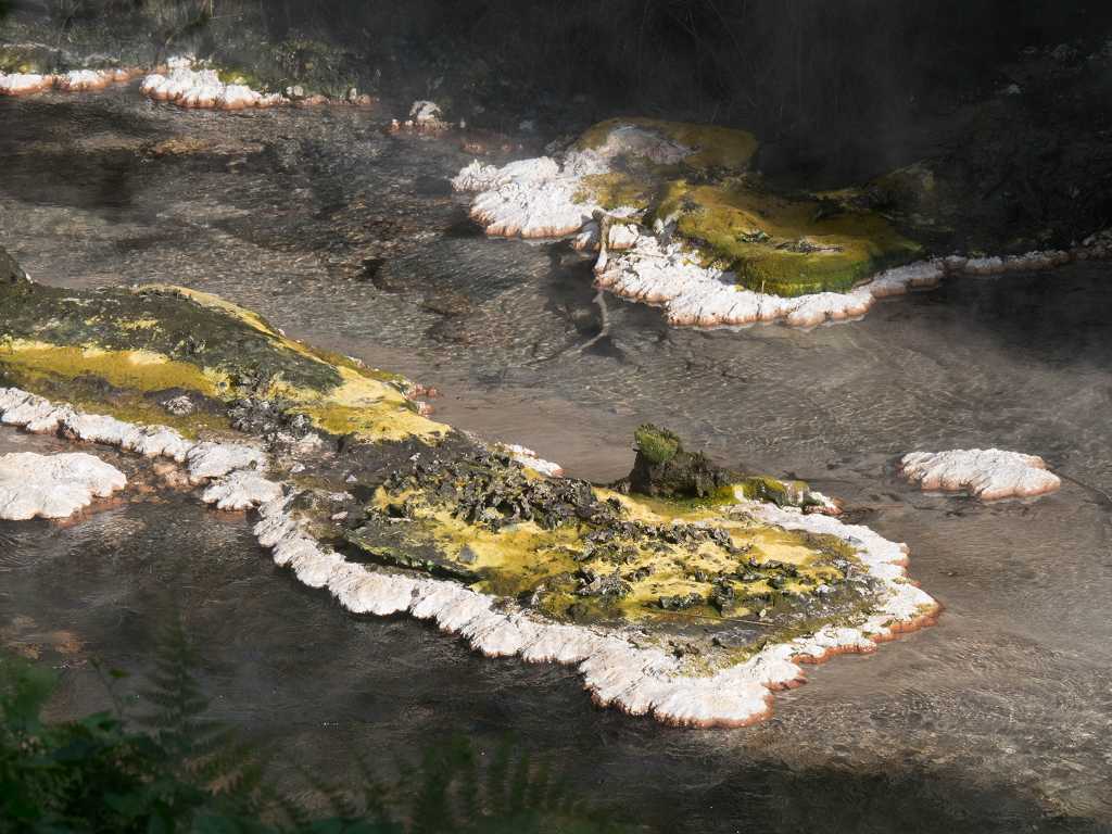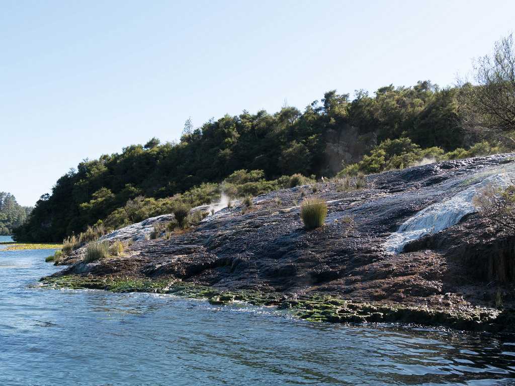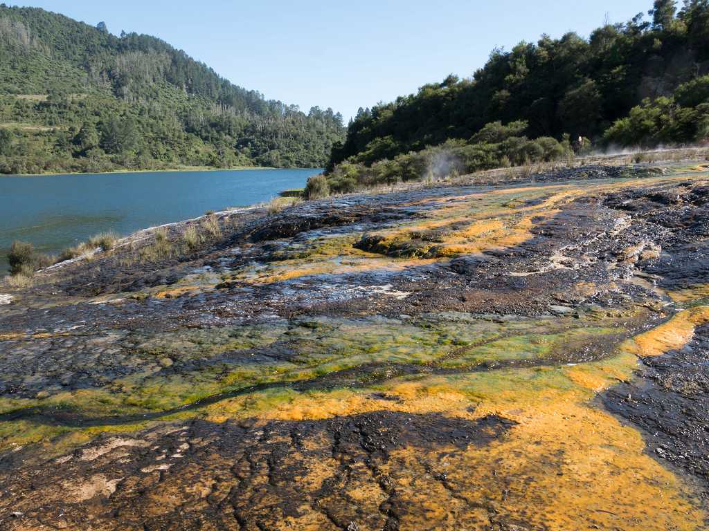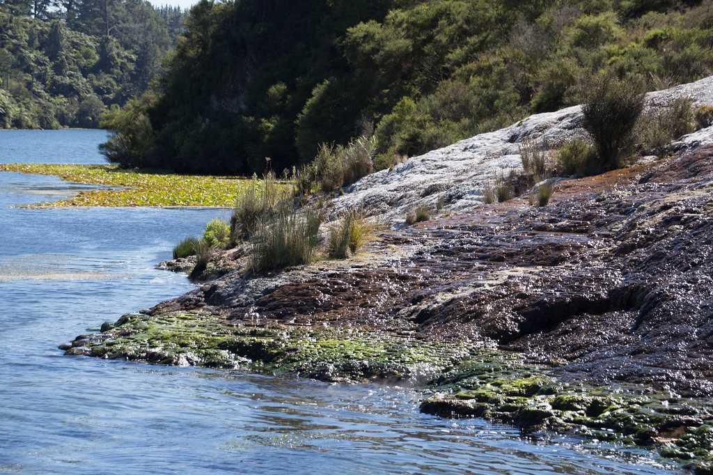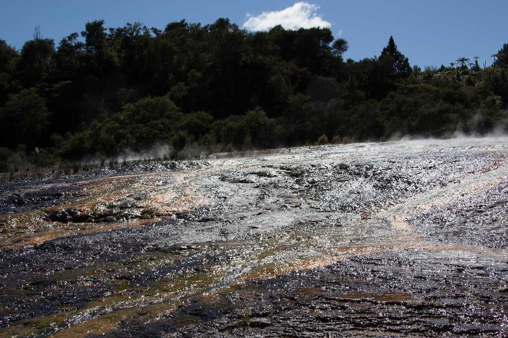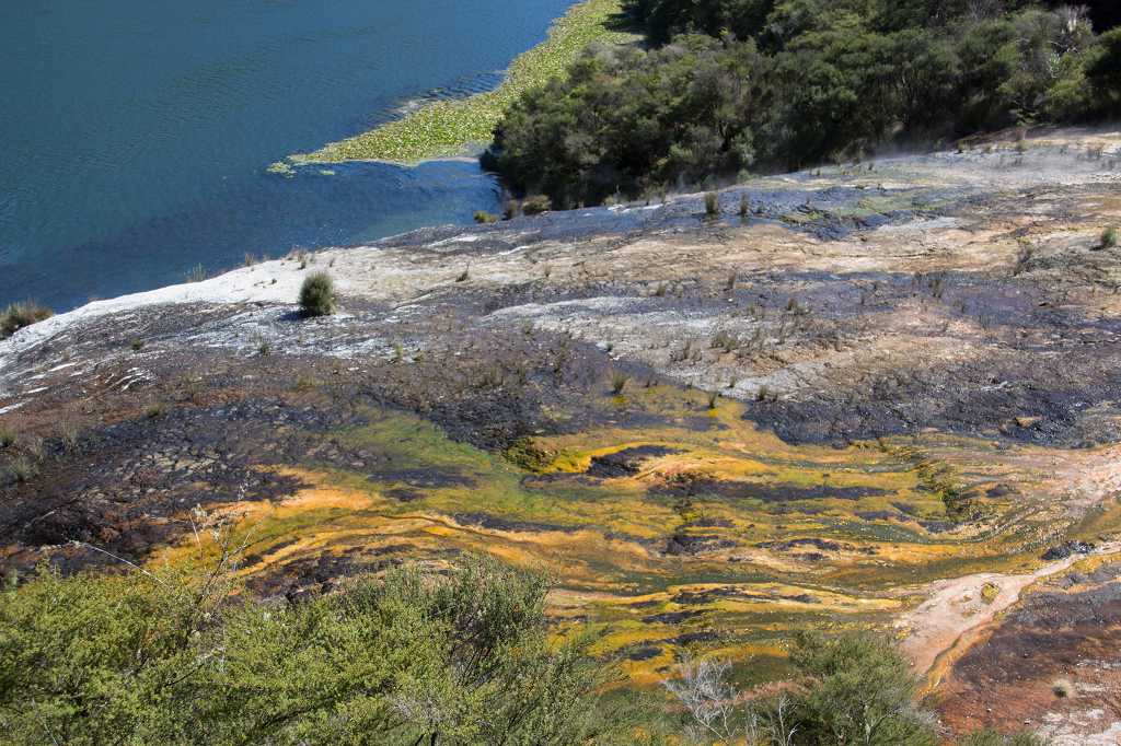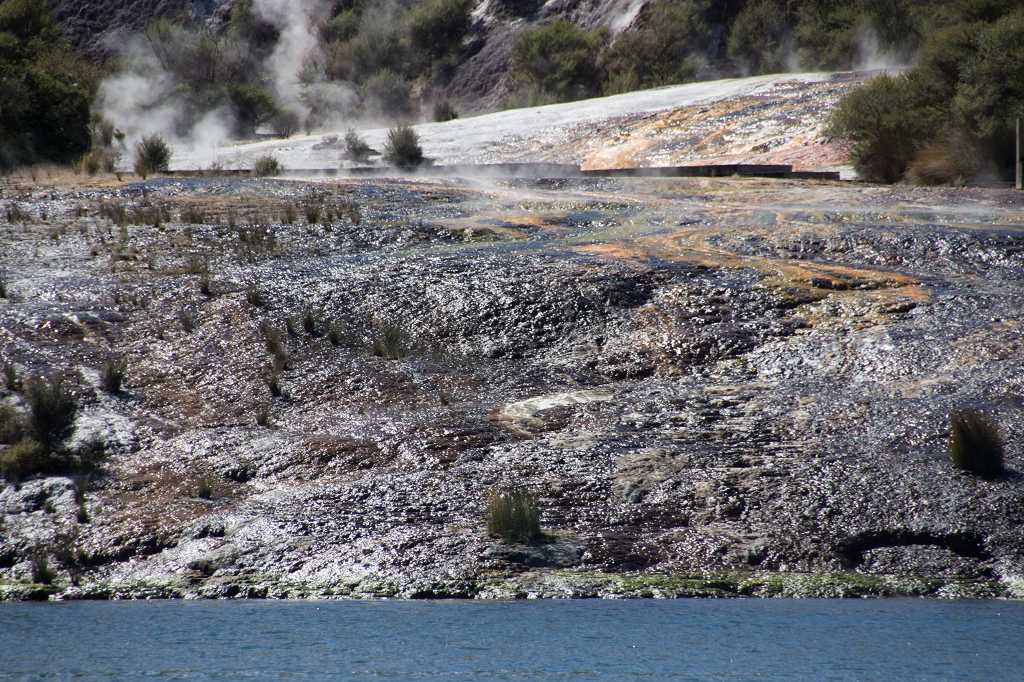 Fälschlicherweise könnte man annehmen, es sei ein erstarrtes Lavafeld. In Wirklichkeit handelt es sich aber um Neuseelands größte Sinterterrassen. Sie sind stellenweise zwischen 20 mm und 20 m dick und reichen bis 35 m unter die Seeoberfläche!