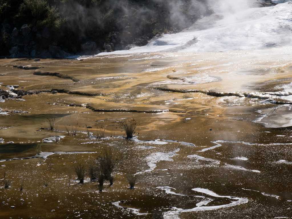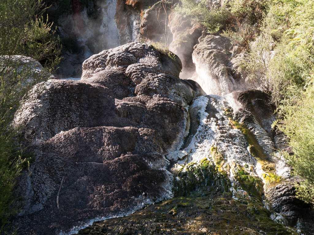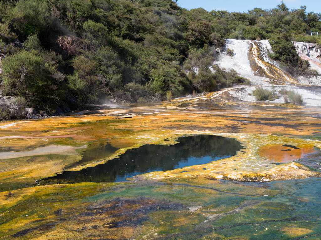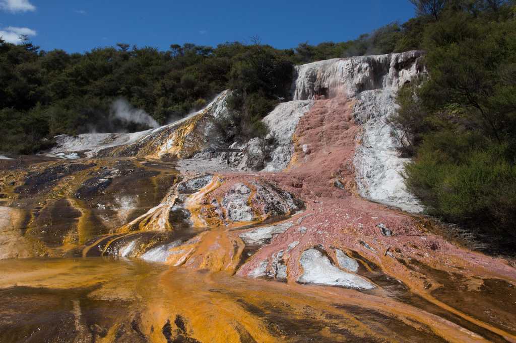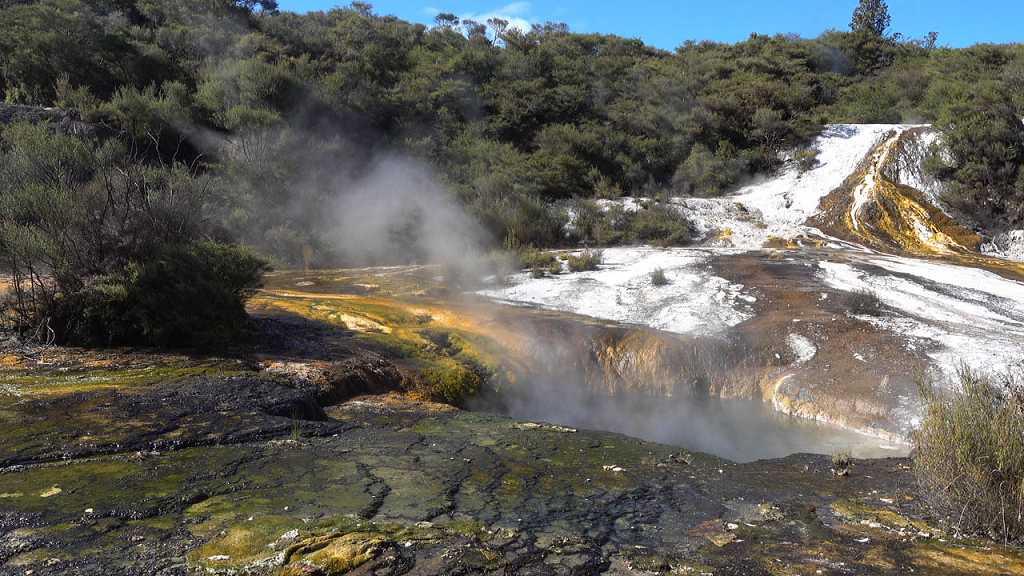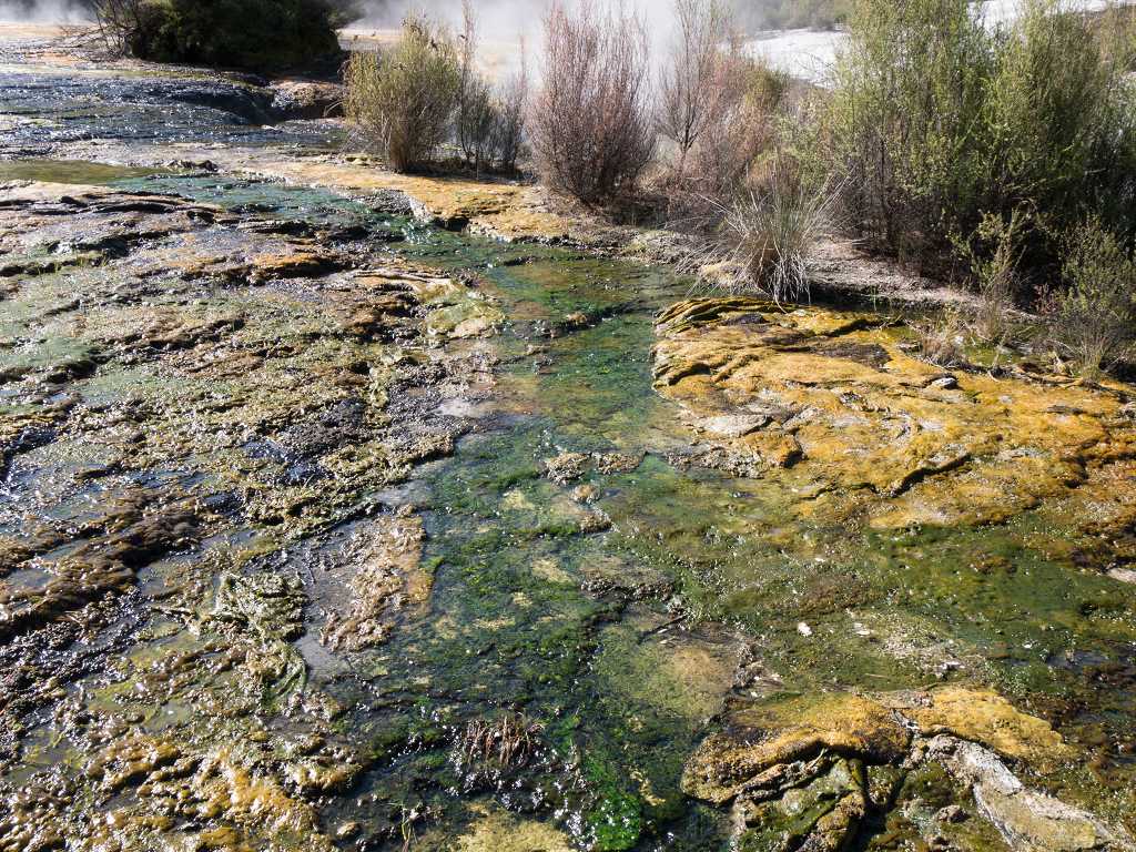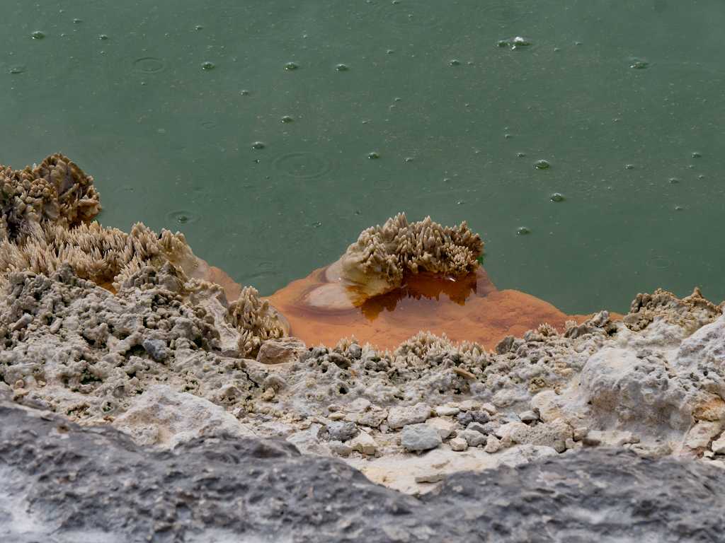 Fälschlicherweise könnte man annehmen, es sei ein erstarrtes Lavafeld. In Wirklichkeit handelt es sich aber um Neuseelands größte Sinterterrassen. Sie sind stellenweise zwischen 20 mm und 20 m dick und reichen bis 35 m unter die Seeoberfläche!