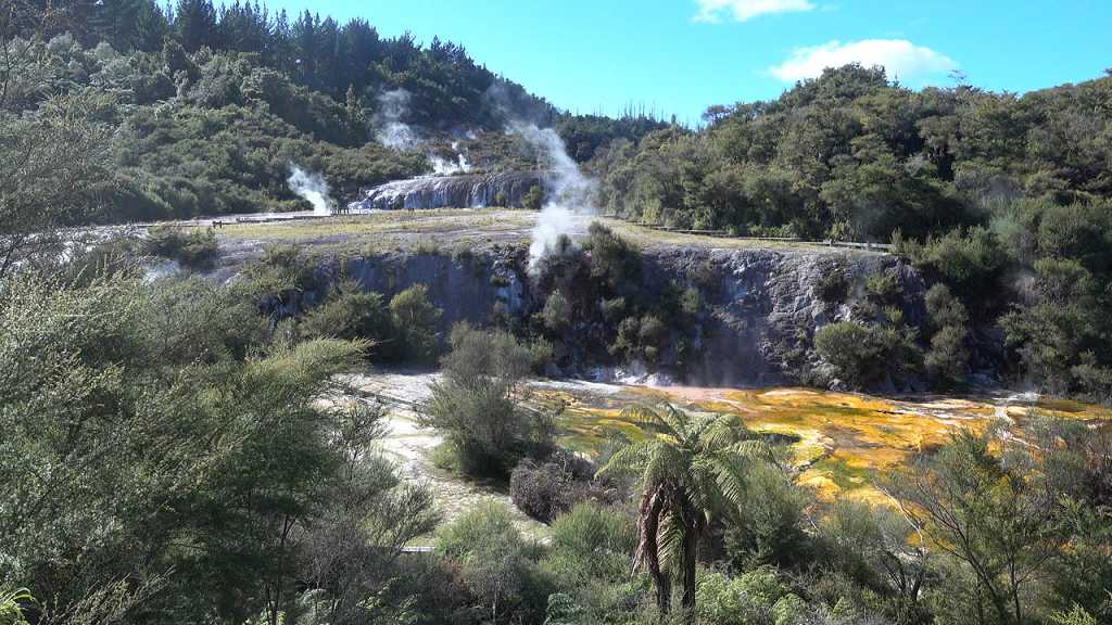 Rotorua hat sehr viele verschiedene geothermische Sehenswürdigkeiten, die Auswahl ist nicht so ganz einfach. Da wir absichtlich nicht in das touristisch sehr stark frequentierte Geysirfeld „Whakarewarewa“ gehen möchten, entscheiden wir uns heute für das „Thermal-Wunderland von Wai-O-Tapu“.