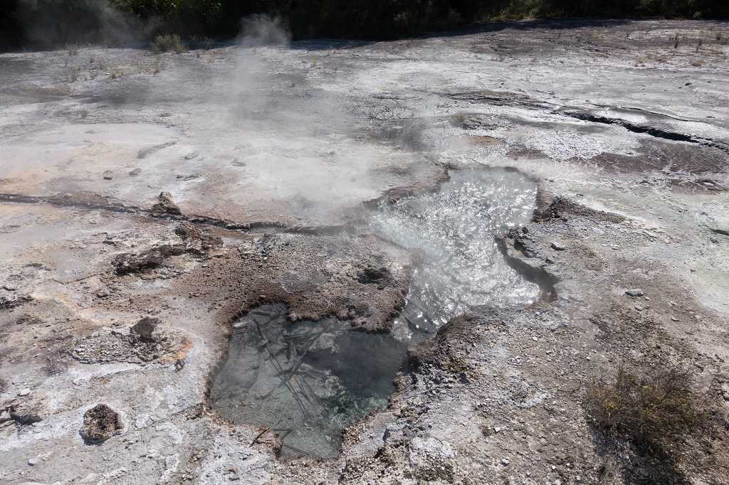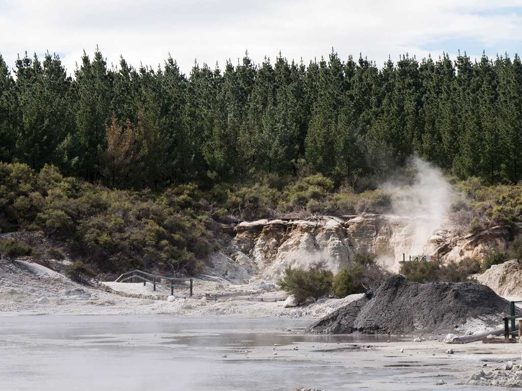 Erste Erkundungen unternehmen wir in der Nähe des Lake Rotorua im Thermalfeld „Hells Gate Waiora Spa“. Ein gut beschrifteter Rundgang führt uns von einer Erdaktivität zur nächsten.