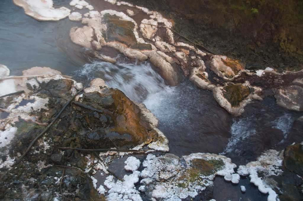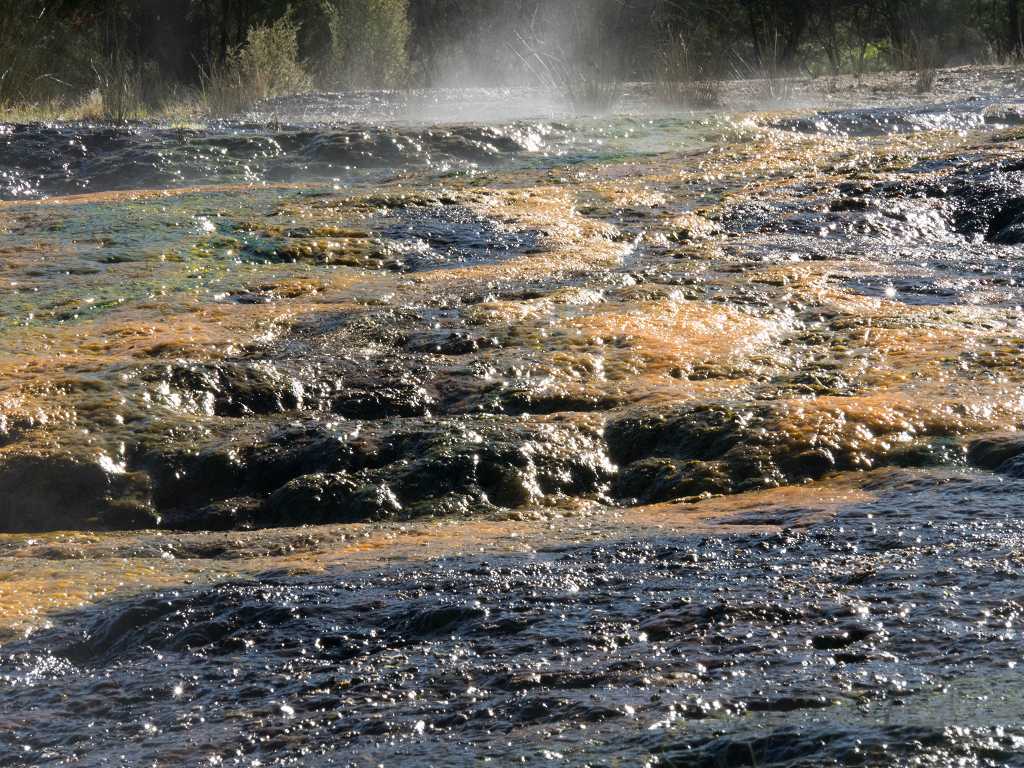 Eine ganz besondere Atmosphäre erwartet uns hier, denn der kleine Gebirgsbach, der gleich neben den Wohnmobilen in einem etwas tiefer gelegenen Bachbett fließt, dampft und brodelt! Weiße Rauchschwaden steigen hinter den Autos hervor..