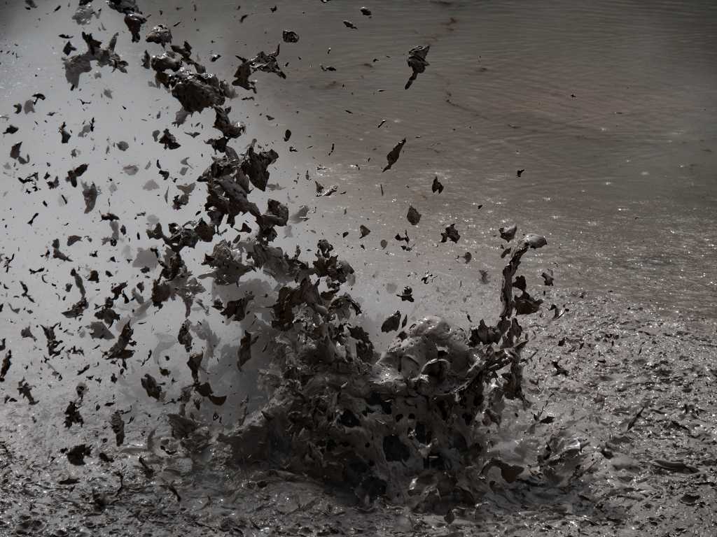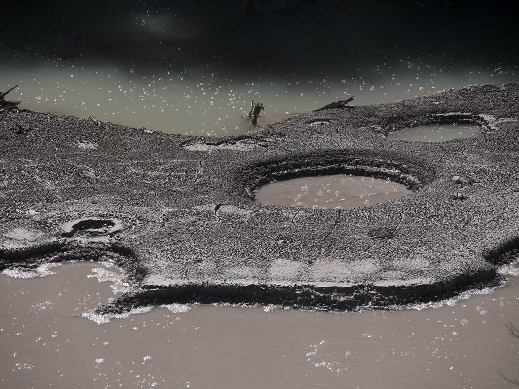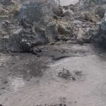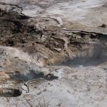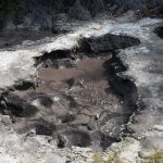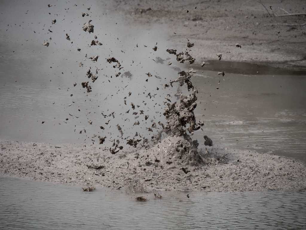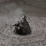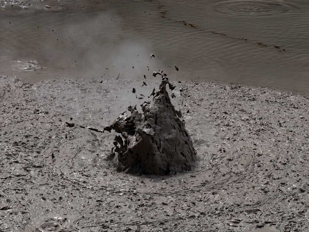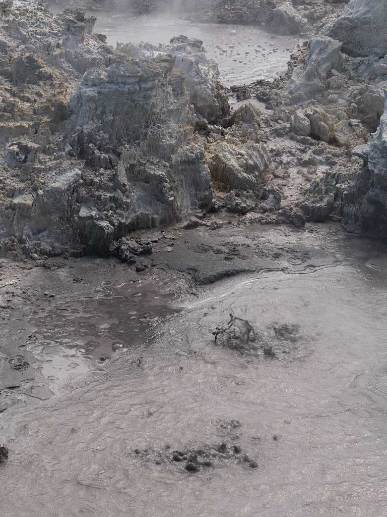 Zum Abschluss unserer geothermischen Erkundungen besichtigen wir die heißen Schlammlöcher. Sie sind von einer bemerkenswerten Aktivität. In kurzen Abständen schleudern sie mit den aufsteigenden Gasblasen Schlamm in die Höhe. Die dabei entstehenden Geräusche sind ebenfalls sehr bizarr…