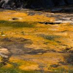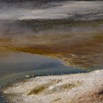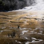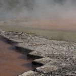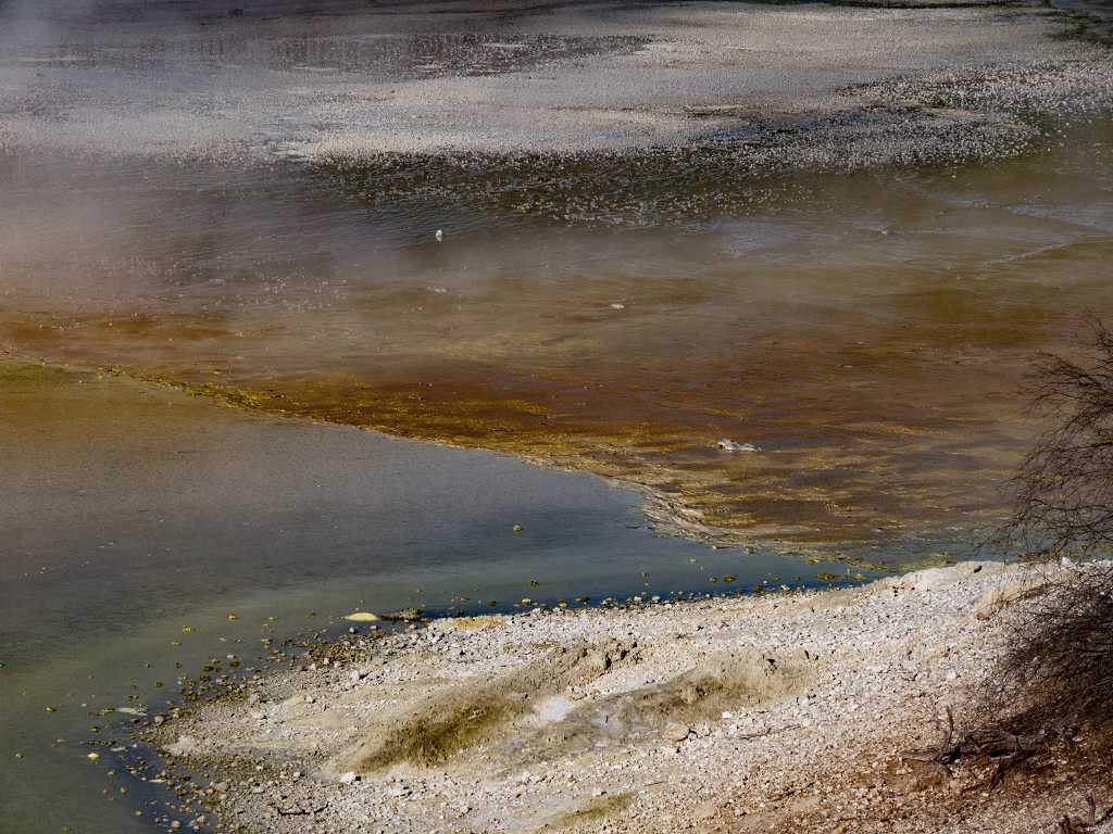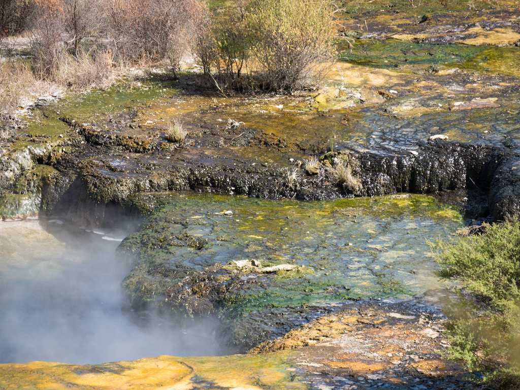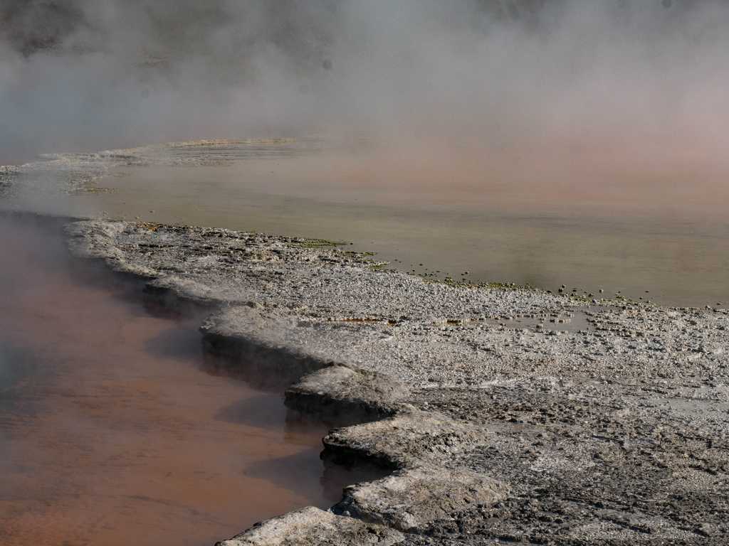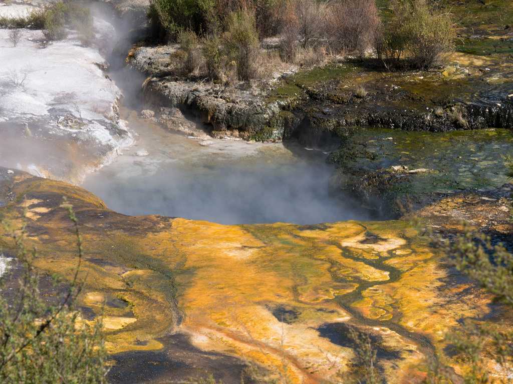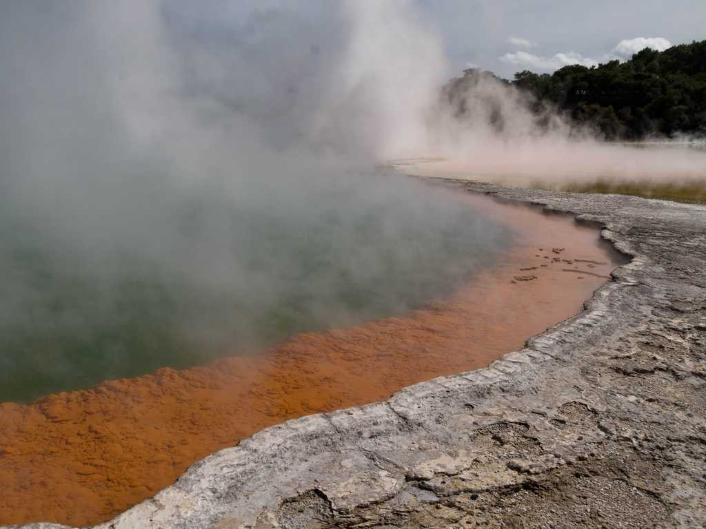 Eine Attraktion dieses Parks ist der leuchtend orange umränderte „Champagner Pool“. Er hat seinen Namen von den in 75 Grad Celsius warmen Wasser aufsteigenden Gasbläschen erhalten, allerdings können wir auch jetzt seine Größe nur erahnen. Der aufsteigende Dampf verdeckt uns die Sicht.