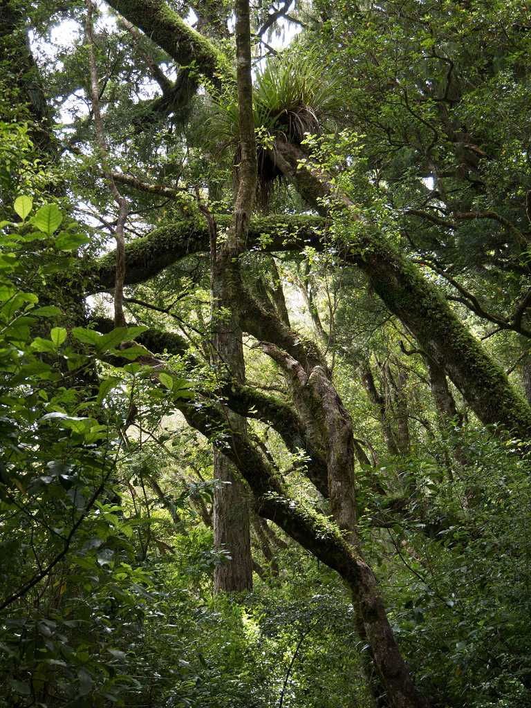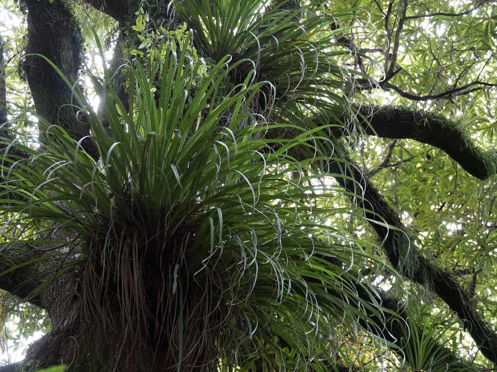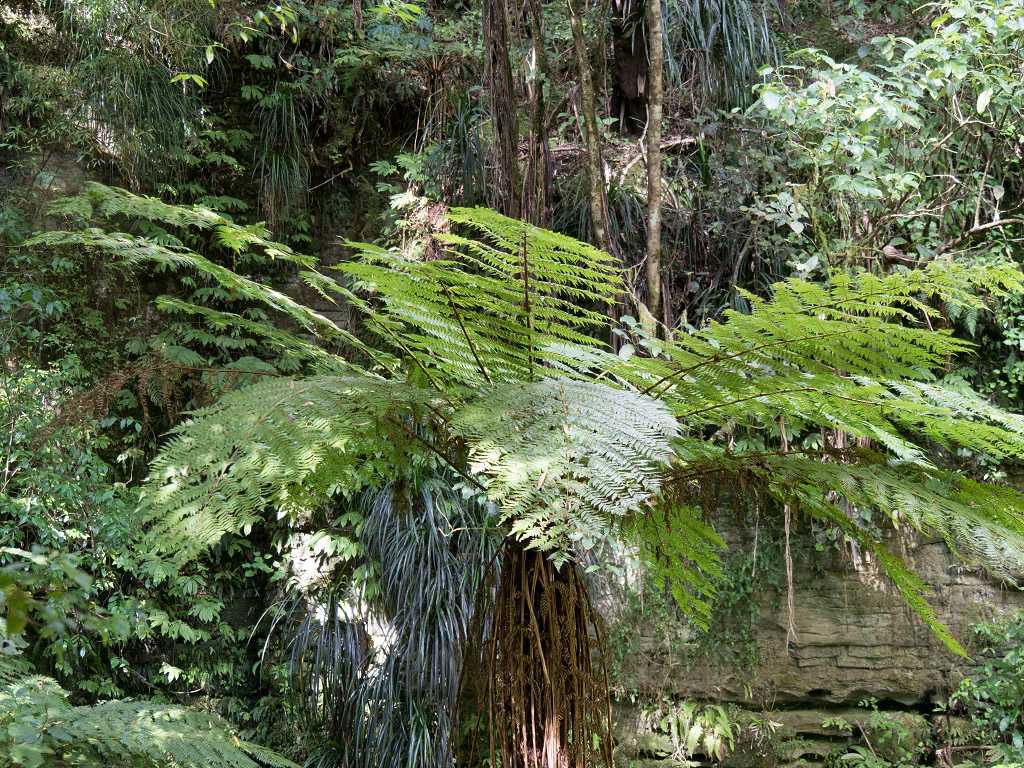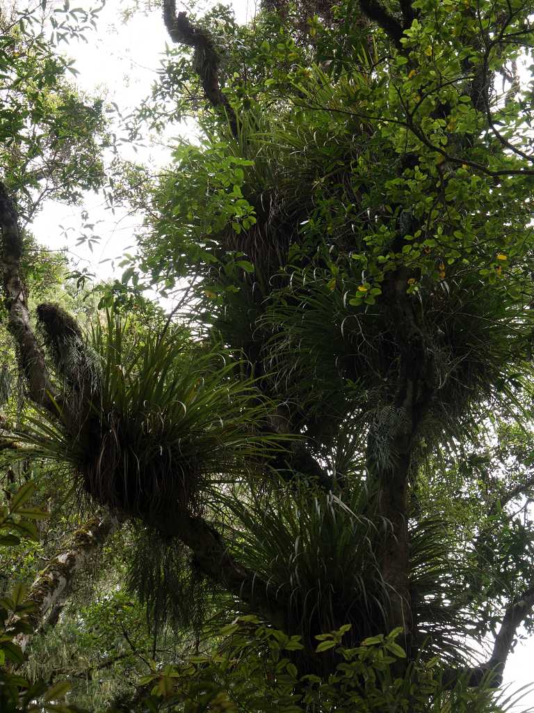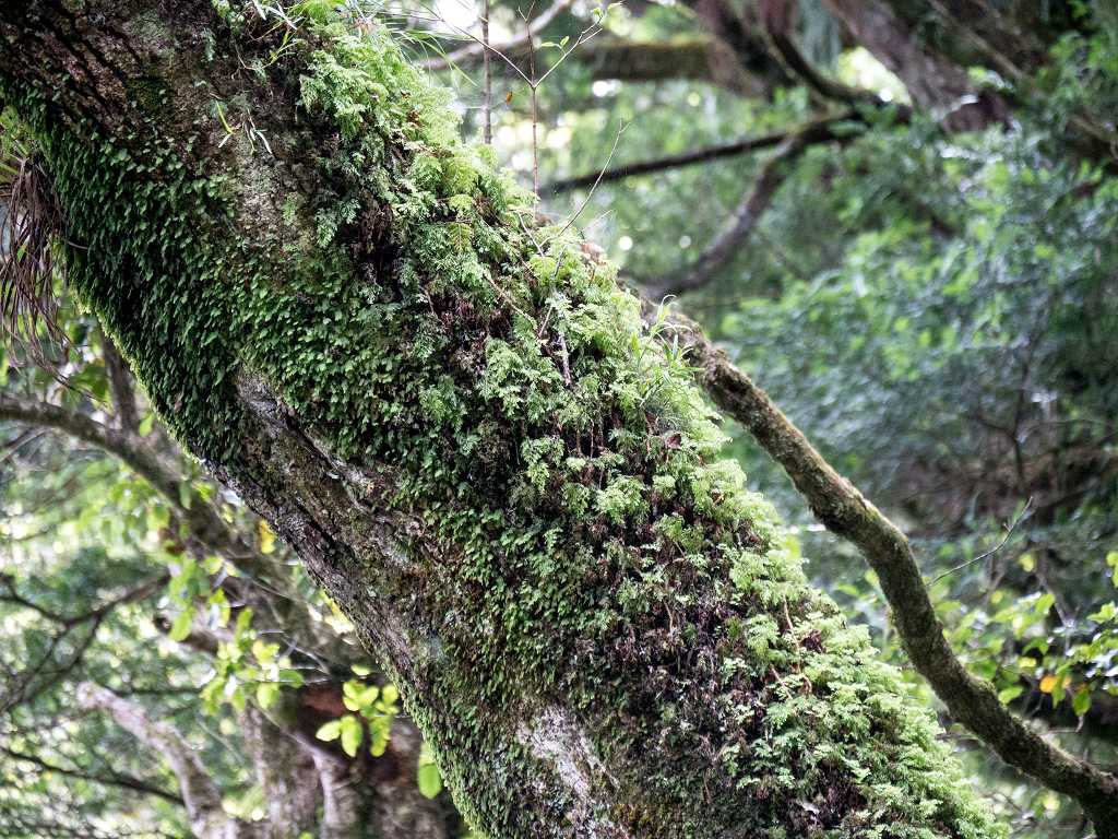 Der Weg durch dichten urwüchsischen Wald ist wieder geprägt von einem Gewirr aus Bäumen, Lianen, Farnen verschiedenster Art. Querhängende oder umgestürzte Bäume bilden die Lebensgrundlage für neues Wachstum.