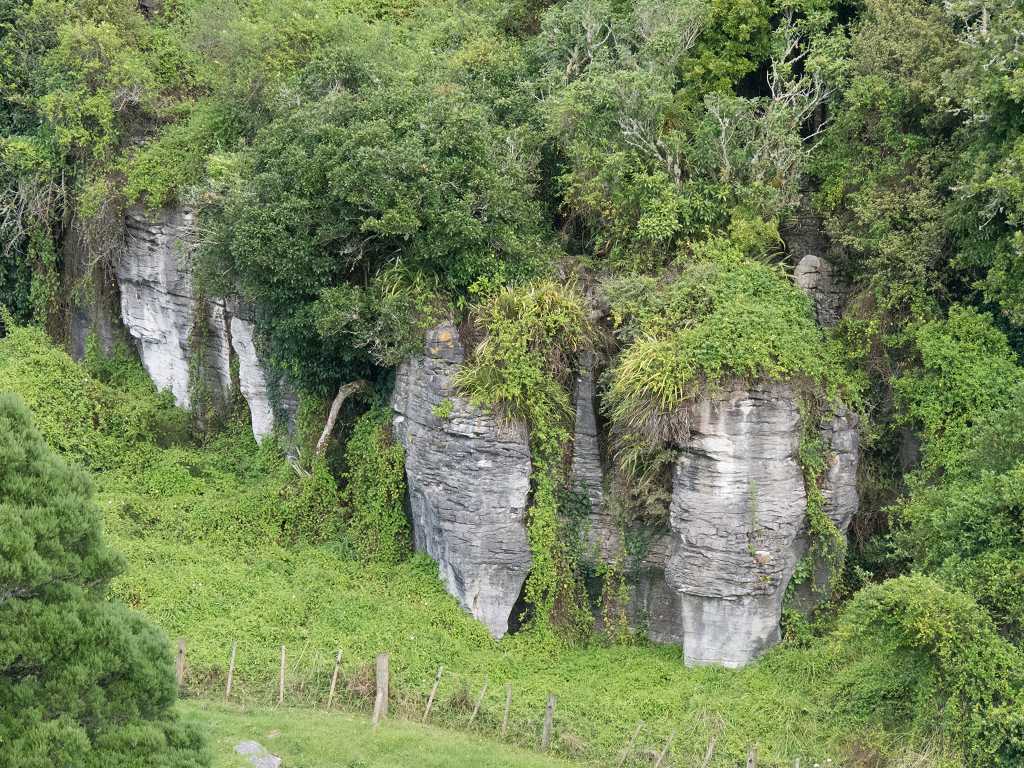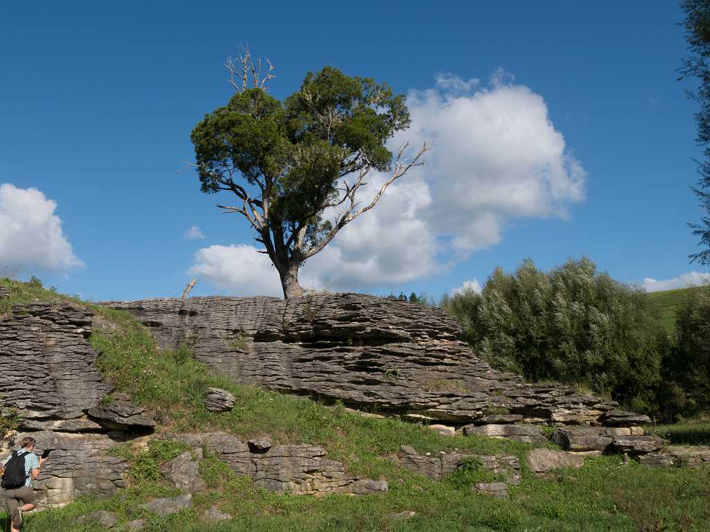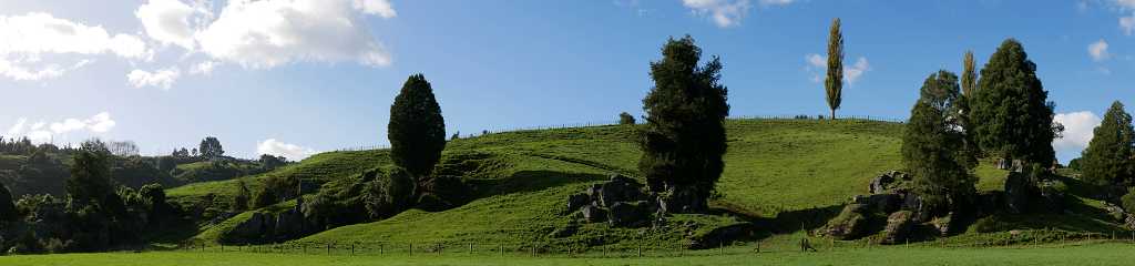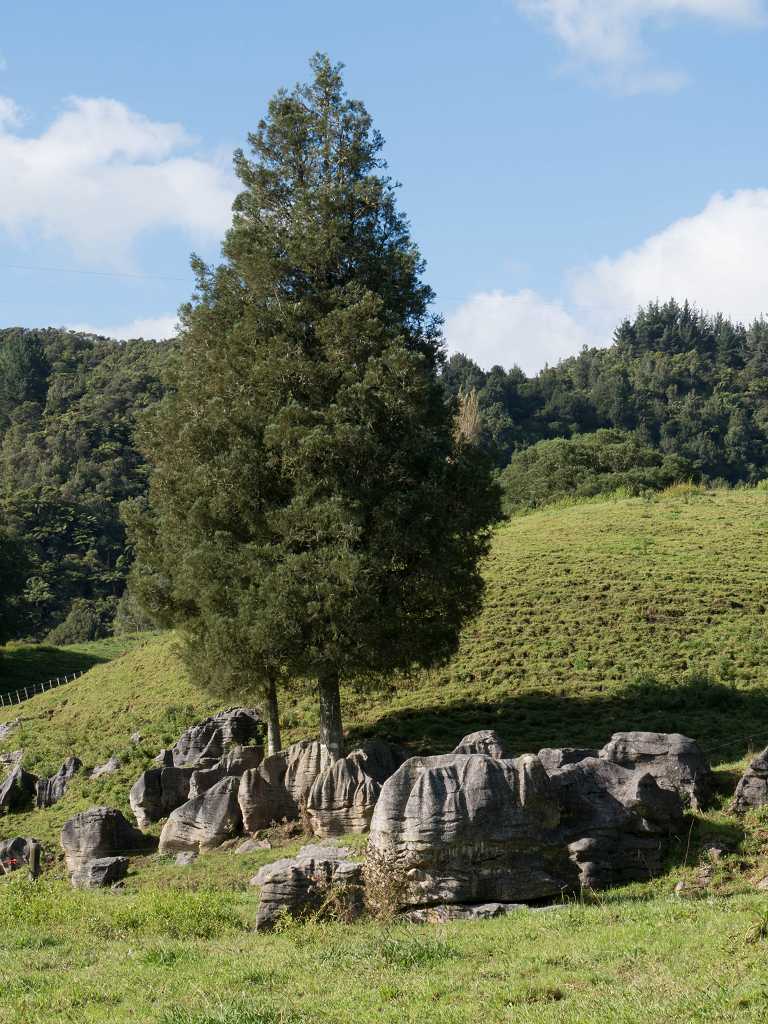 Bereits der Einstieg in den Weg beeindruckt uns mit einer wildbewachsenen Felsformationen als Flussbegrenzung. Wir laufen dem Flusslauf folgend zuerst durch dichten Natur Forest, machen einen Abstecher auf den nahen Berg, von welchem wir auf Waitomo Cave hinab sehen können und wandern anschließend durch privates Farmland mit kleinen Felsen auf den Hügeln.