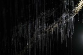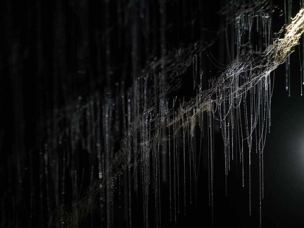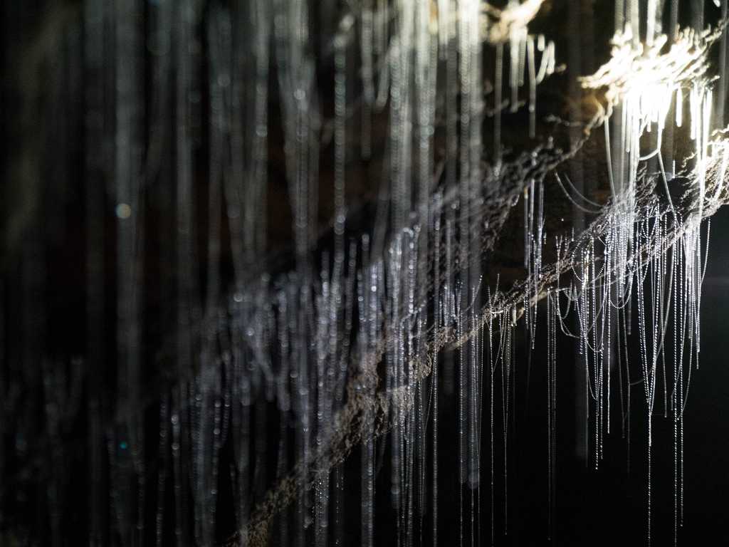 Vielmehr sind die hier zu bewundernden Lichter die Larven von Pilzmücken, die an der Decke hängen. Die Larven spinnen an der Höhlendecke ein Nest aus Seide und hängen dann bis zu 70 Seidenfäden um das Nest herab. Diese sind bis zu 30 oder 40 cm lang und mit Schleimtröpfchen besetzt. Die Larven können nur an windstillen Plätzen leben, da sich sonst ihre Fangleinen verfangen. Daher bevorzugen sie Höhlen, Felsüberhänge und tiefen Regenwald.