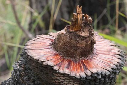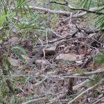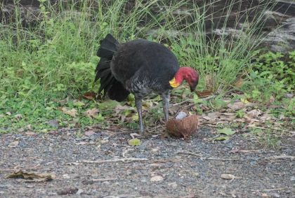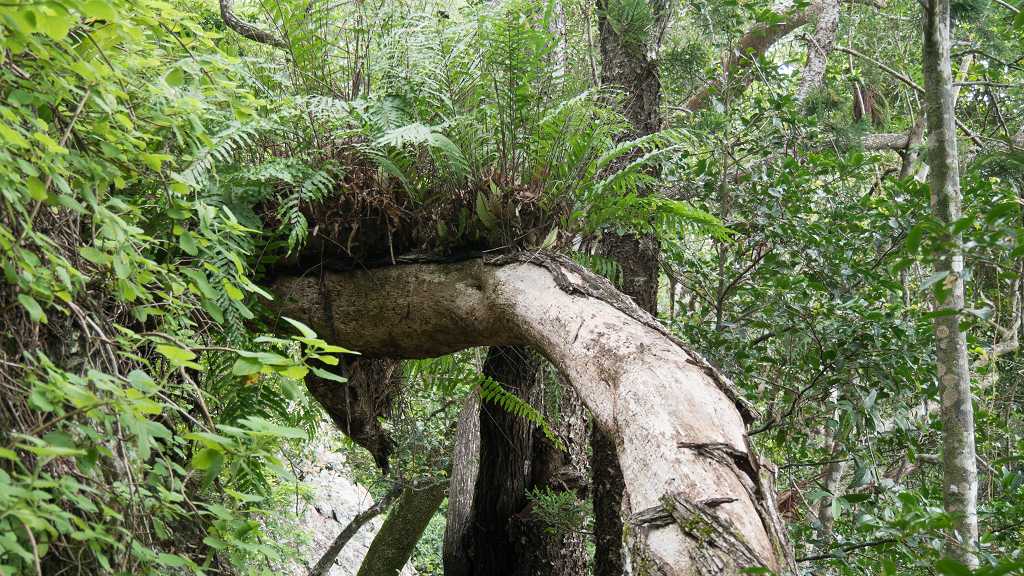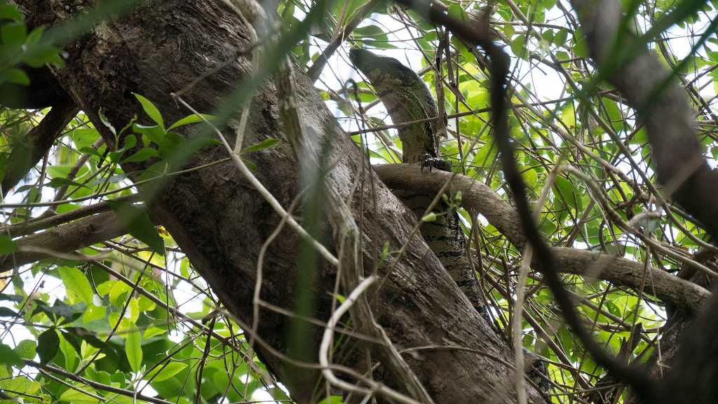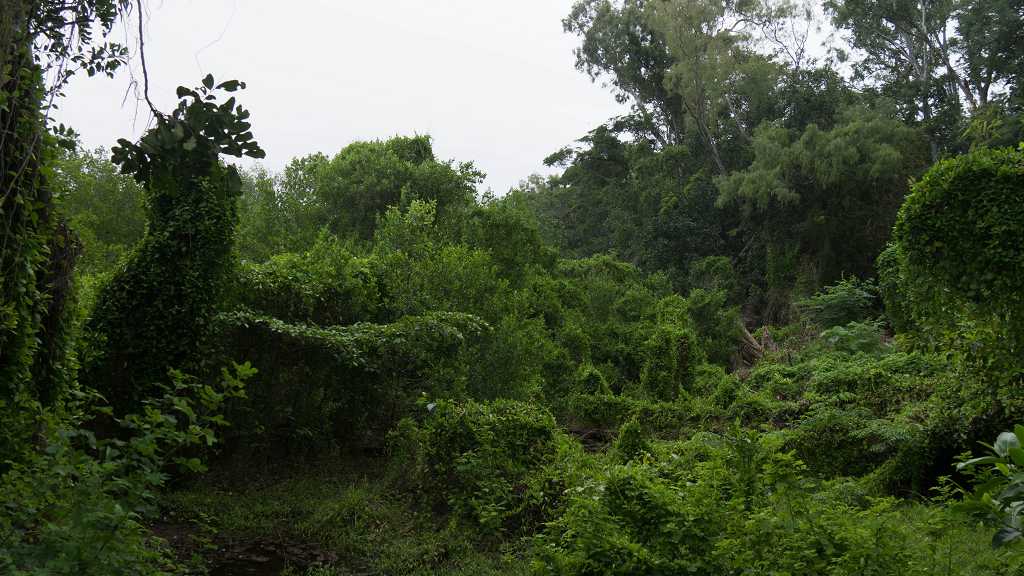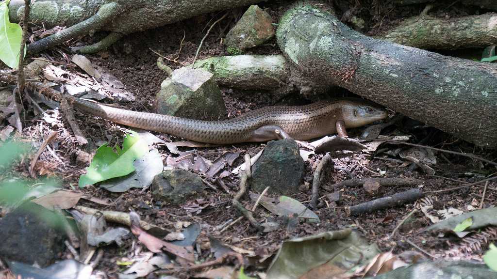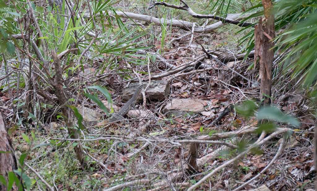 Dieser Weg ist arg verwildert, wird wohl kaum gepflegt, denn es liegen viele umgestürzte Bäume quer über den Weg. An mehreren Stellen wuchert der Busch in den Pfad hinein, so dass es uns manchmal recht unbehaglich wird, wegen der Schlangengefahr, die ja hier allgegenwärtig ist!