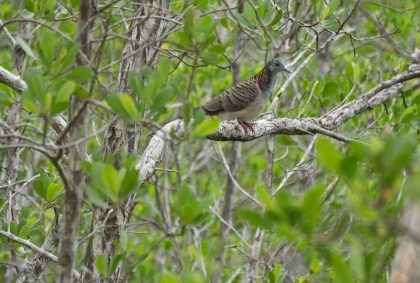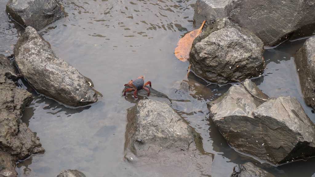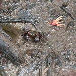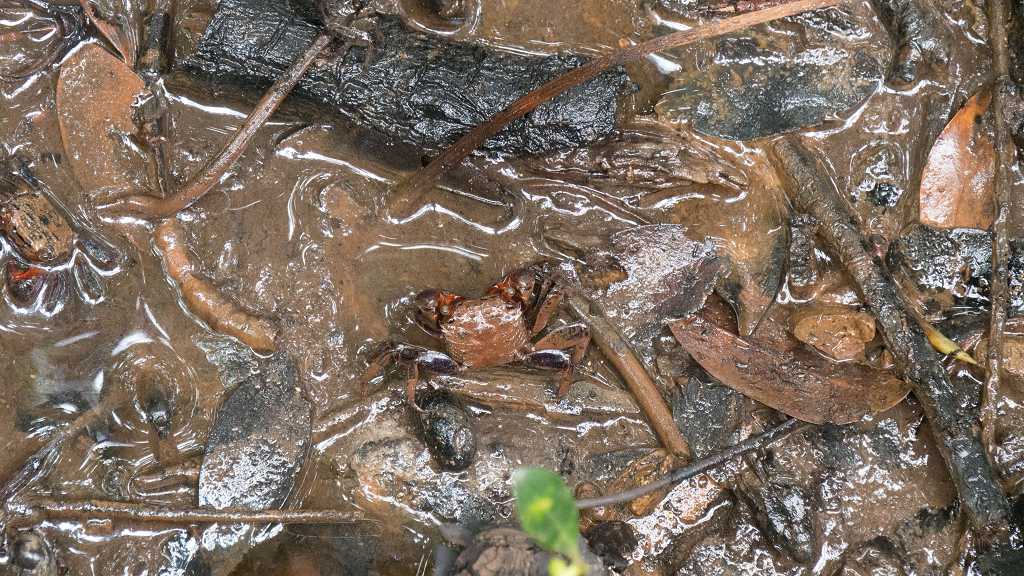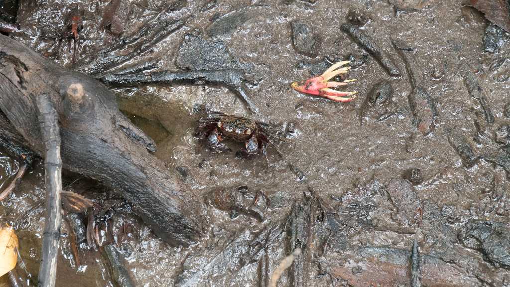 Vom Holzsteg aus können wir viele große und kleine Krabben mit roten Scheren beobachten, wie sie blitzschnell in ihre Löcher im Wattboden verschwinden, sobald sie uns wahrnehmen.
