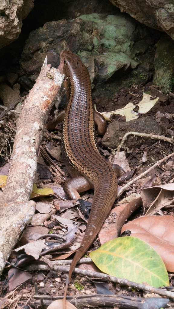 Der Pfad ist abwechslungsreich, mit einigen Höhlen und sehenswerten küstennahen Wegpassagen. Wir sehen einige Skinke und eine ziemlich große Spinne, die ihr Netz in luftiger Höhe von einem Busch zum nächsten Zweig gesponnen hat.