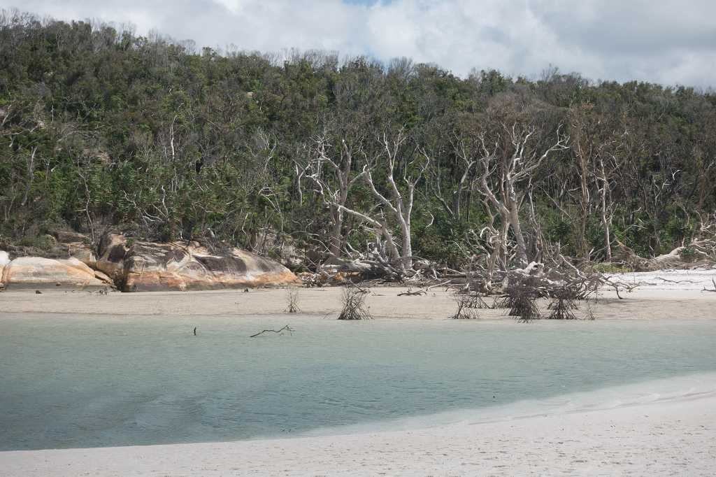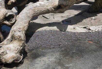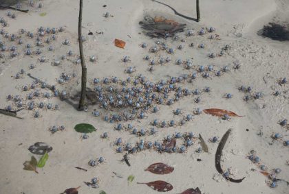 Gleich rechts vom Strandzugang hat sich eine riesige „Pfütze“ gebildet, in welcher etliche abgestorbene Bäume mit ihrem silberfarbenen Holz ein eigenes Biotop bilden. Ich werde von diesem Anblick wie magisch angezogen und mache bei genauerem Hinsehen eine unglaubliche Entdeckung! Tausende Krebse bilden einen blauen Teppich und setzen sich in Bewegung wenn man sich ihnen nähert.