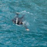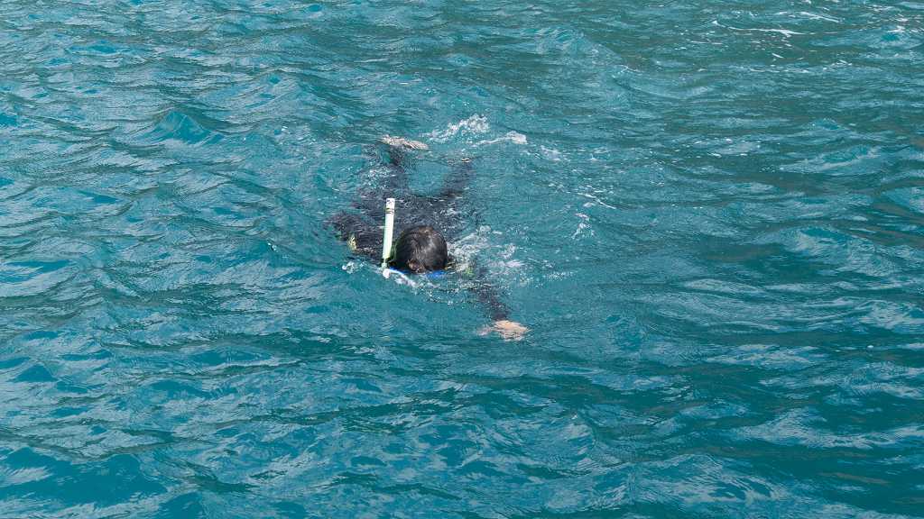 Inzwischen sind die Wellen gefühlt noch höher als vorhin, wir düsen zur „Peters Bay“ und machen uns für den ersten Schnorcheltripp fertig. Bereits gleich am Schiff sind einige Fische zu sehen. Die Stelle um zwei Korallenfelder ist bekannt dafür, dass hier eher etwas größere Fische zu beobachten sind, weniger die kleinen.