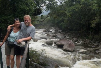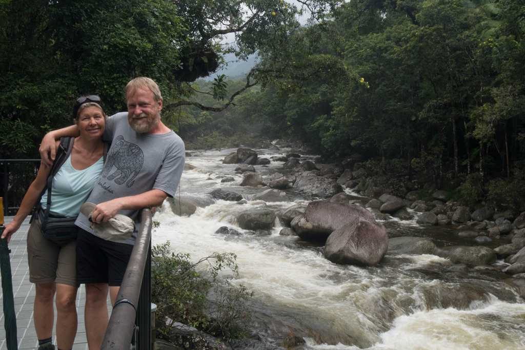 Gegen Mittag gibt es ein Lunchbuffet in freier Natur, ganz in der Nähe einer Badeplattform, die in den Daintree River hinunter führt. Ja tatsächlich, hier wäre ein Bad im Süßwasserfluss noch möglich, 500 m flussabwärts dann nicht mehr, denn bis dahin reicht der Lebensraum der Salties, der Salzwasserkrokodile!