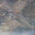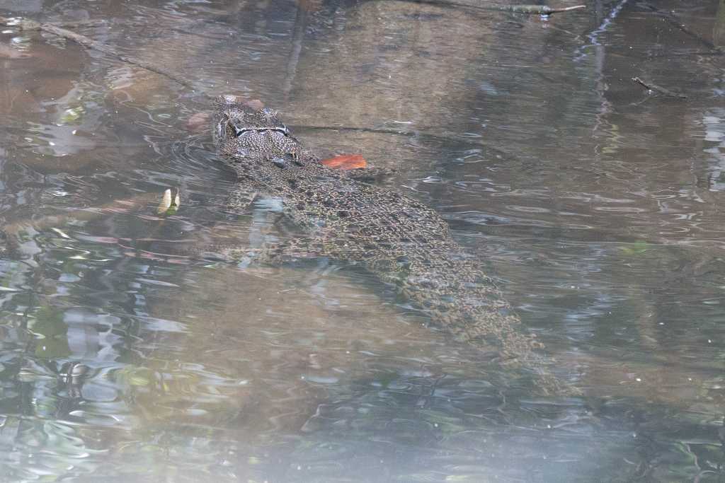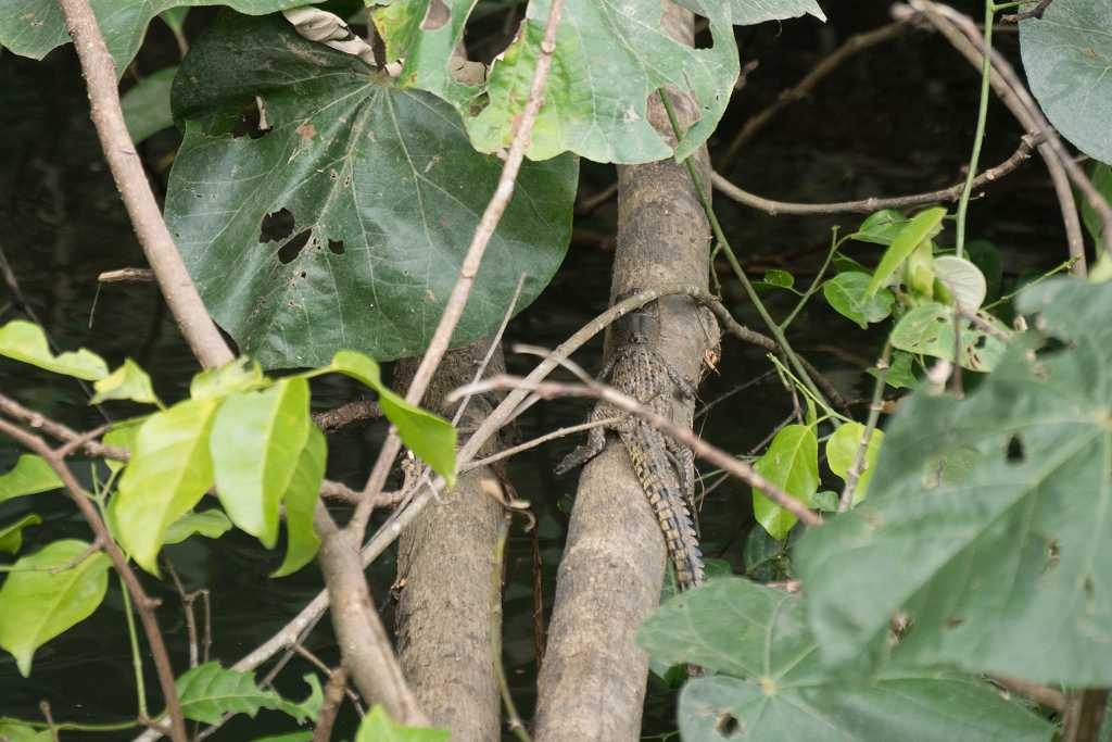 Trotzdem noch groß genug, um endlich mal eins zu entdecken, oder? Das erste Tier dieser Art, das wir auf dieser Tour sehen ist tatsächlich nur 30 cm lang, ein Junges. Es sonnt sich auf einen aus dem Wasser heraus ragenden Baumstamm. Niemals hätten wir es ohne unseren Guide entdeckt!