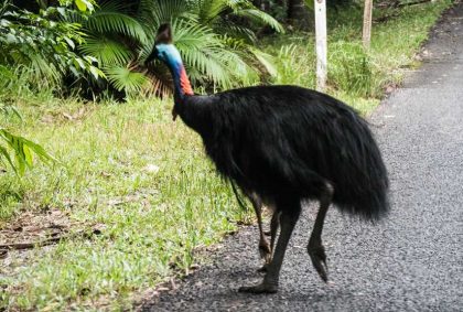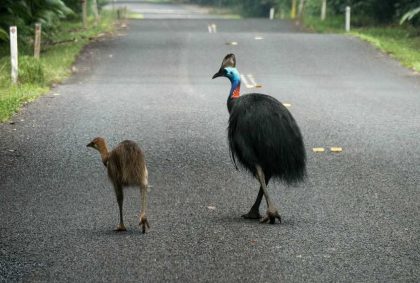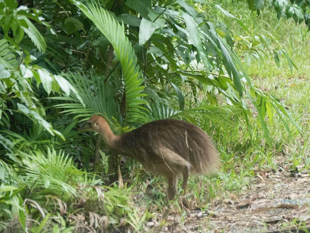 Wir können unser Glück kaum fassen, dass wir nun doch noch diese selten Vögel zu Gesicht bekommen! Es sind jeweils ein junger Cassawary mit seinem Vater, denn die männlichen Tiere kümmern sich ausschließlich um die Brut und Aufzucht des Nachwuchses.