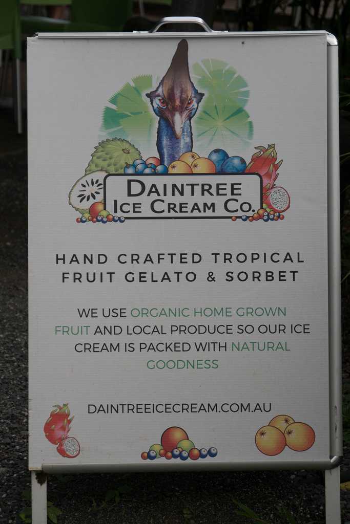 Unser letzter Programmpunkt ist ein Stopp bei „The Daintree Ice Cream Company“. Nach einer alten Familientradition wird hier ein ganz besonderes Speiseeis hergestellt und an die Gäste verkauft. Gleich nebenan wachsen die Bananen- und Mangobäume, an denen die Früchte für die Eisherstellung wachsen. Eine Portion enthält 5 kleine Eiskugeln der Sorten: Mango, Schokolade, Kaffee, Banane und Vanille und hat einen fairen Preis von 7,50 AUD.
