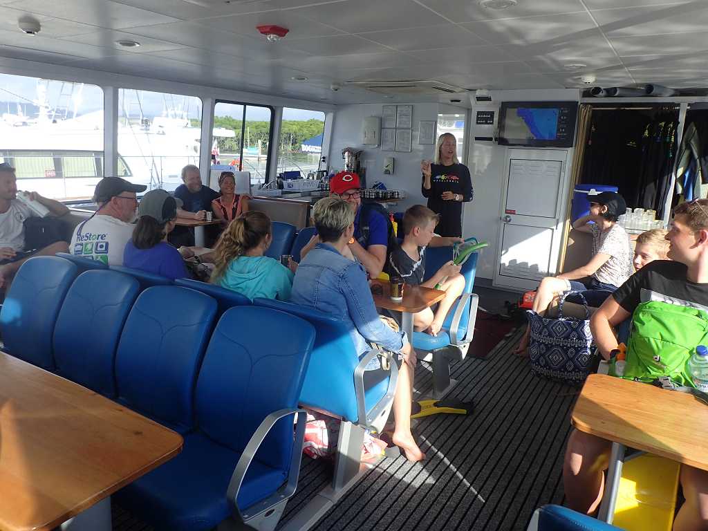 Während der Fahrt zum ersten Schnorchelplatz im Great Barriere Reef zeigt uns die junge Guide mit Begeisterung auf einem Plakat die Meerestiere, die wir vermutlich heute zu sehen bekommen werden.