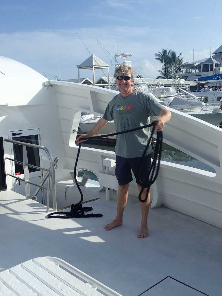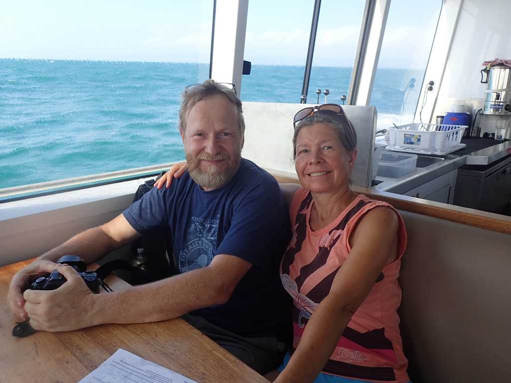 Das Schiff „Wavelength“ ist ein hochseetauglicher Katamaran, die Crowe arbeitet professionell und sehr freundlich. Zuerst bekommen wir unsere Ausrüstung und werden beim Anprobieren bestens beraten. Auch Sonnenschutz und Reisetabletten gegen Übelkeit werden angeboten.