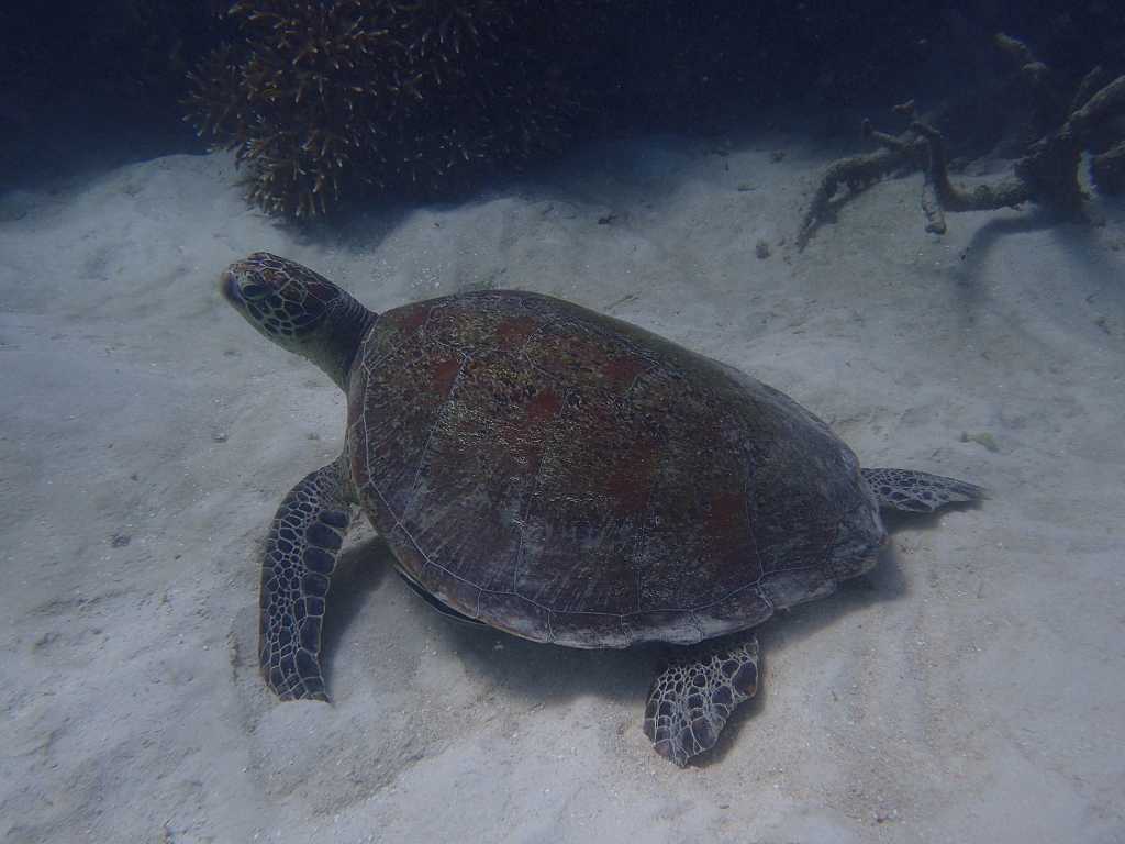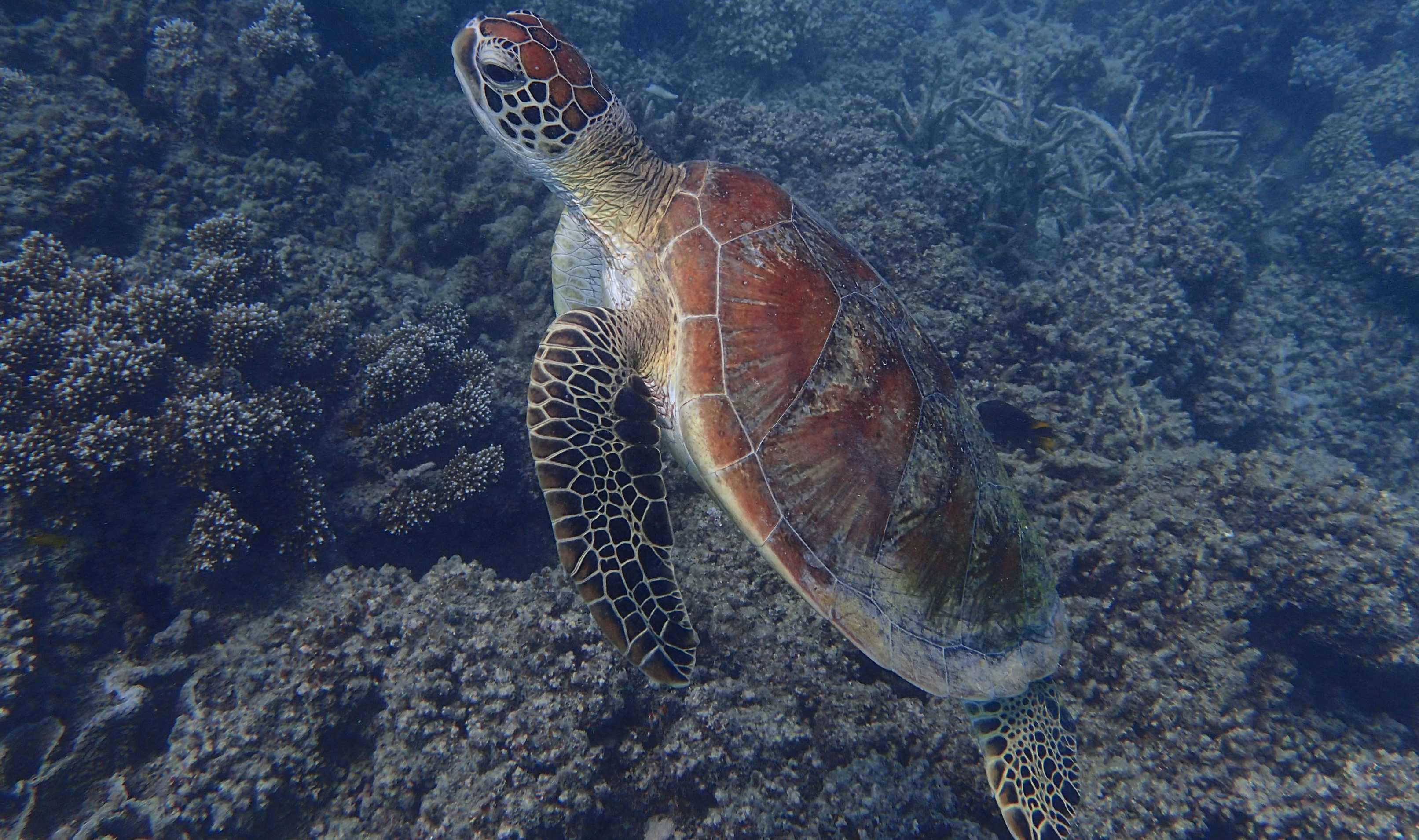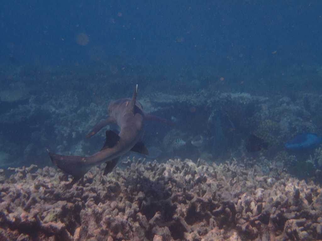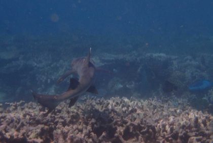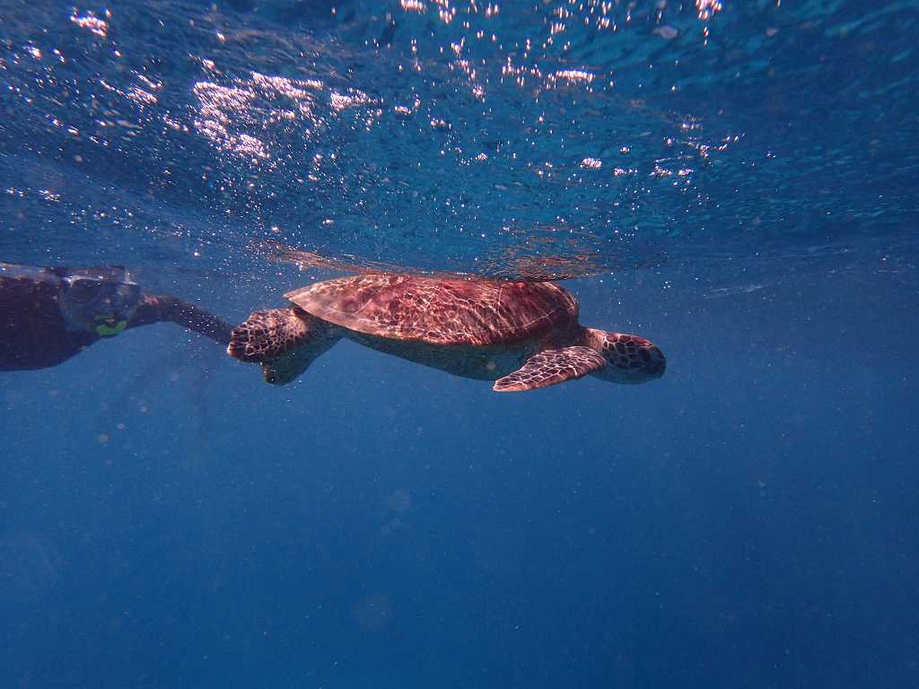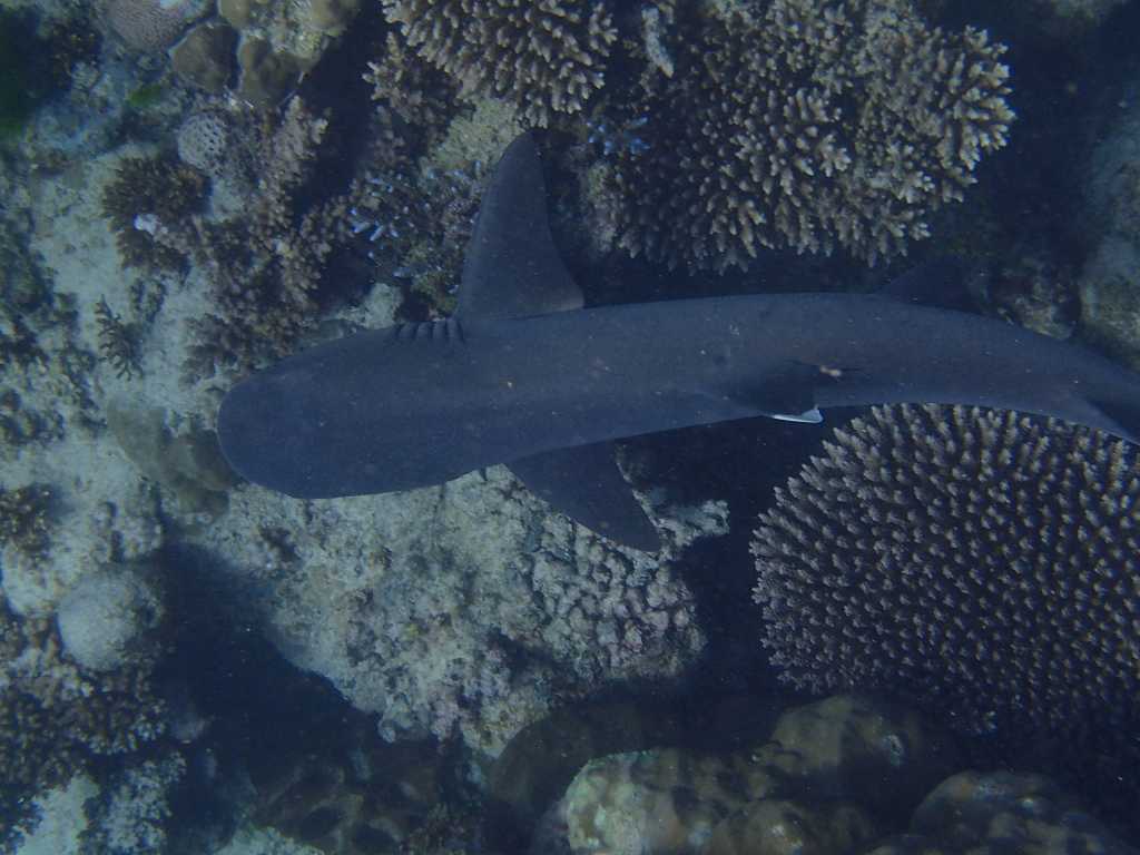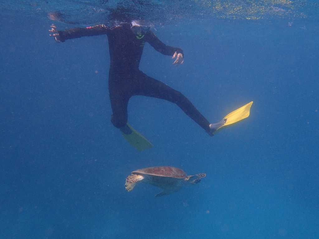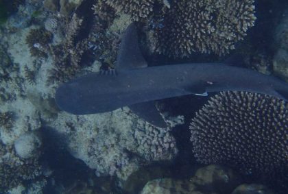 In zwei kleinen Gruppen, jeweils mit einer Guide gehen wir ins Wasser und sind überwältigt von der Welt, die sich uns hier eröffnet! Gleich zu Beginn finden wir eine Meeresschildkröte und können sie lange beobachten, außerdem einen kleinen Hai, der an einer etwas tieferen, sandigen Stelle in einen engeren Unterwassercanyon hinein schwimmt.