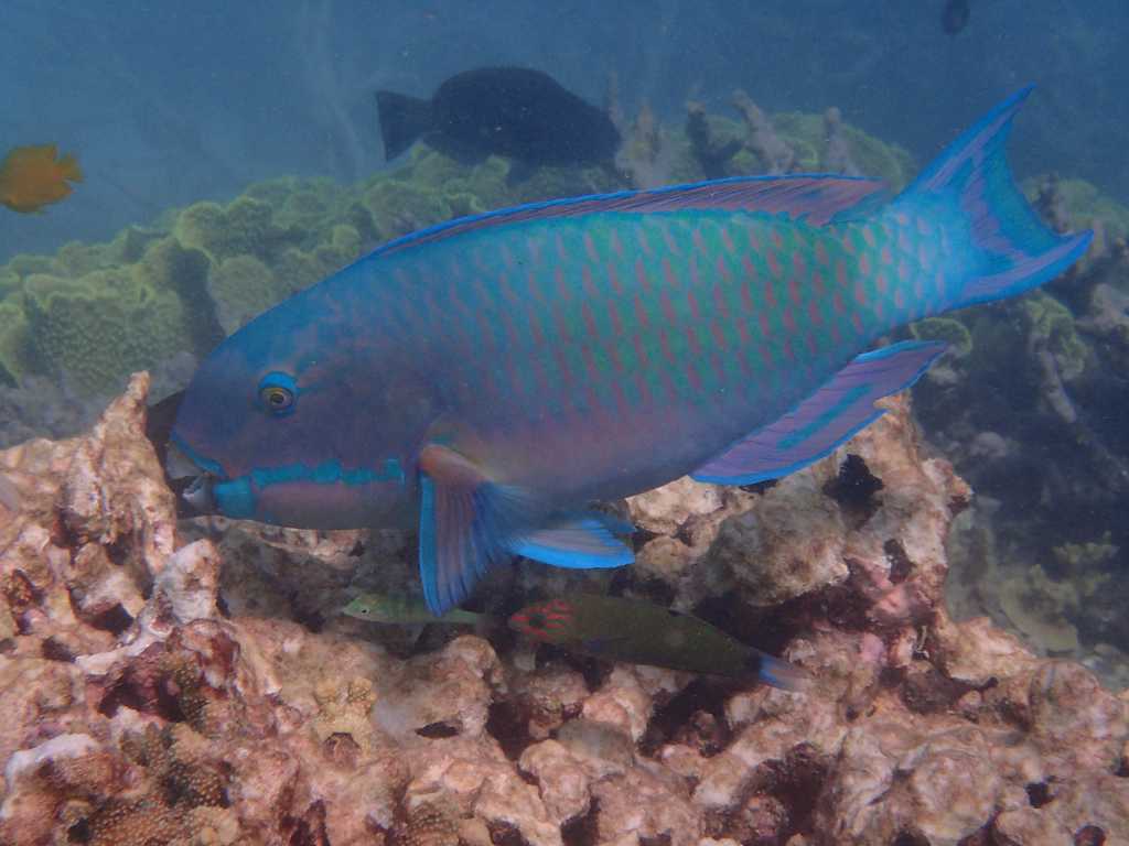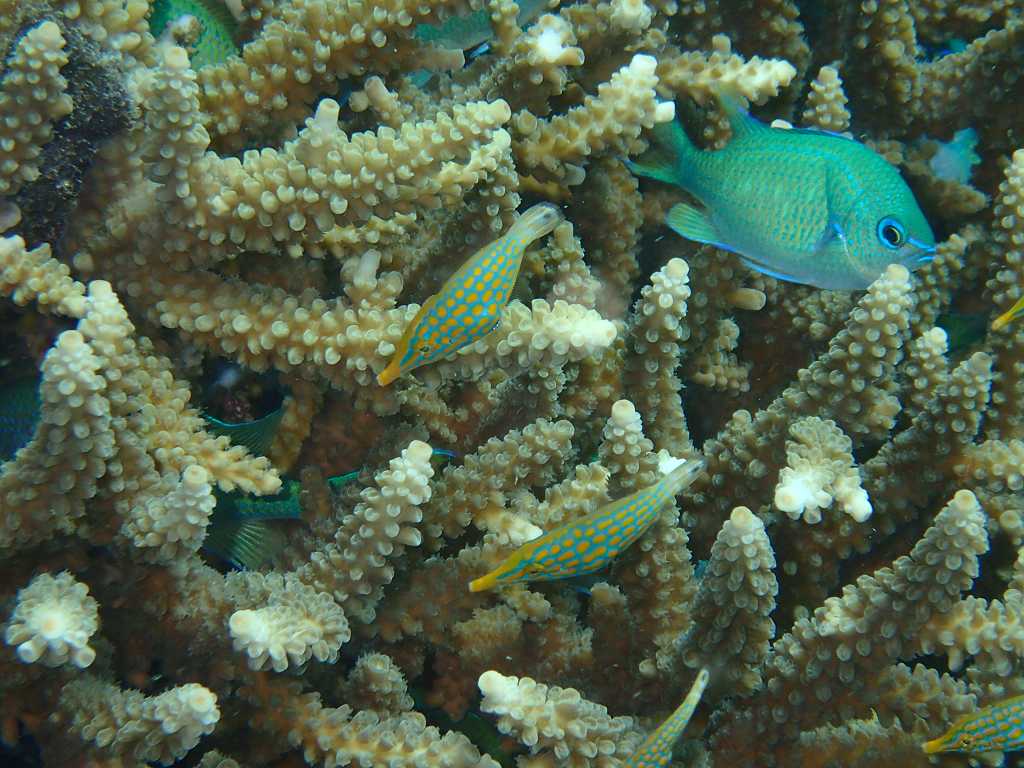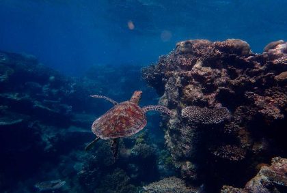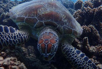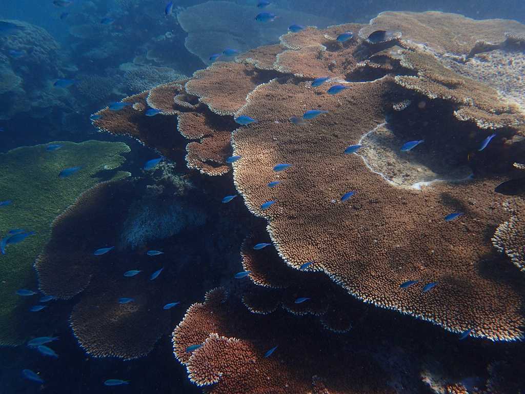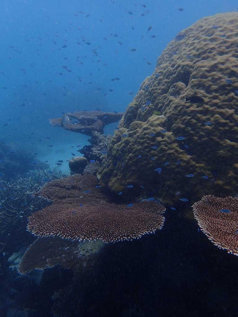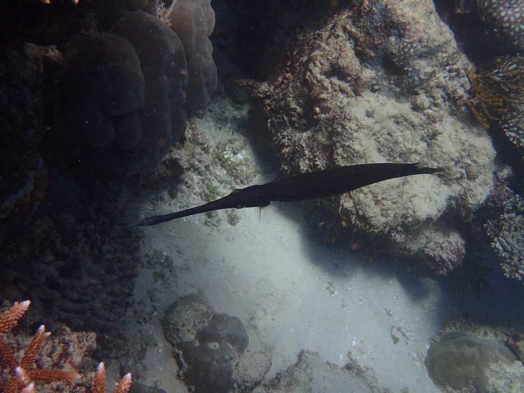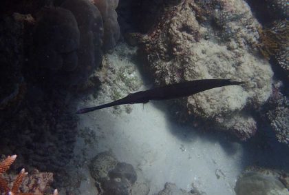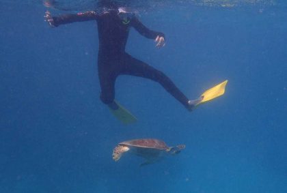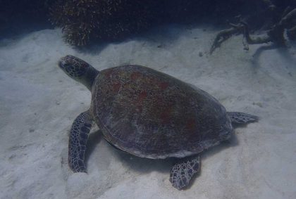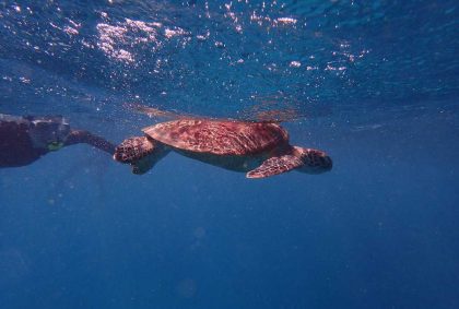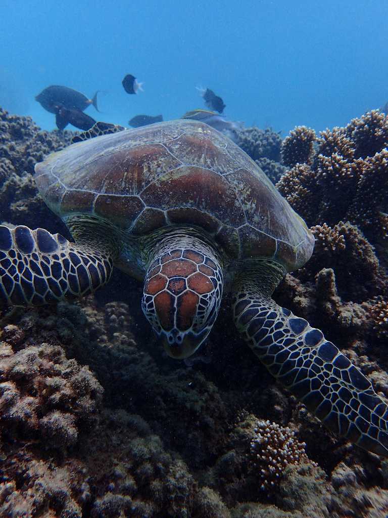 In zwei kleinen Gruppen, jeweils mit einer Guide gehen wir ins Wasser und sind überwältigt von der Welt, die sich uns hier eröffnet! Gleich zu Beginn finden wir eine Meeresschildkröte und können sie lange beobachten, außerdem einen kleinen Hai, der an einer etwas tieferen, sandigen Stelle in einen engeren Unterwassercanyon hinein schwimmt.
