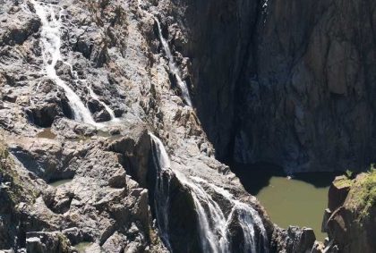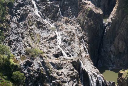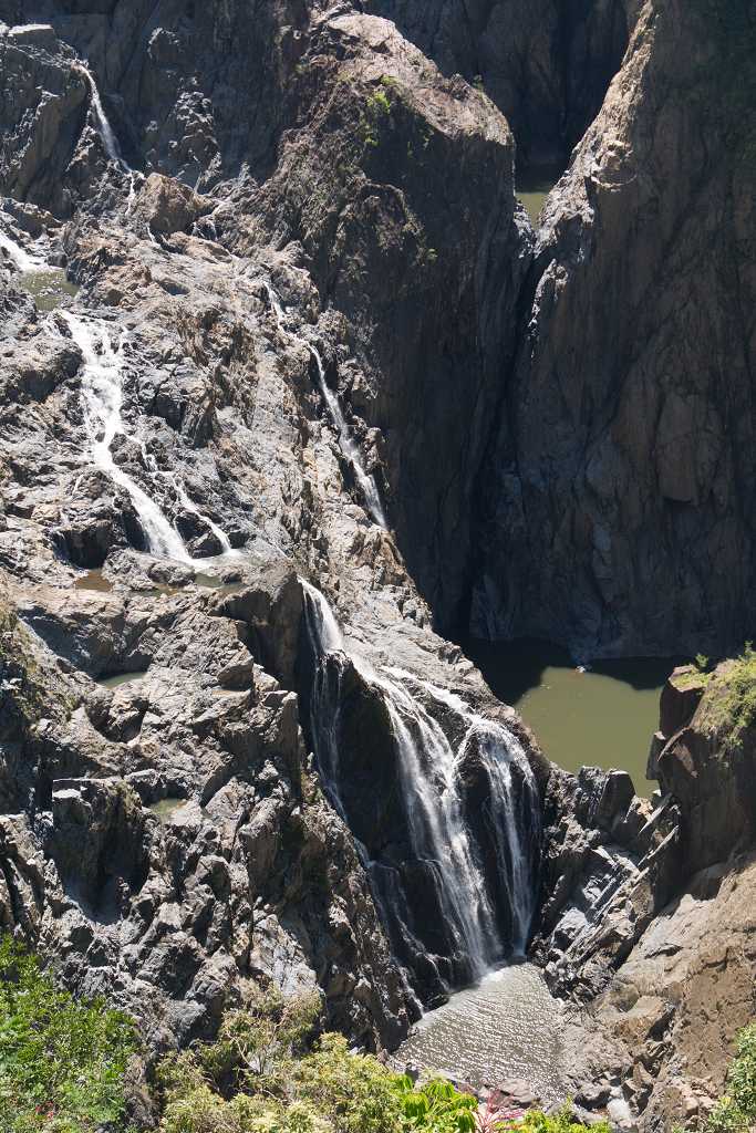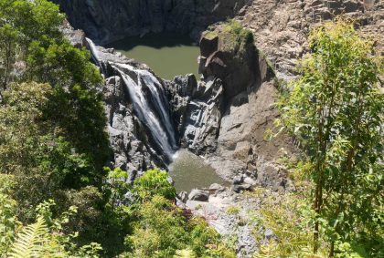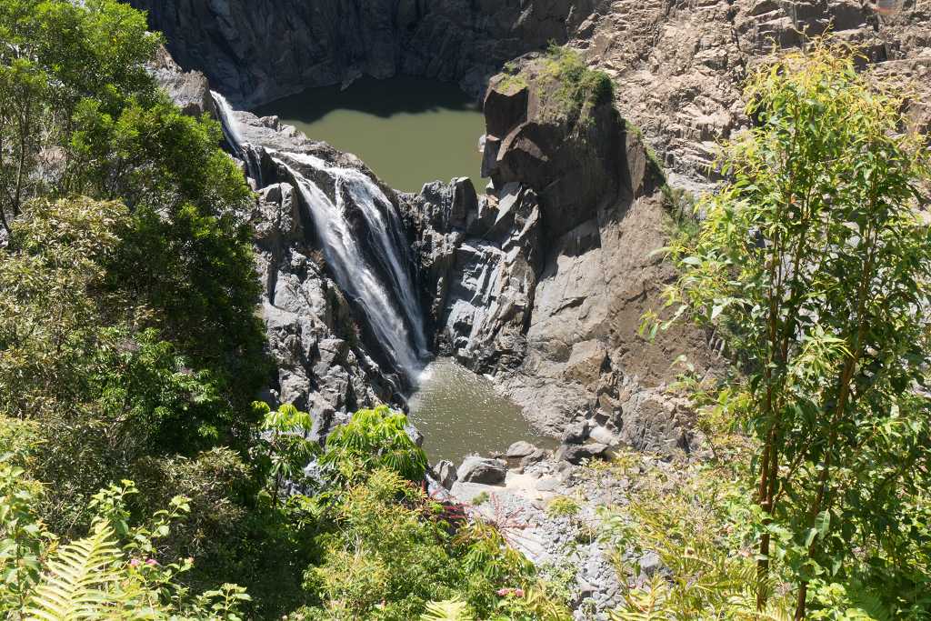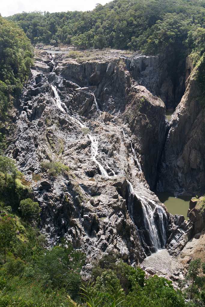 An der Railway Plattform eröffnet sich eine beeindruckende Aussicht auf die Barron Falls. Das Tal des Barron Rivers wird hier breit und das Wasser bahnt sich über schroffe Felswände in schmalen Kaskaden seinen Weg in die Tiefe. Dabei bildet es zwei größere natürliche Wasserbecken. Leider sind sie unzugänglich und oberhalb des Wasserfalls lauern Krokodile… Also verkneifen wir uns das erfrischende Bad und fahren weiter nach Cairns.