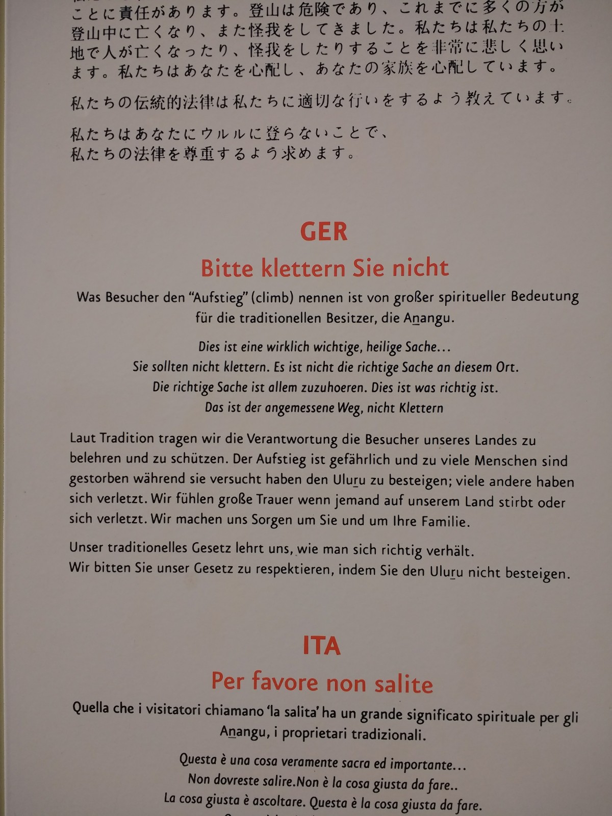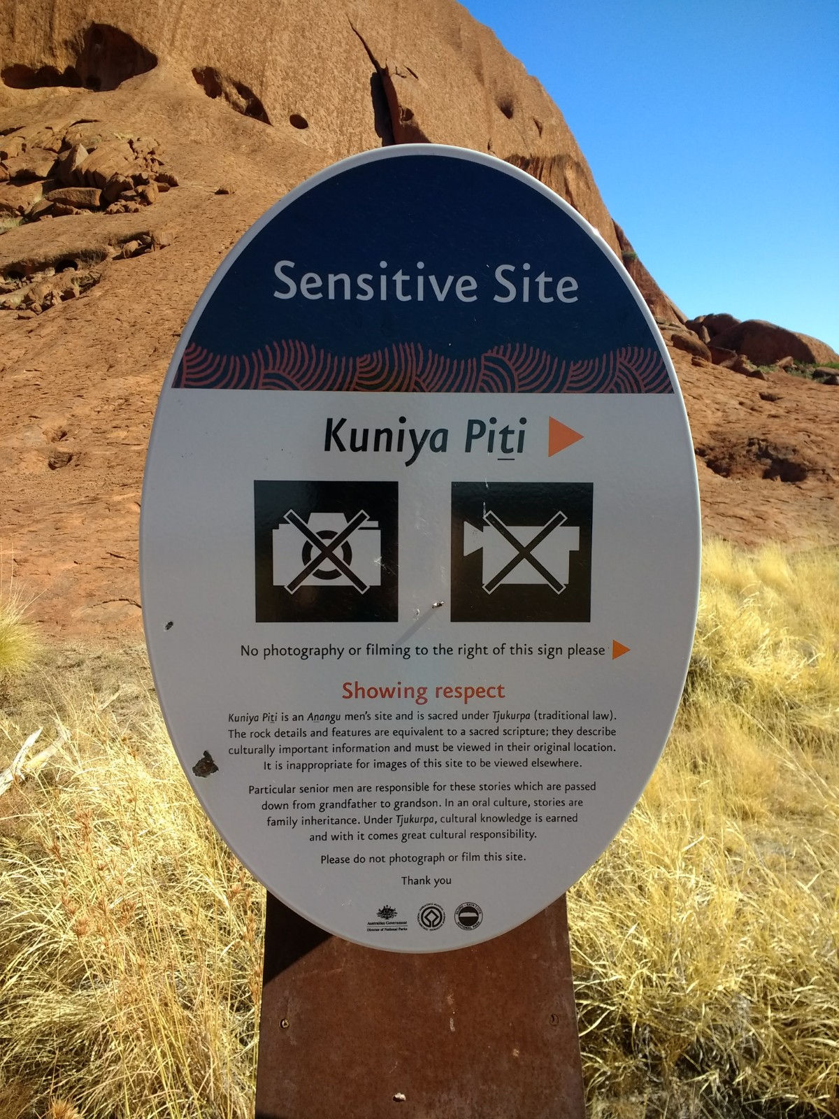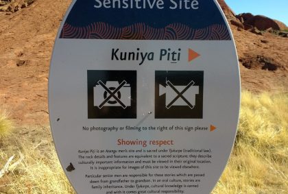 Da der Uluru den Ureinwohnern Australiens heilig ist, gibt es immer mal wieder Abschnitte, an denen fotografieren und filmen verboten ist. Es handelt sich dabei um kulturell sensible Orte und wir respektieren natürlich diese Einschränkung.