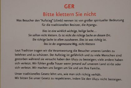 Vor dem Hintergrund, dass es sich bei diesem Berg um ein Heiligtum der Aborigines Menschen handelt, sollte jeder den nötigen Respekt aufbringen und sein eigenes Ego zurück nehmen!