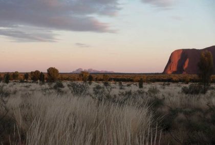 Von Minute zu Minute wechseln jetzt Farbe und Schattierungen des Uluru, von glühendem Rot über Violett, Rosa bis zu Orange und dunklem Rotbraun. Es ist einfach unbeschreiblich schön anzusehen und sehr ergreifend!