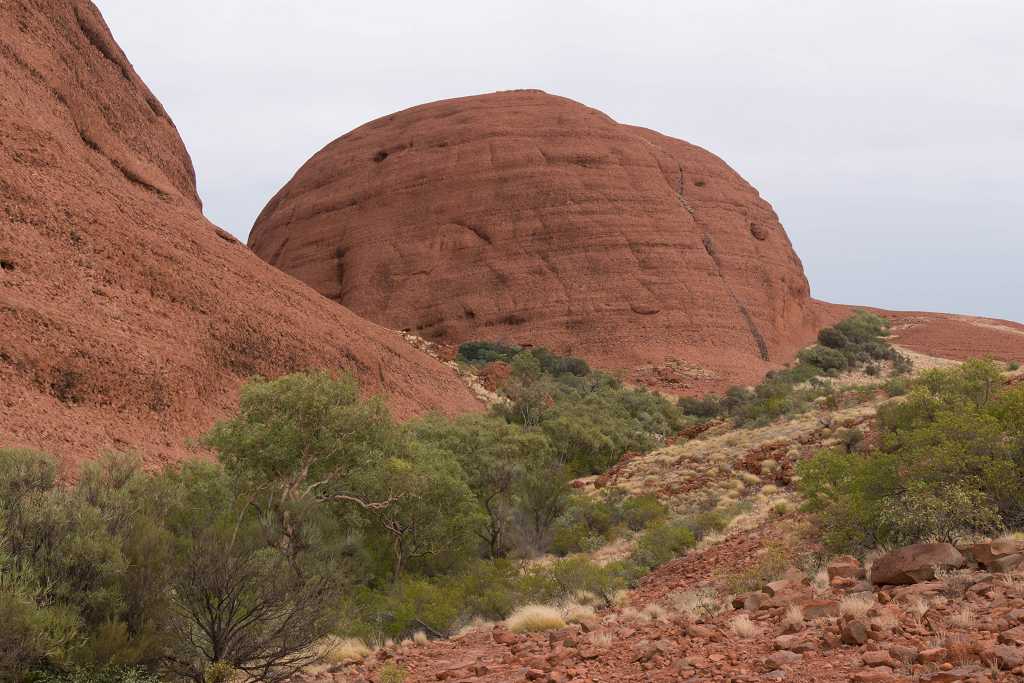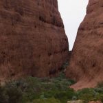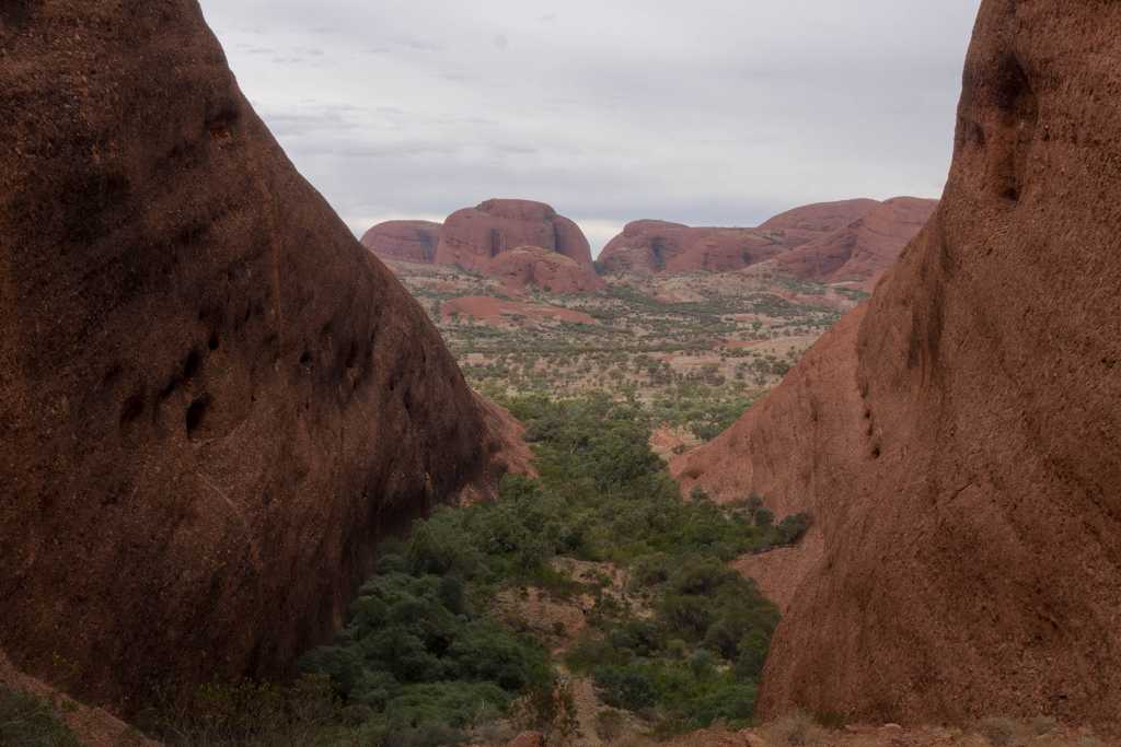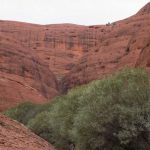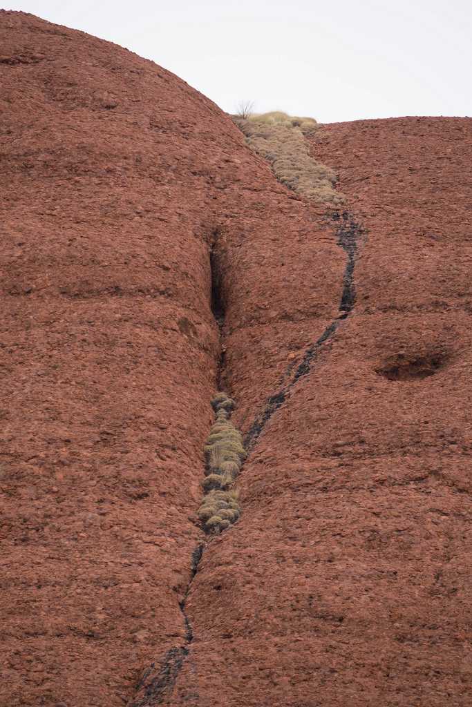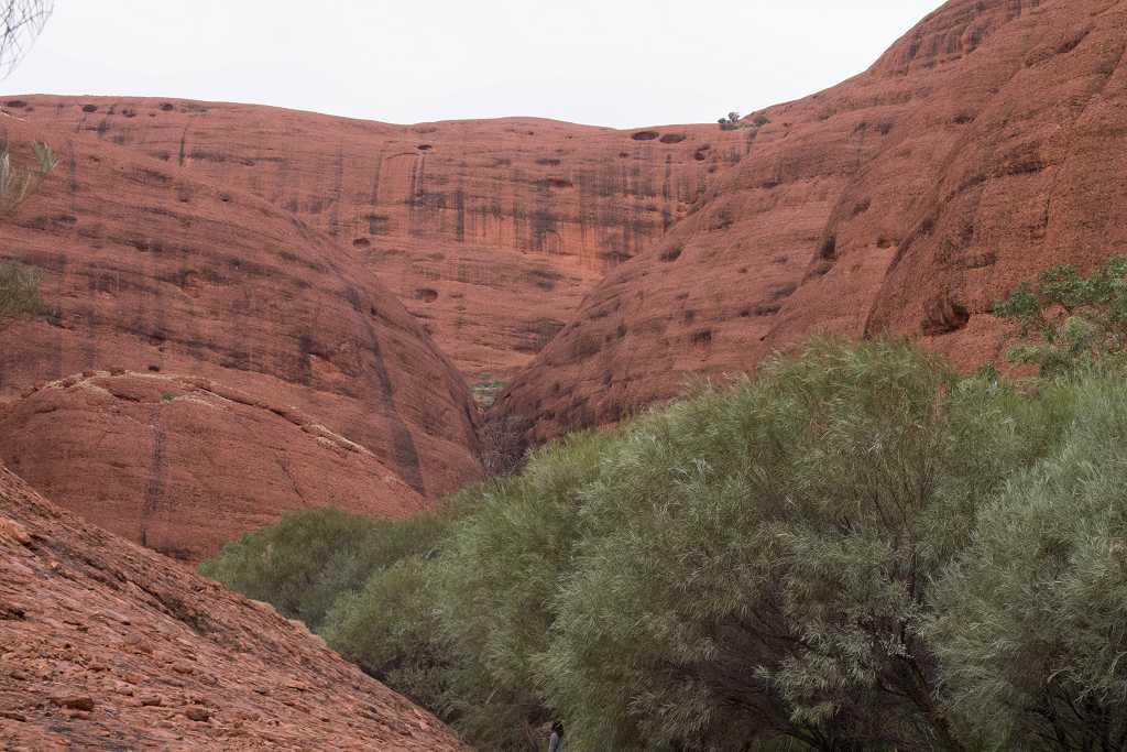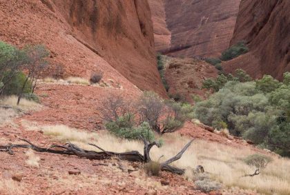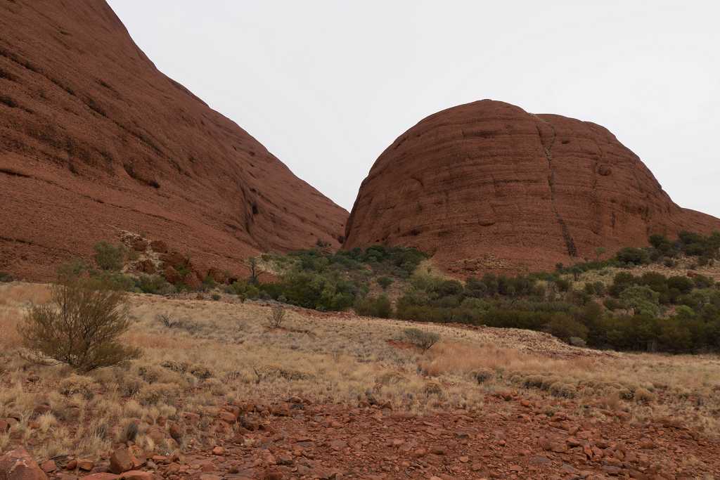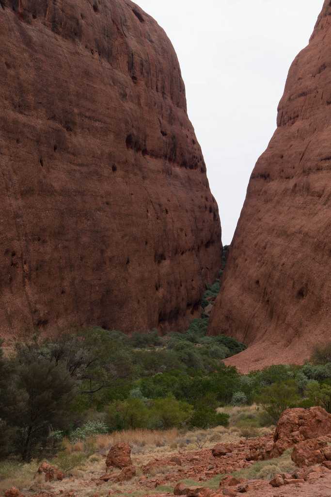 Ganz in der Nähe befindet sich auch die Walpa Gorge. Ein kurzer Pfad führt zwischen den beiden steil aufragenden Felswänden zweier Kuppelberge, die ebenfalls zu den Olgas gehören, bis zum Wasserloch. Es ist erstaunlich, wie einige Pflanzen im ausgetrockneten Flussbett immer noch genügend Wasser zu finden scheinen, um hier zu gedeihen!