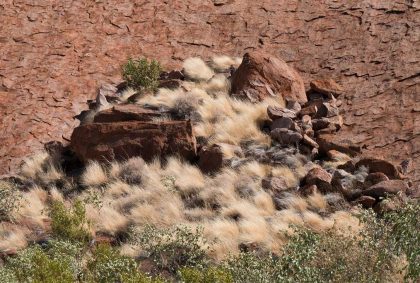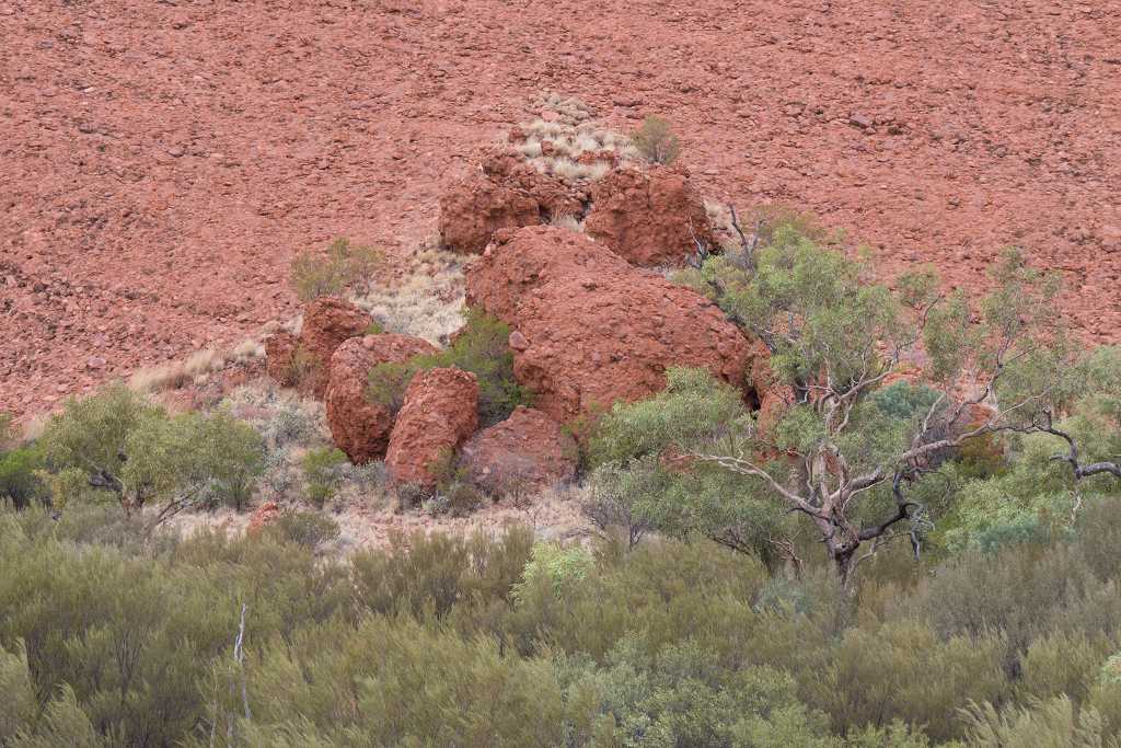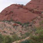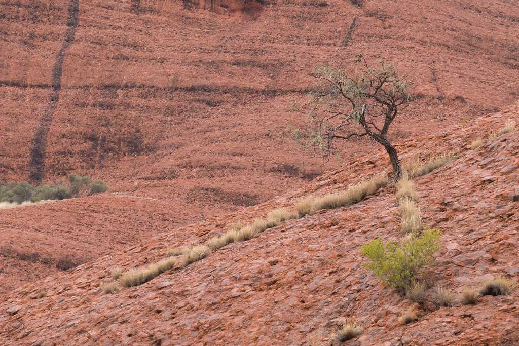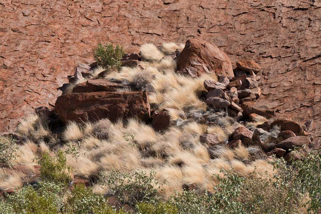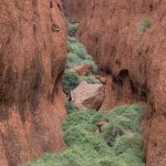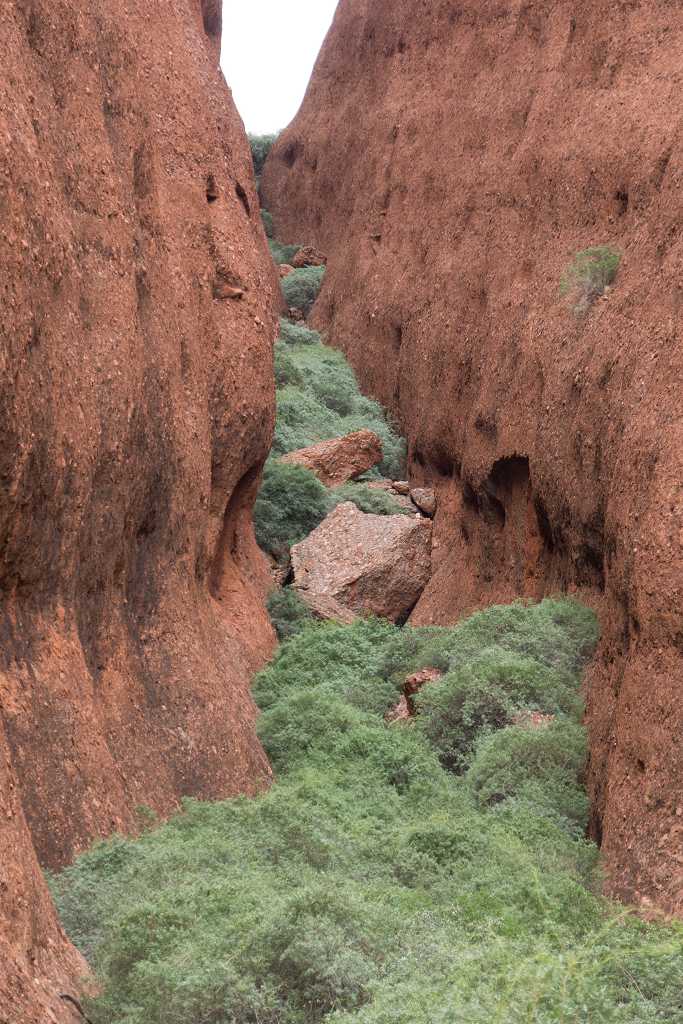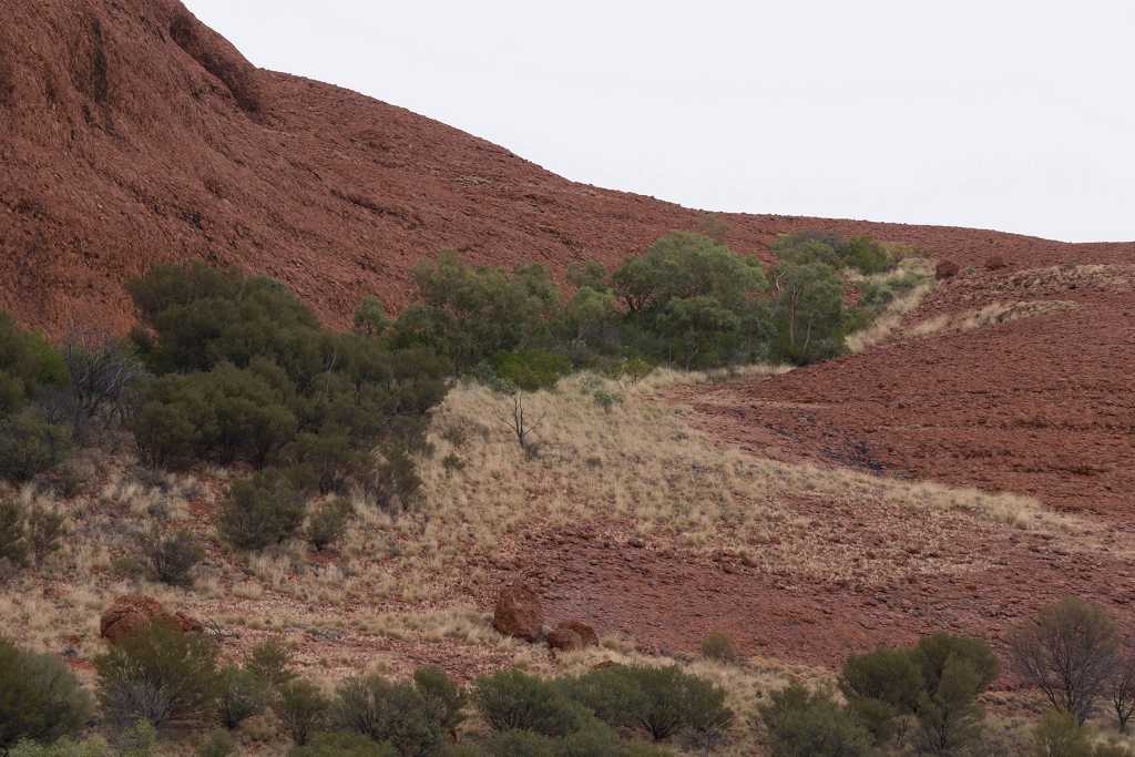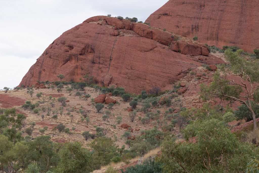 Ganz in der Nähe befindet sich auch die Walpa Gorge. Ein kurzer Pfad führt zwischen den beiden steil aufragenden Felswänden zweier Kuppelberge, die ebenfalls zu den Olgas gehören, bis zum Wasserloch. Es ist erstaunlich, wie einige Pflanzen im ausgetrockneten Flussbett immer noch genügend Wasser zu finden scheinen, um hier zu gedeihen!