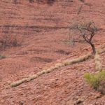 Hier oben haben wir einen Wahnsinns-Ausblick auf die Olgas und die trockene Wüstenebene, aus der sie herausragen. Dann geht es hinunter in die Ebene der Wüste. Hier wächst neben dem Spinex kaum noch etwas, einzelne Eucalyptusbäume trotzen der Glut.