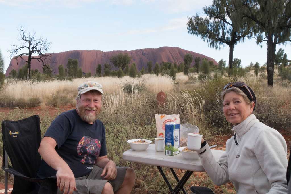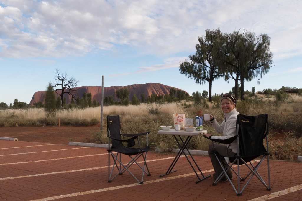 Anschließend folgt unser ganz persönliches Frühstück am Uluru. Da wir den CamperVan dabei haben, können wir uns den Morgenkaffee ganz frisch aufbrühen und frühstücken im Anblick des magischen Berges. Ein unvergessliches Erlebnis, fast ein bisschen unfassbar.